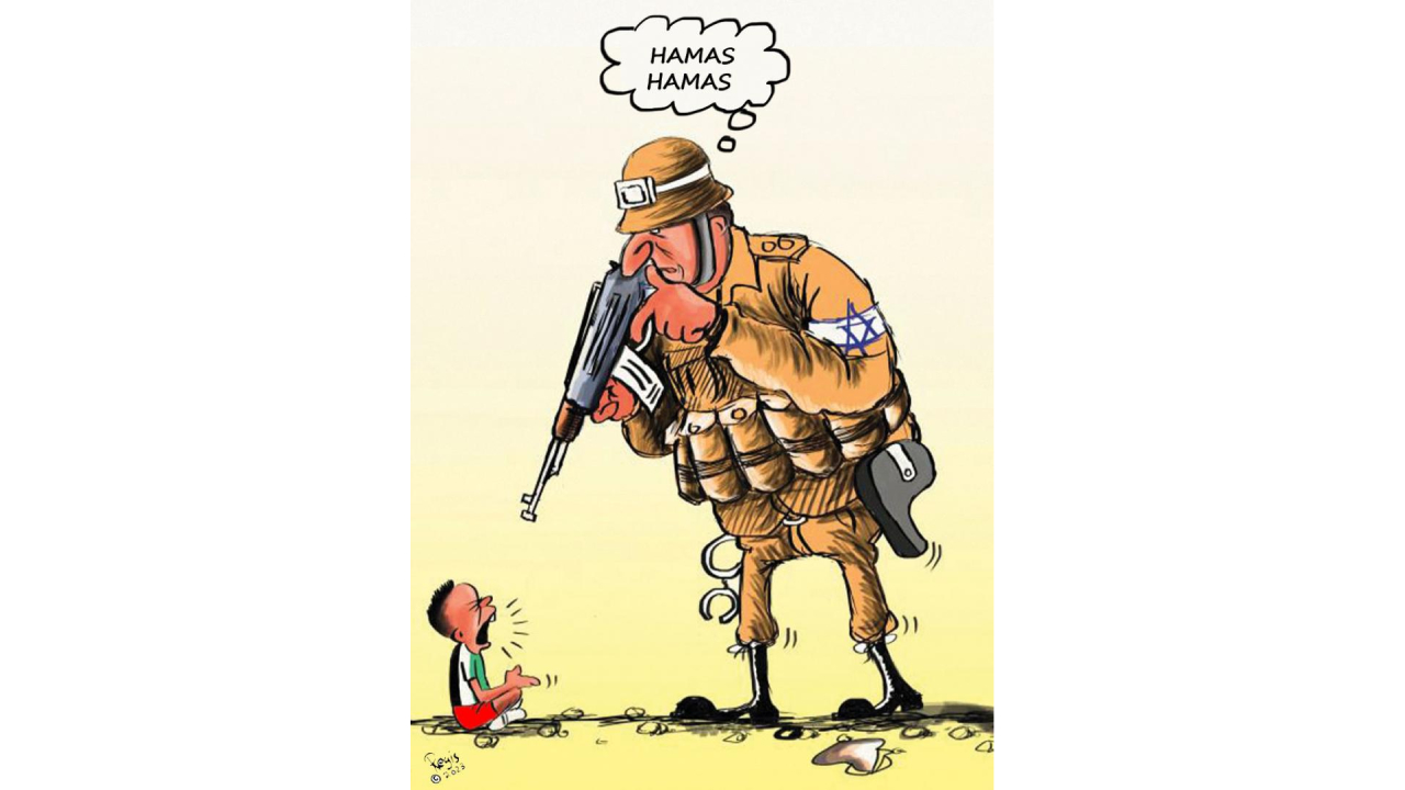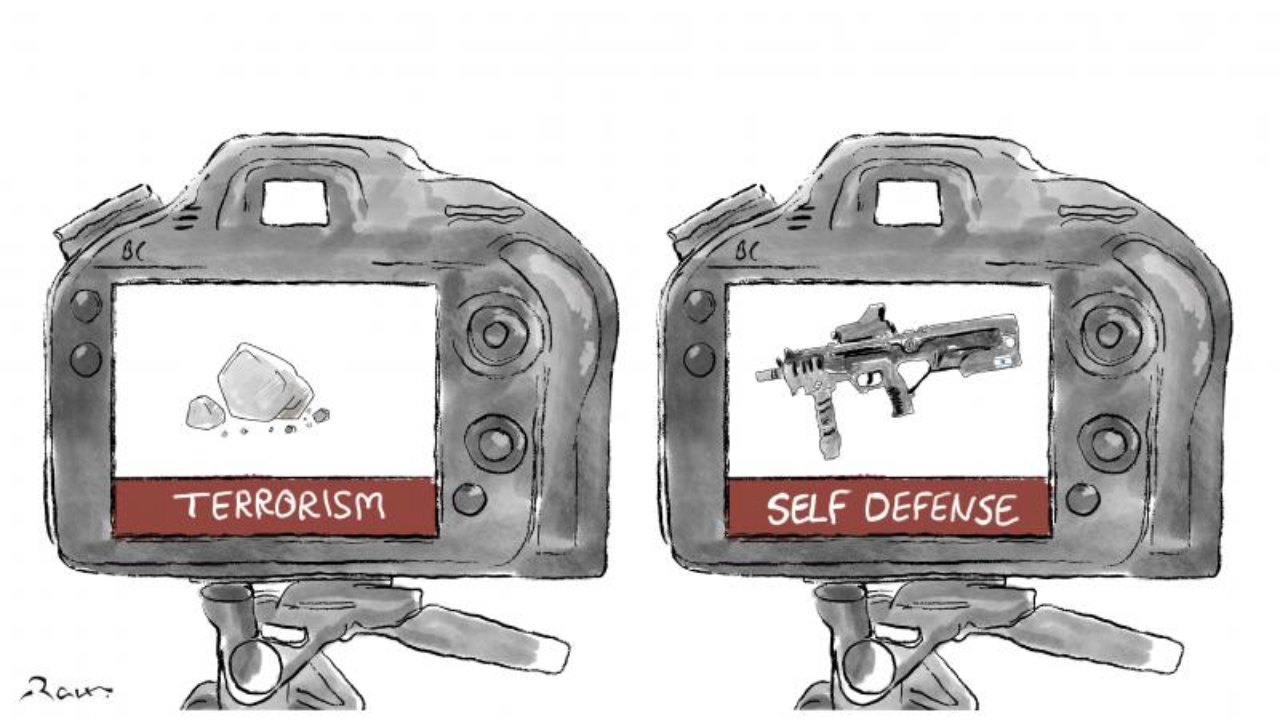 Batı’nın ‘objektif’inden İsrail-Gazze Savaşı. Taş atan terörist; binlerce cana kıyan tüfekler, tanklar, füzeler ‘meşru müdafaa.’ Karikatürist: Rafat Alkhatib