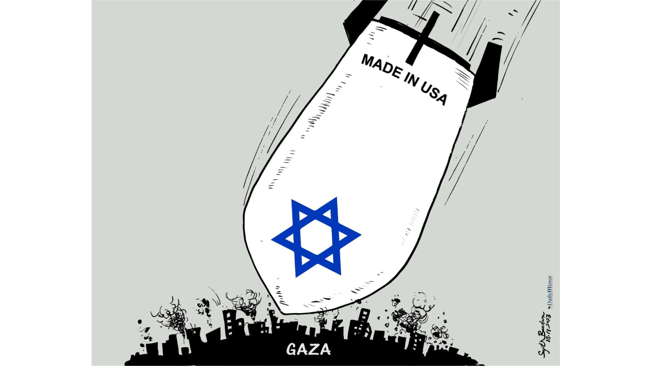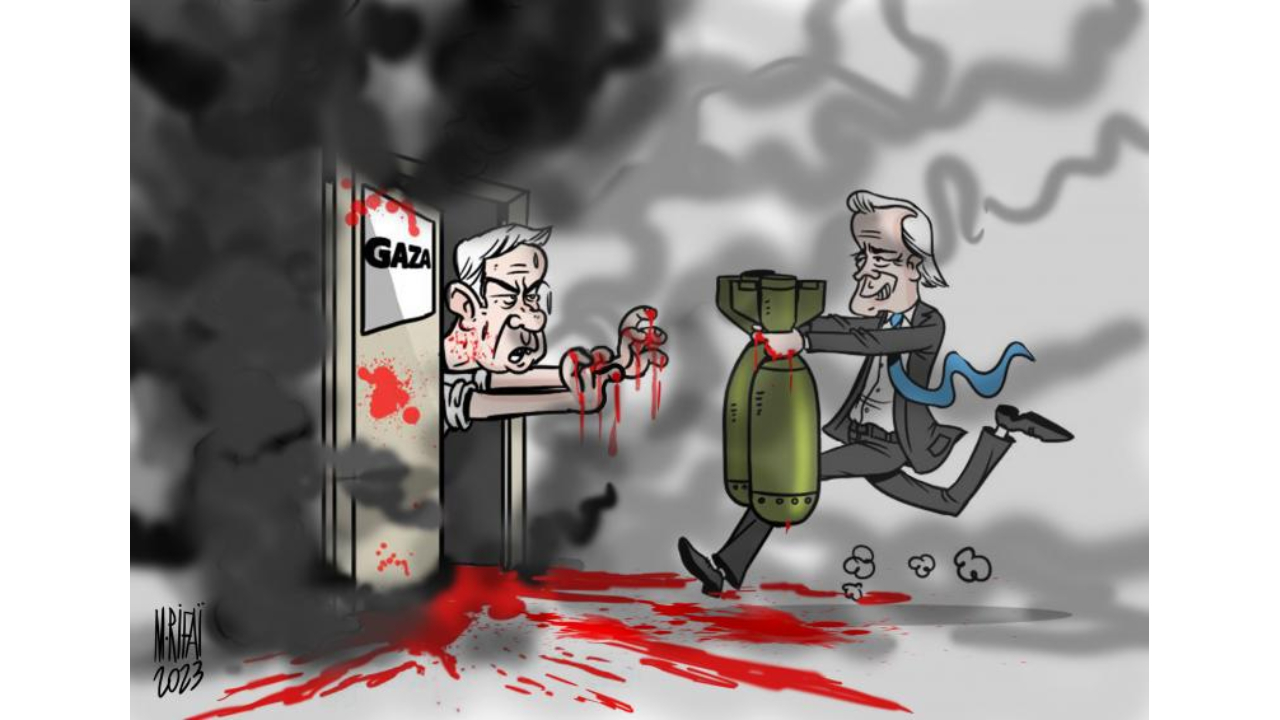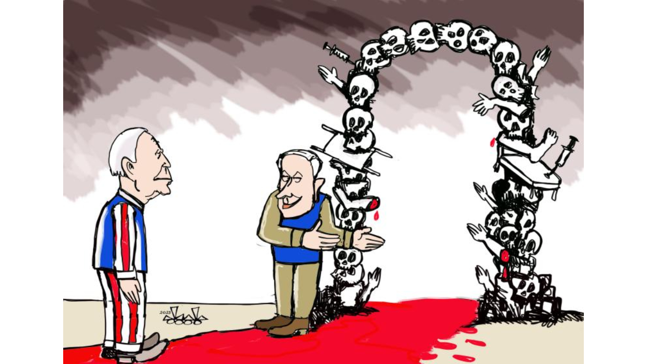 Gazze’yi adeta cehenneme çevirip soykırım yapan Netanyahu ve ABD Başkanı Biden’ın ona koşar adımlarla mühimmat yetiştirme çabası… Karikatürist: Mahmoud Rifai