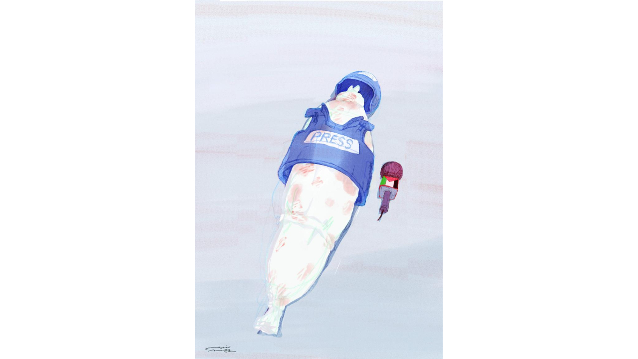 Filistin’in sesi olmaya çalışırken İsrail bombalarının hedefi olan, üzerinde "Press" yazan kask ve yeleğin korumaktan ziyade adeta hedef tahtasına dönüştüğü Gazze`de öldürülen onlarca basın mensubundan biri… Karikatürist: Mohammed Afefa