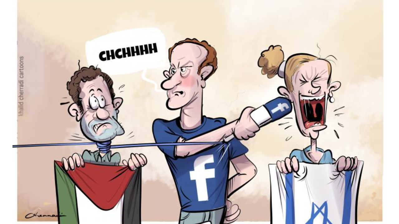 Filistin halkını yalnız bırakan sadece devlet başkanları değil, sosyal medya mecraları bile 3 maymunu oynuyor. Meta, Instagram ve Facebook`ta Filistin`i destekleyen paylaşımları sansürlüyor. Destek olmadığı gibi köstek olmaya devam ediyor. Karikatürist Khalid Cherradi de bu konuya değindi.