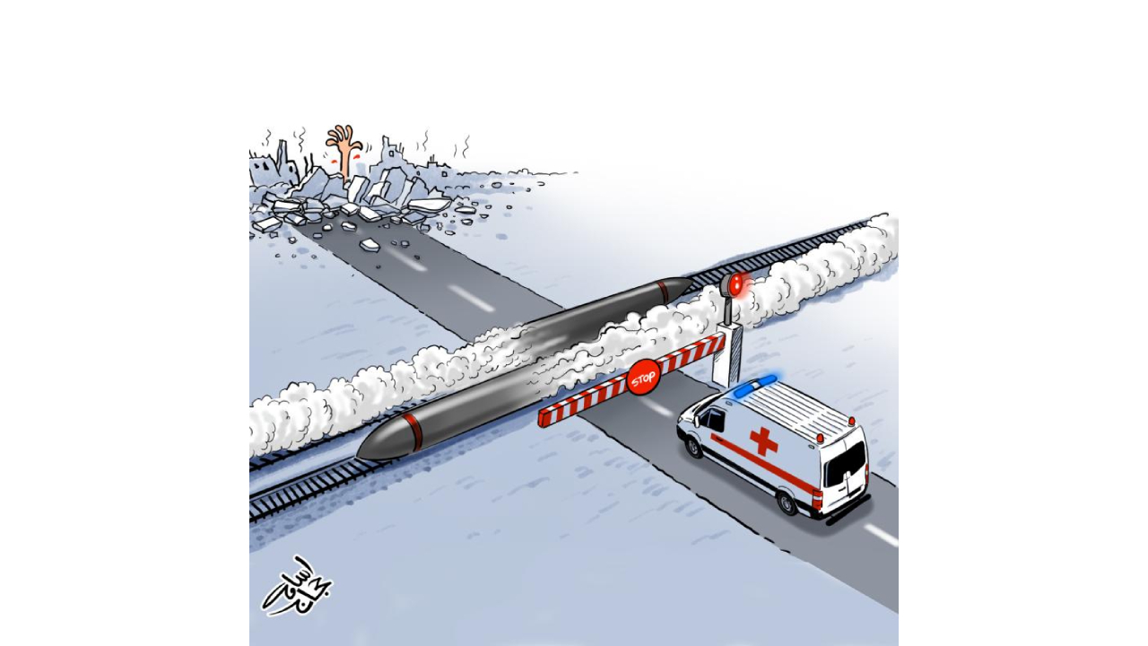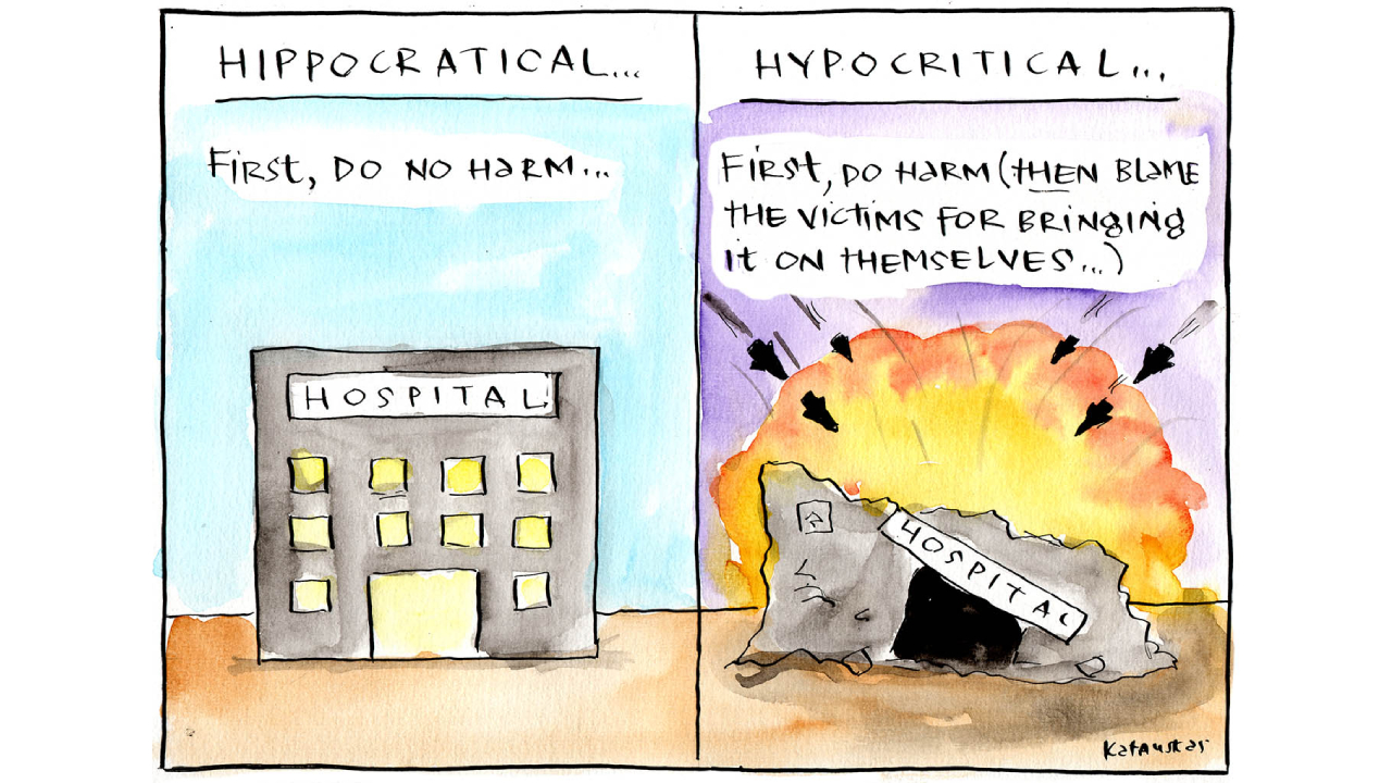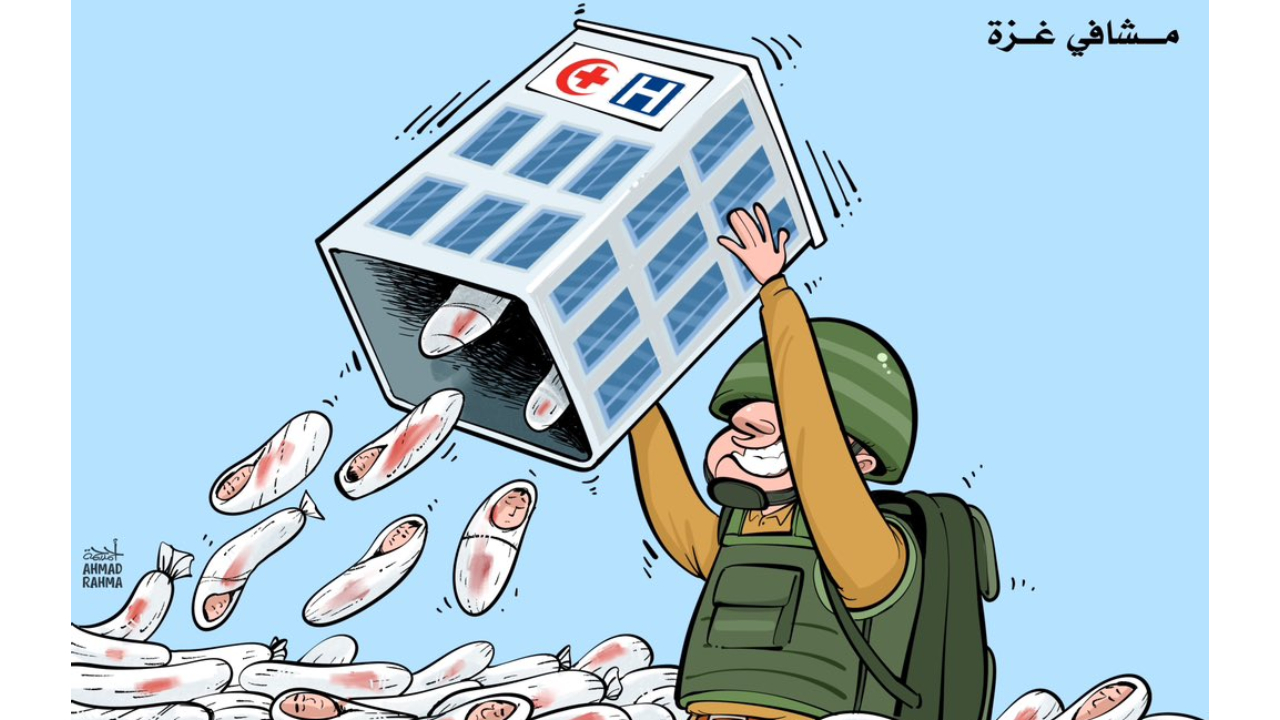İsrail hastanelerin boşaltılamayacağını bilmesine rağmen önce hastaneleri boşaltın diye sözde uyarılarda bulundu, sonra hastaneleri bastı, bombaladı. Karikatürist: Ahmad Rama