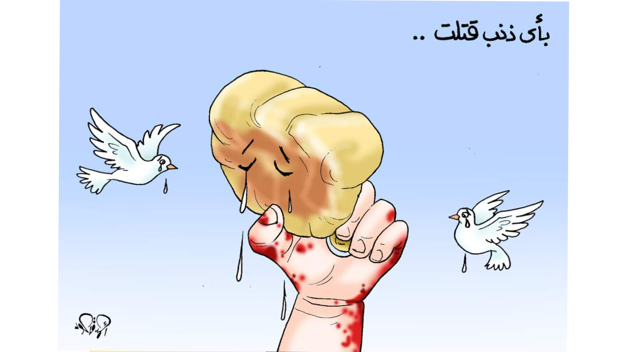 El Ehli Baptist Hastanesi`ne düzenlenen saldırı sonrasında elinde ekmeğiyle aklımıza kazınan bebeğin, ekmek sırasında beklerken bombalanan çocukların tasviri ve gözü yaşlı barış güvercinleri… Karikatürist: Ahmad Qaddura