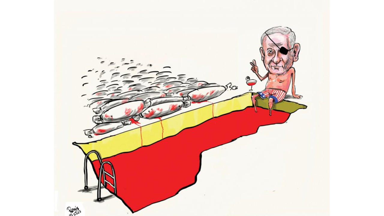 Binlerce masumun kanıyla doldurulmuş bir havuz ve başında ABD şortuyla ‘keyif süren’ ve bir de barış işareti yapan Natanyahu… Karikatürist: Simon Regis