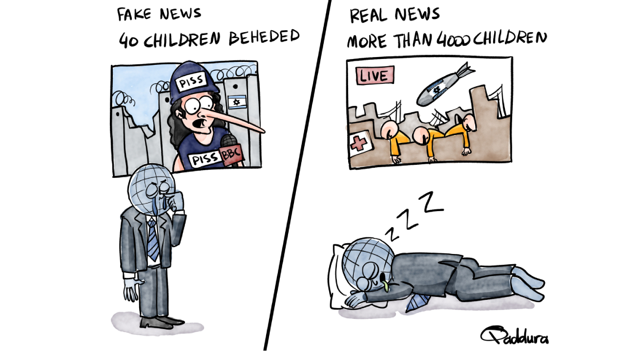 Batı’nın yalan haberlerine duygulanan ama gerçekler karşısında uykuya dalan dünya… (“Sahte haber: 40 çocuk öldürüldü/Gerçek haber: 4 binden fazla çocuk”) Karikatürist: Ahmad Qaddura