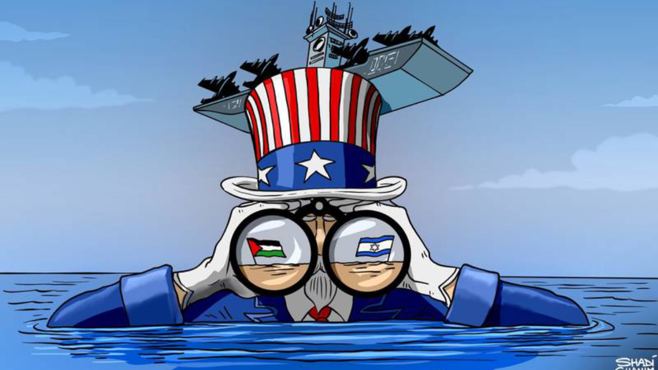Gazze’de olanları uzaktan sinsice izleyen ABD’nin tasviri ‘Sam amca’ ve şapkasına gizlemeyi beceremediği onlarca numarası... Karikatürist: Shadi Ghanim