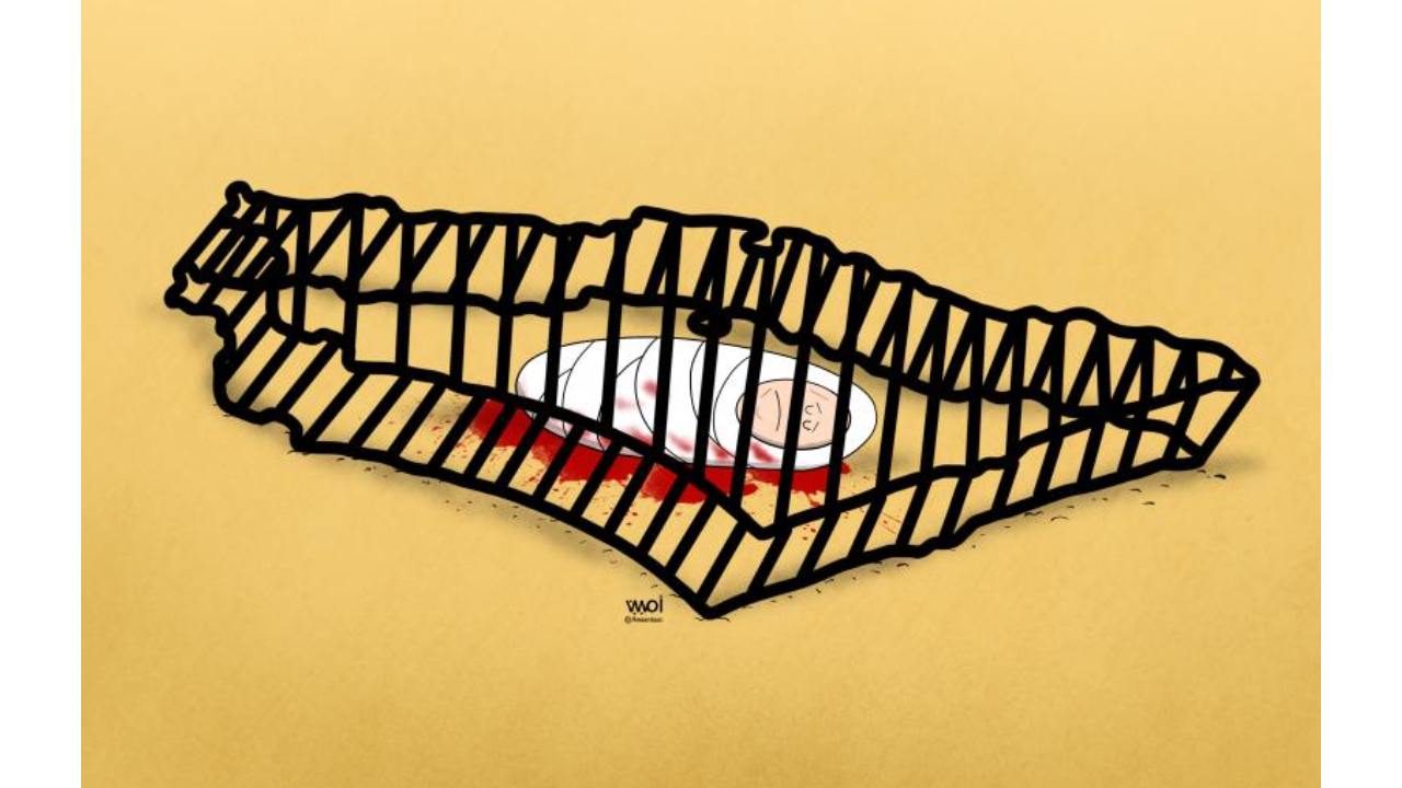 Gazze Şeridi’ne hapsolmuş ve yaşamını yitirmiş kundakta bir bebek… Karikatürist: Ameen Alhabarah