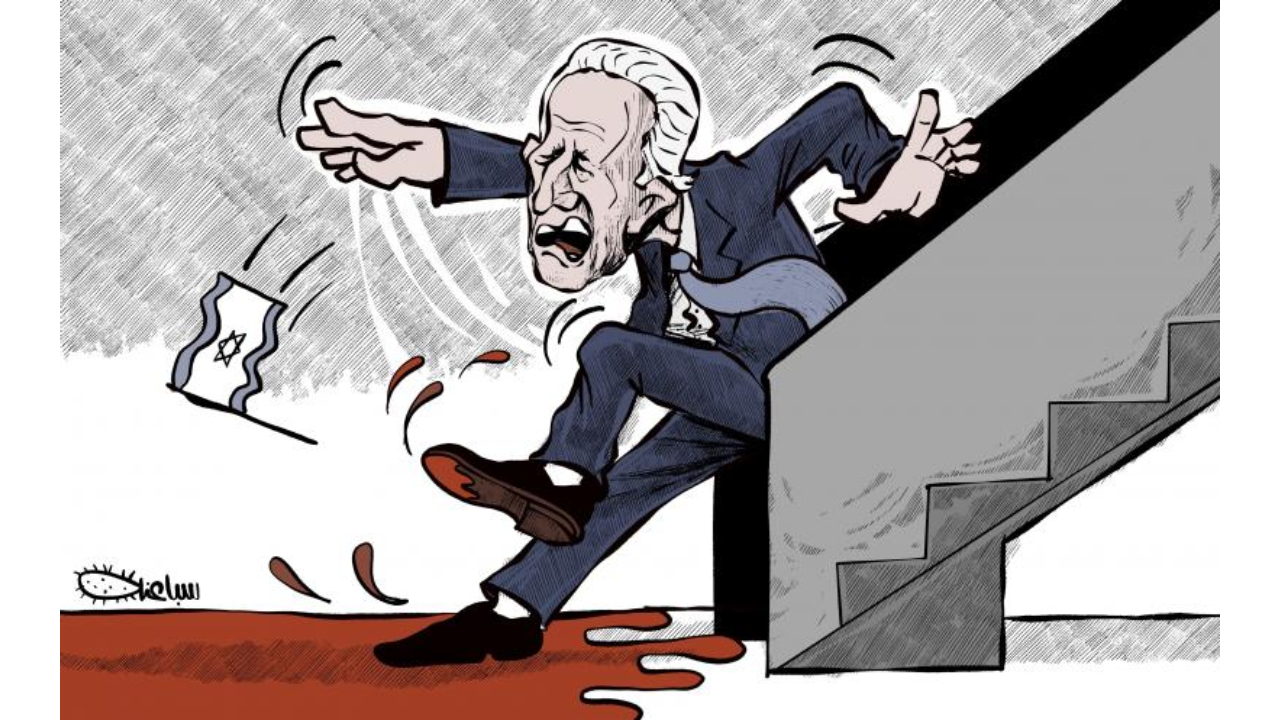 Karikatürist Mohammad Sabaaneh, ABD Başkanı Joe Biden`ın İsrail ziyaretini sürekli merdivenlerden düşmesine atıfta bulunarak eleştirdi. Gazzeli çocukların kanıyla kaplı merdivenler Biden`ı düşürmeye devam edecek.