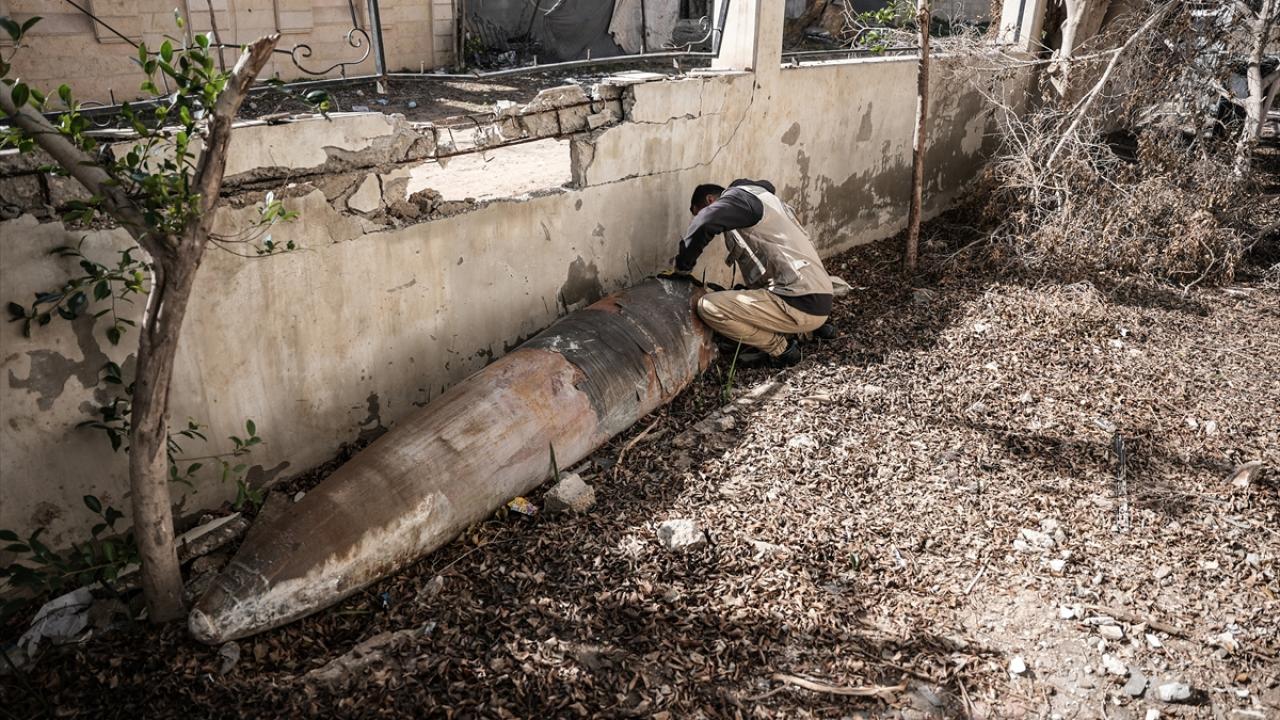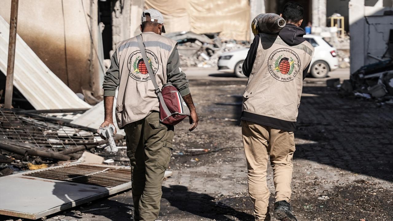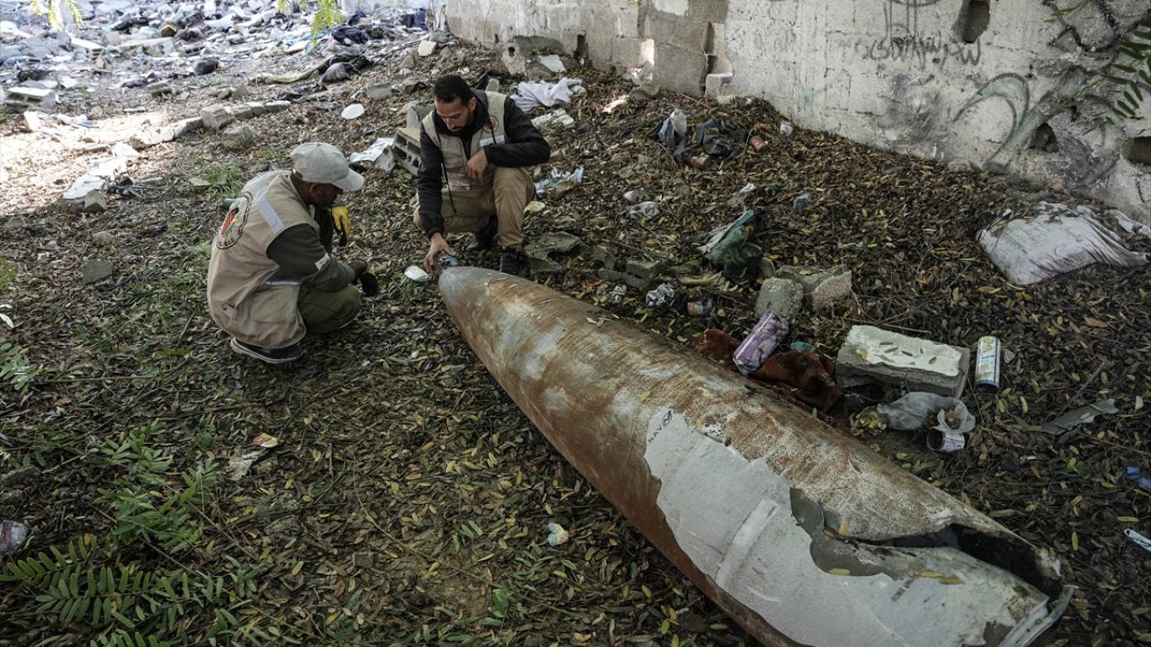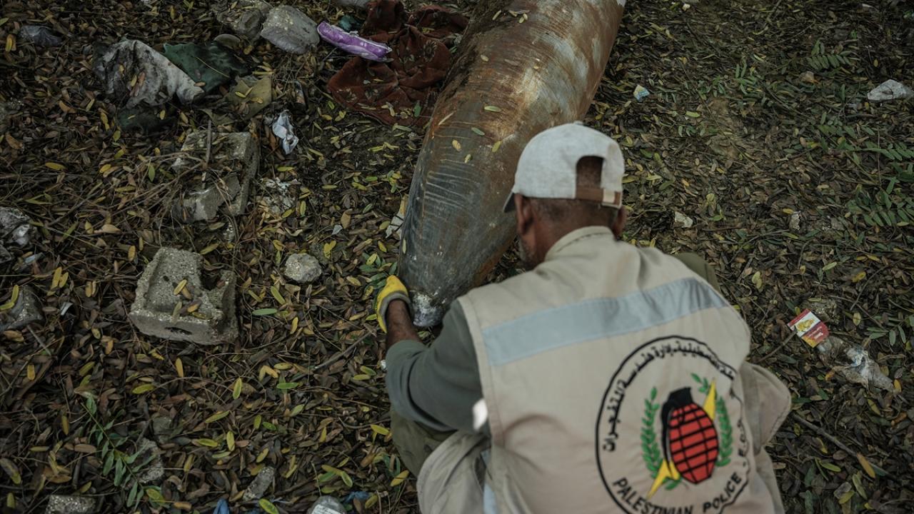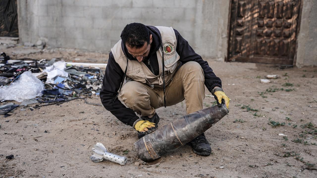 Gazze`nin güneyindeki Refah kentinde, Gazze İçişleri Bakanlığı`na bağlı Patlayıcı Mühendisliği görevlileri, binaların enkazı üzerinde patlamayan füze ve tank mermilerini etkisiz hale getirmek için çalışmalarını sürdürüyor.