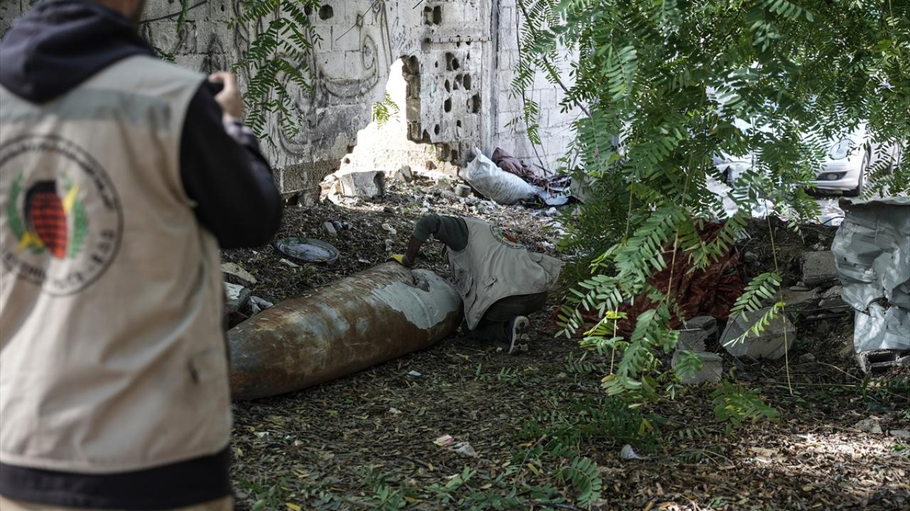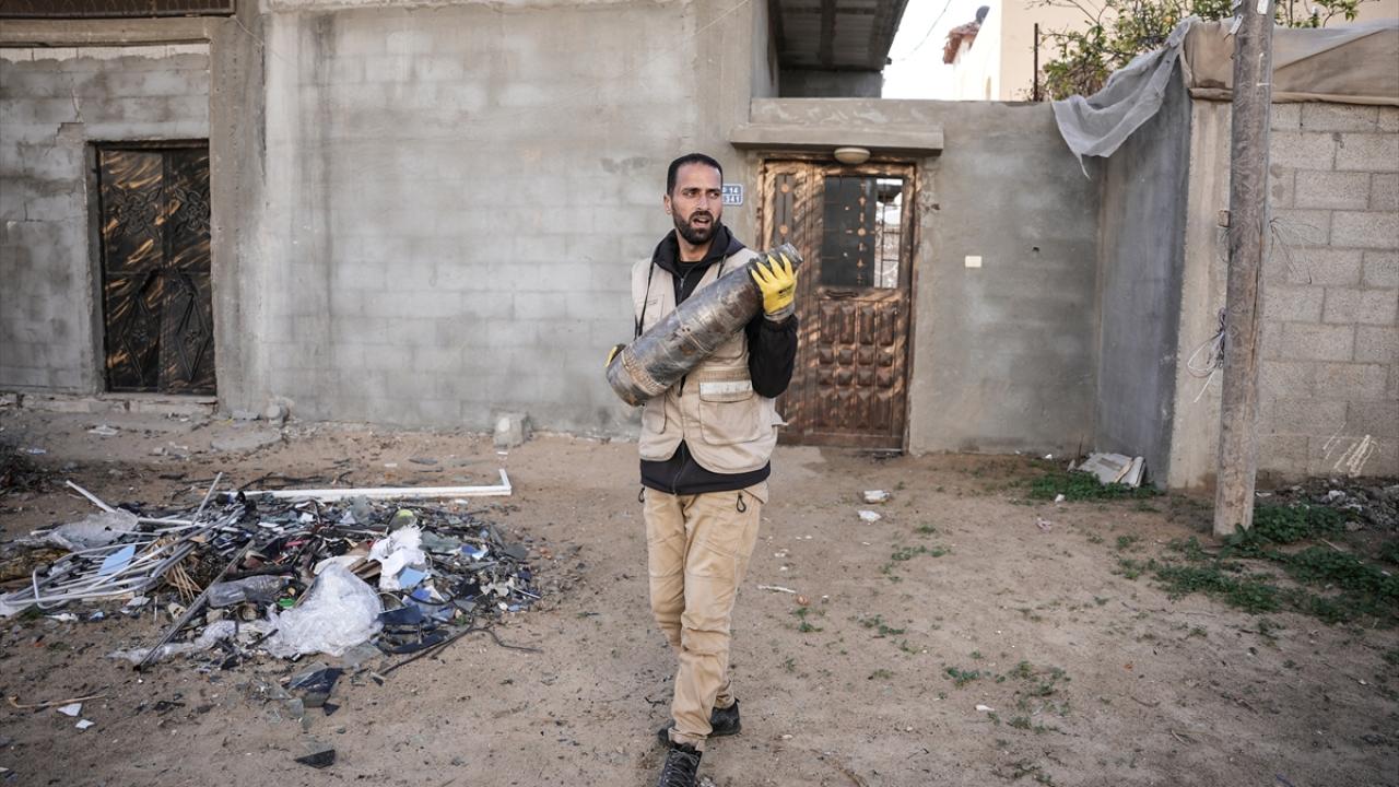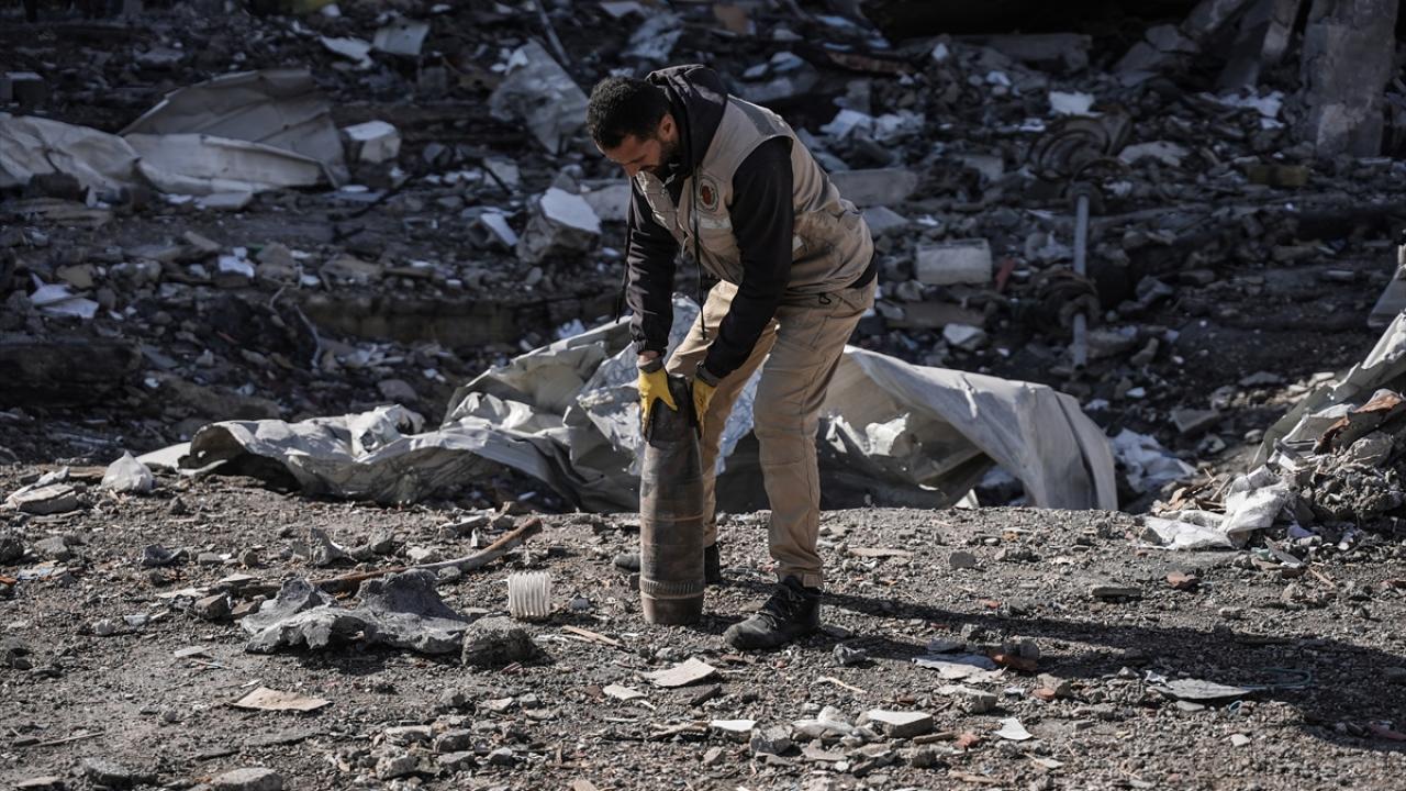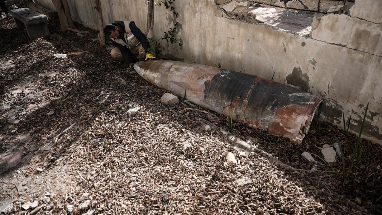Gazze`nin güneyindeki Refah kentinde, Gazze İçişleri Bakanlığı`na bağlı Patlayıcı Mühendisliği görevlileri, binaların enkazı üzerinde patlamayan füze ve tank mermilerini etkisiz hale getirmek için çalışmalarını sürdürüyor.