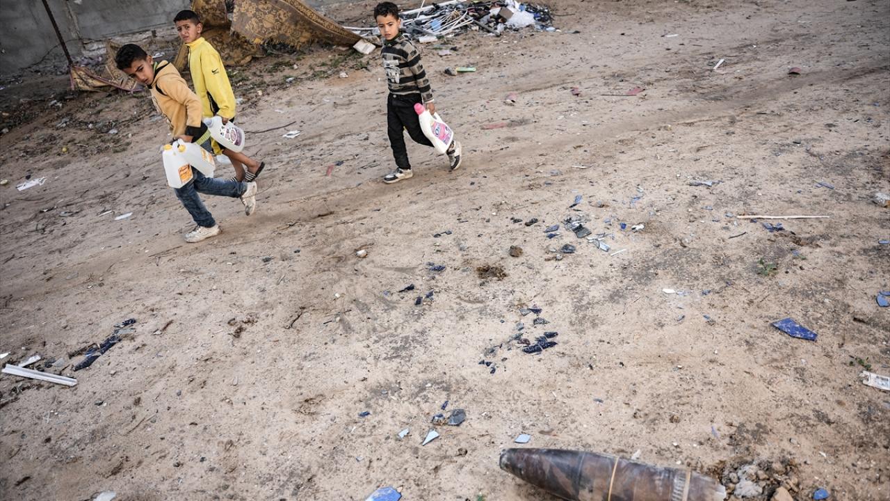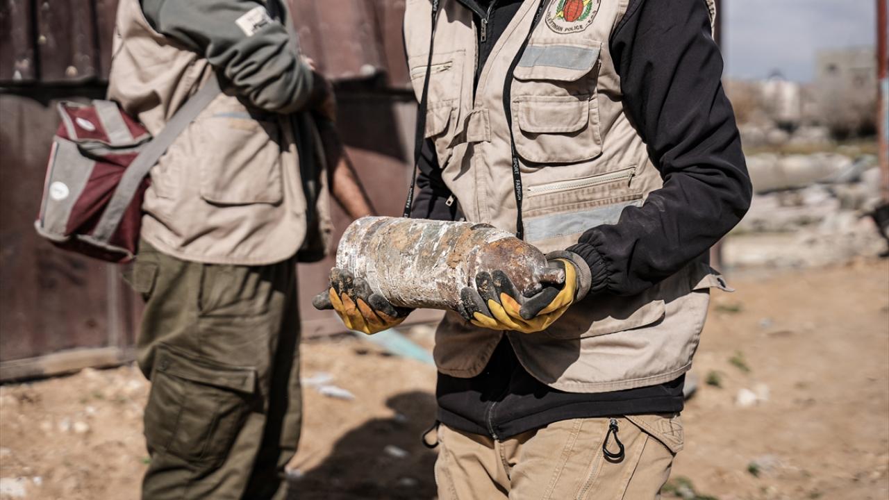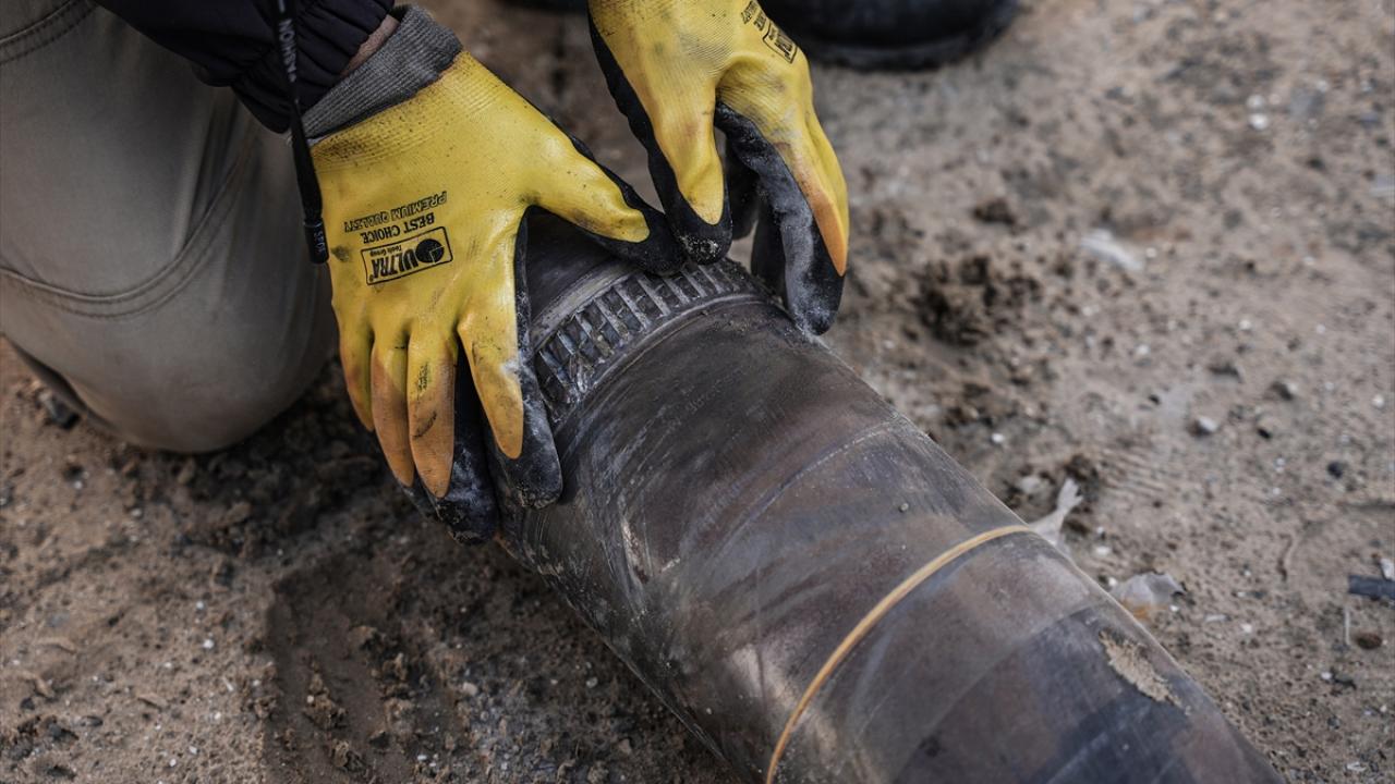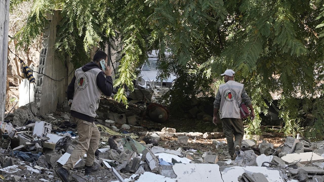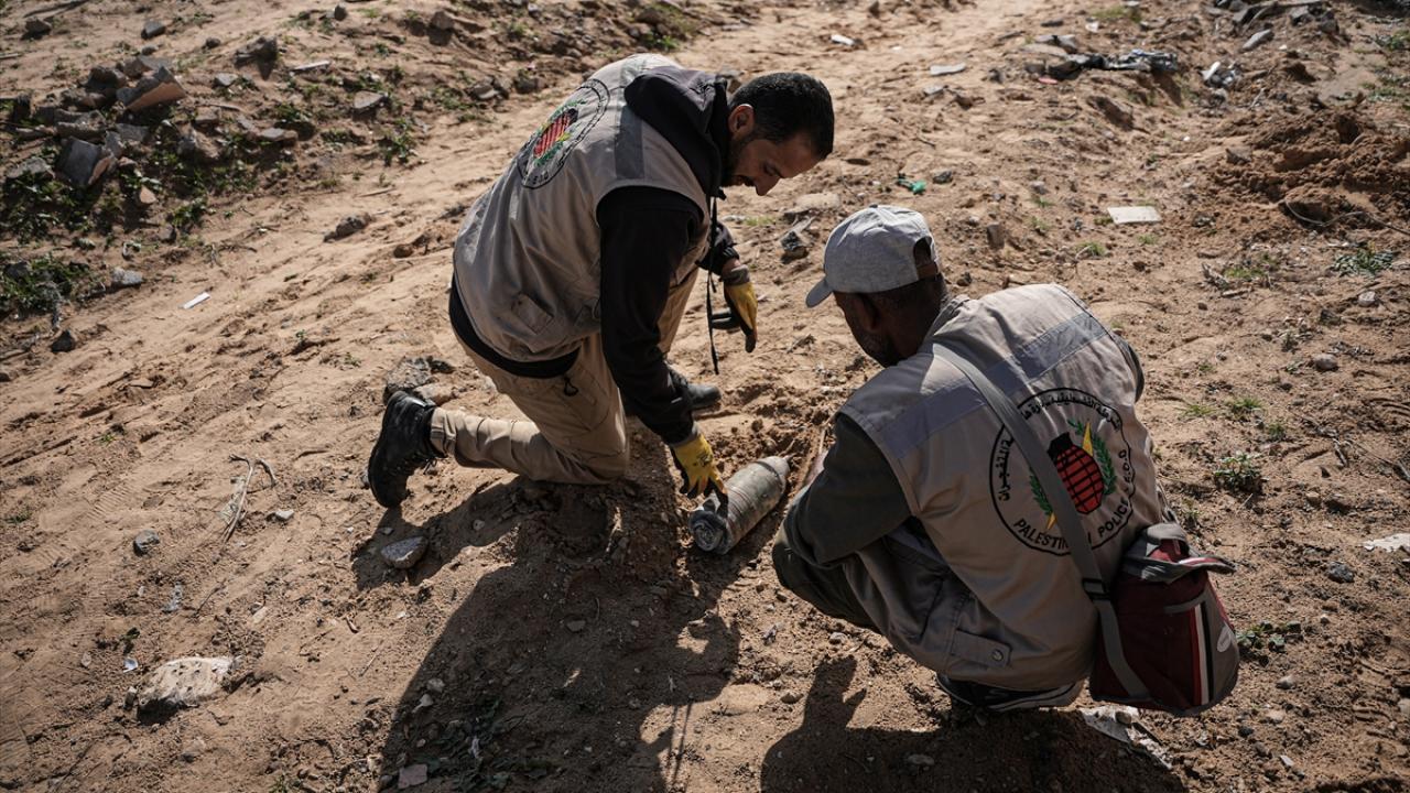 Gazze`nin güneyindeki Refah kentinde, Gazze İçişleri Bakanlığı`na bağlı Patlayıcı Mühendisliği görevlileri, binaların enkazı üzerinde patlamayan füze ve tank mermilerini etkisiz hale getirmek için çalışmalarını sürdürüyor.