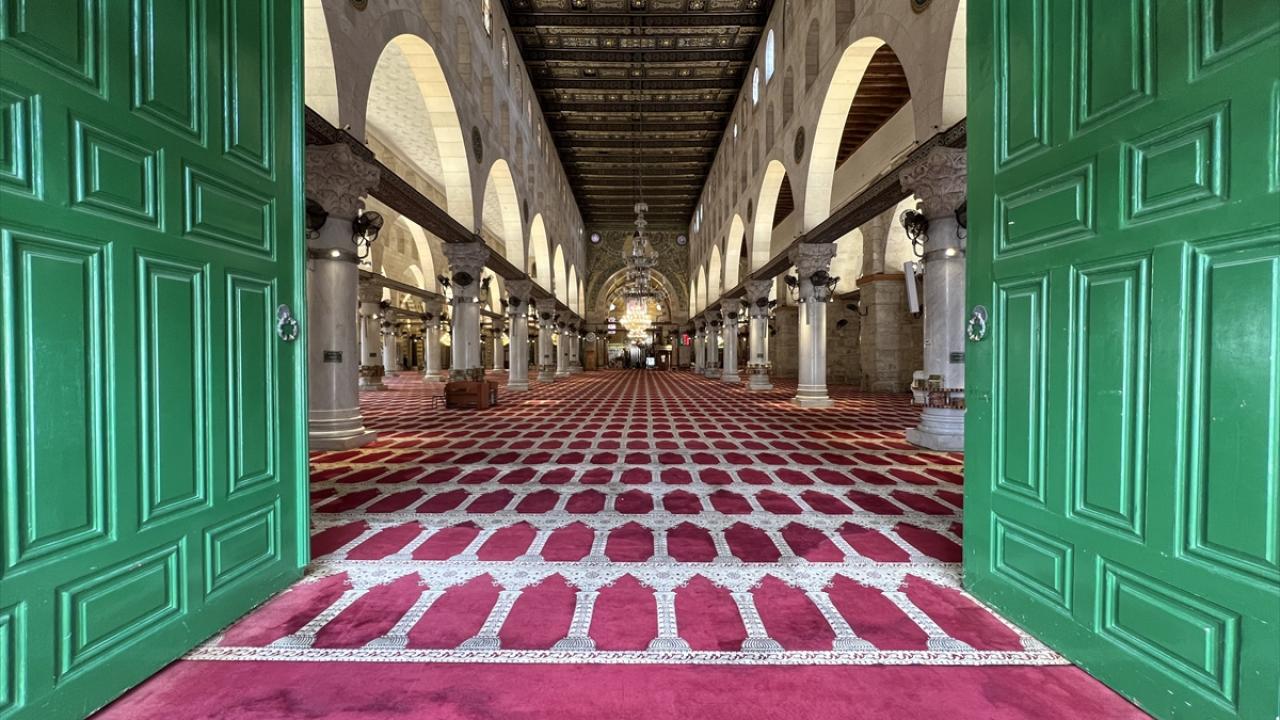 İsrail kısıtlamaları nedeniyle Mescid-i Aksa haremi, içerisi ve avlusu cuma namazı öncesi boş olduğu görüldü.