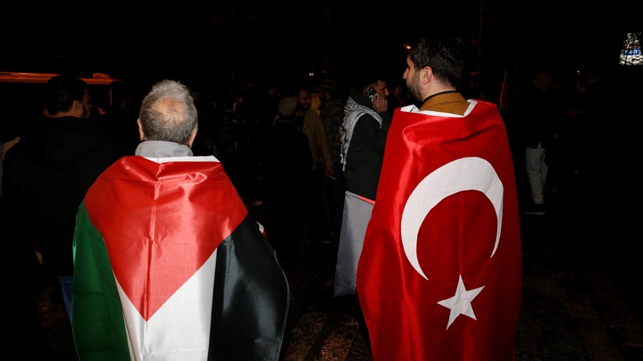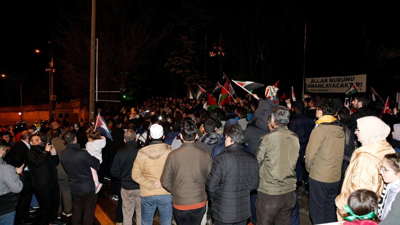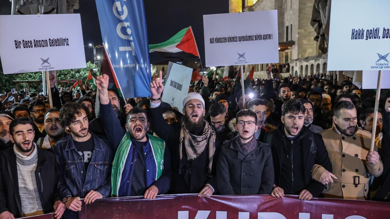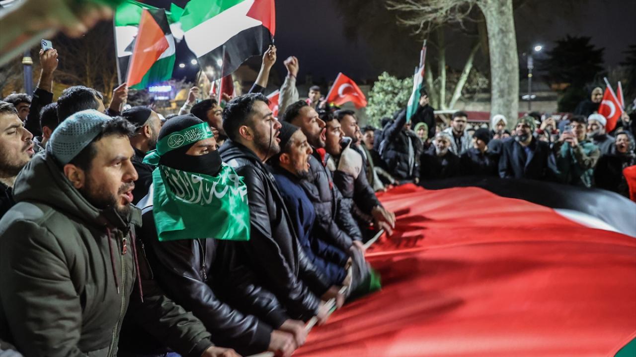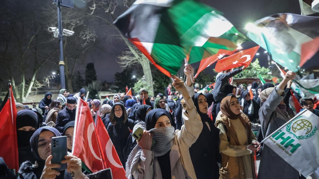 Topluluk, "Yaşasın Filistin mücadelemiz", "Müslümanlar burada dimdik ayakta" ve "Kahrolsun İsrail" sloganları attı.