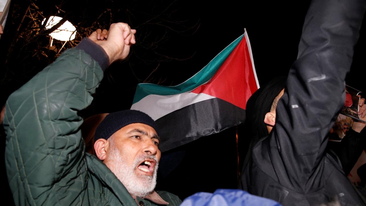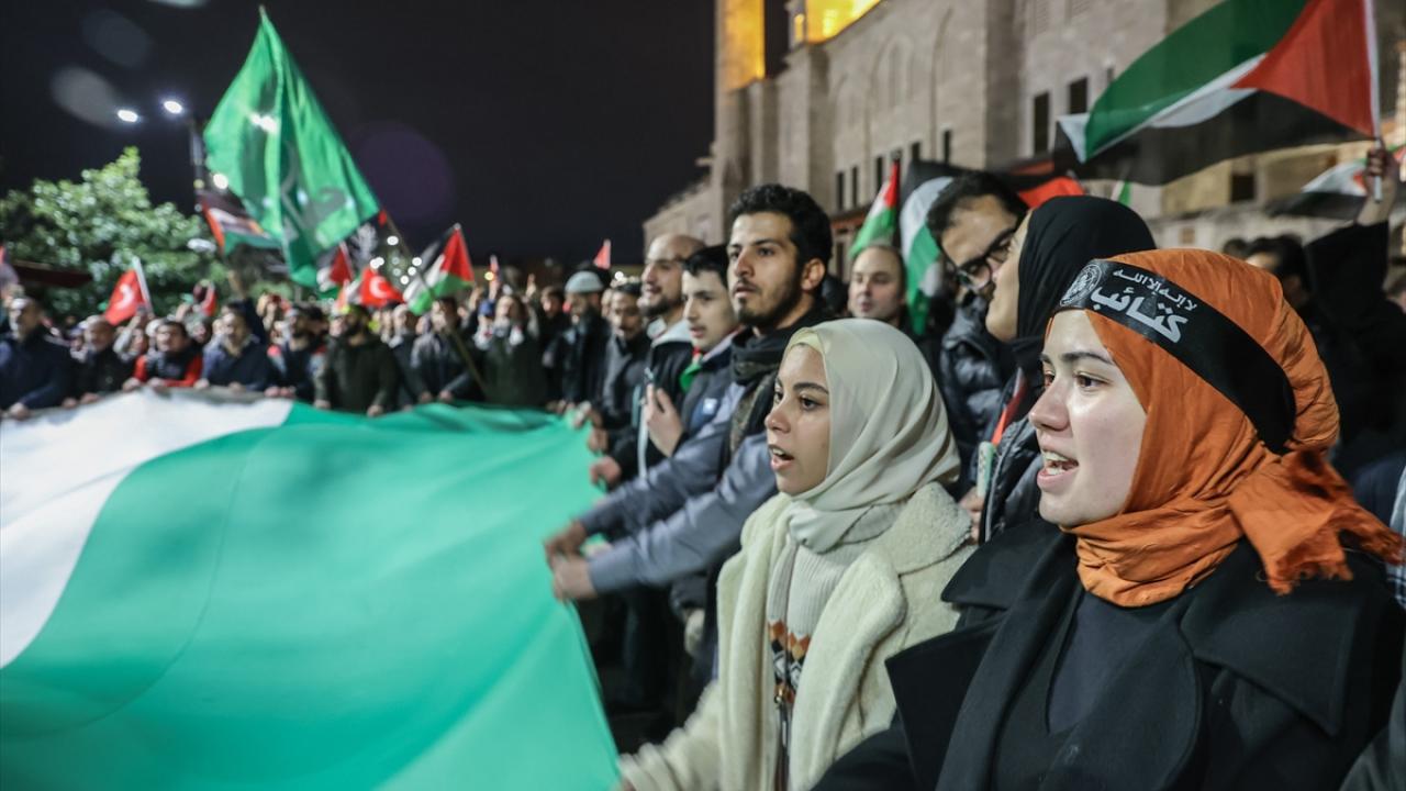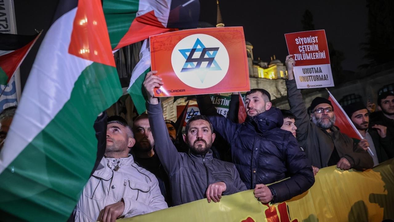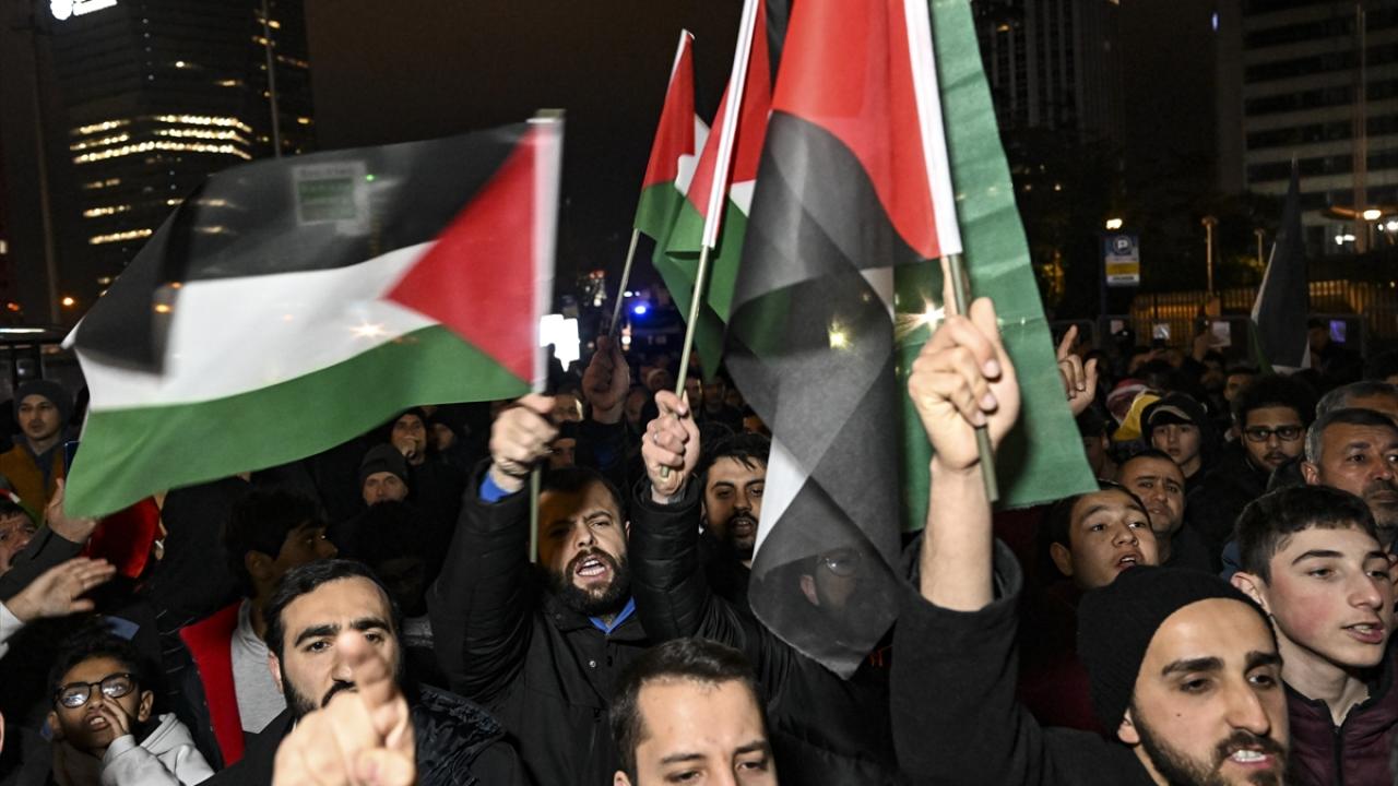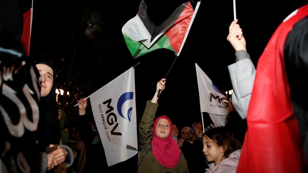 Topluluk, "Yaşasın Filistin mücadelemiz", "Müslümanlar burada dimdik ayakta" ve "Kahrolsun İsrail" sloganları attı.