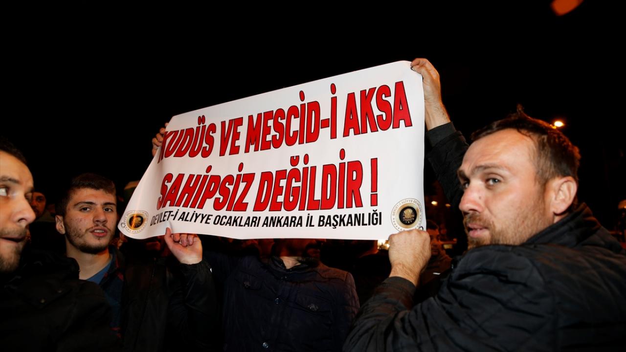 İsrail`in Ankara Büyükelçiliği konutu önünde toplanan sivil toplum kuruluşları temsilcilerinden oluşan grup, ABD ve İsrail aleyhinde slogan attı.
