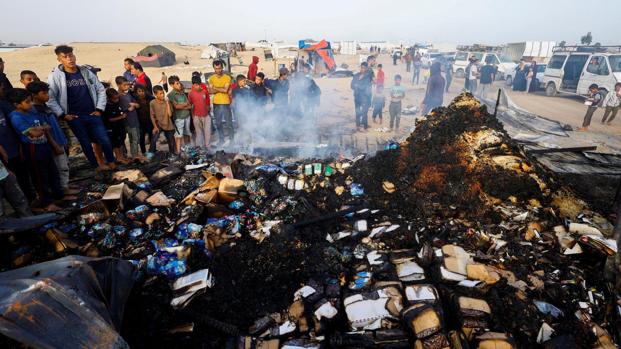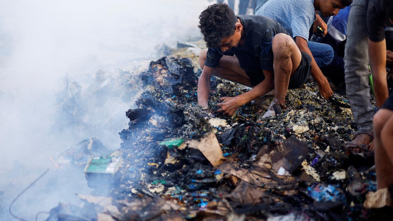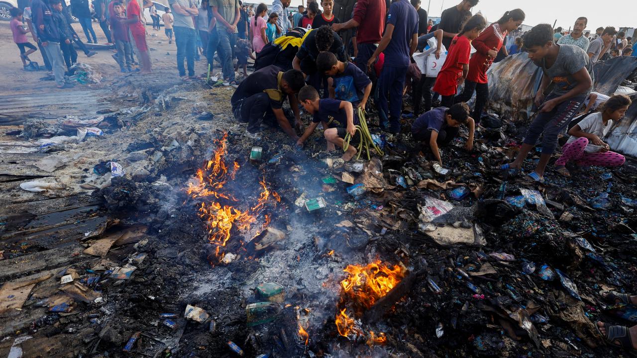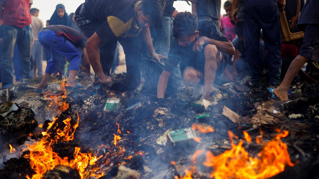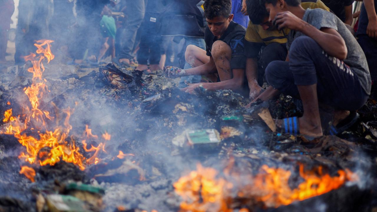 Filistinliler, İsrail'in Refah'ta yerinden edilmiş insanlar için belirlenen bölgeye düzenlediği saldırının ardından yanmış enkazlar arasında yiyecek arıyor.