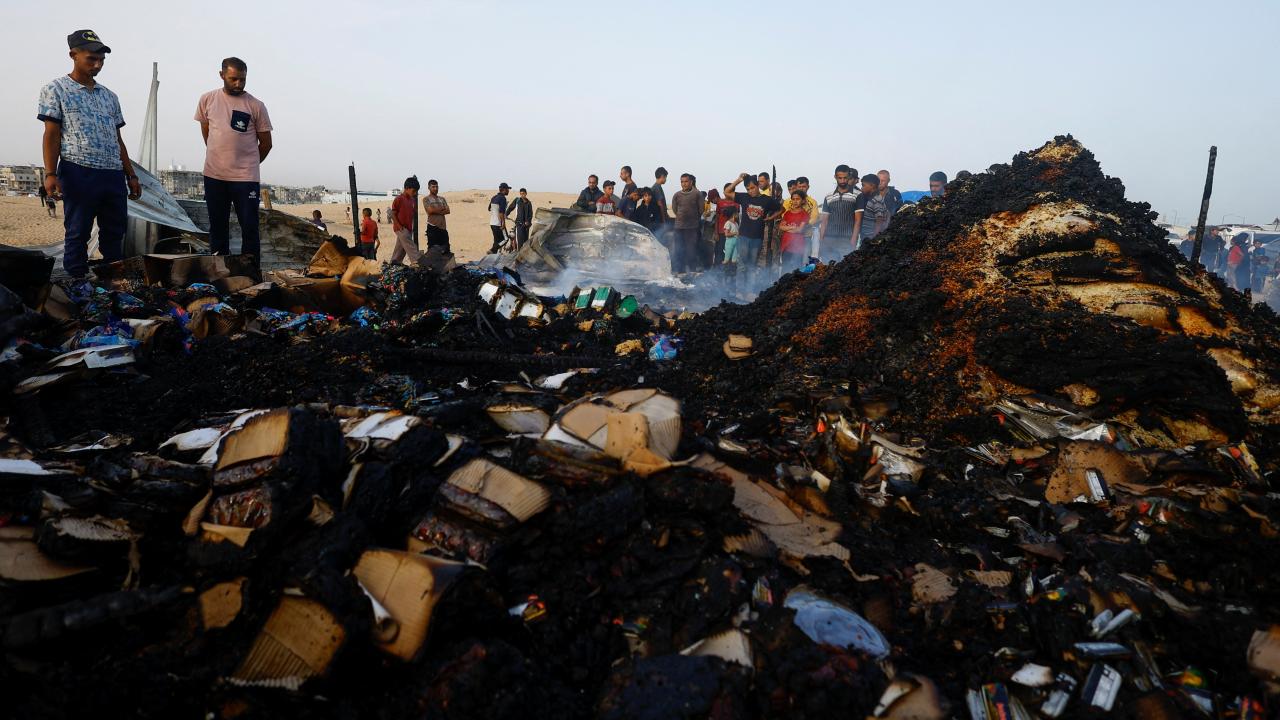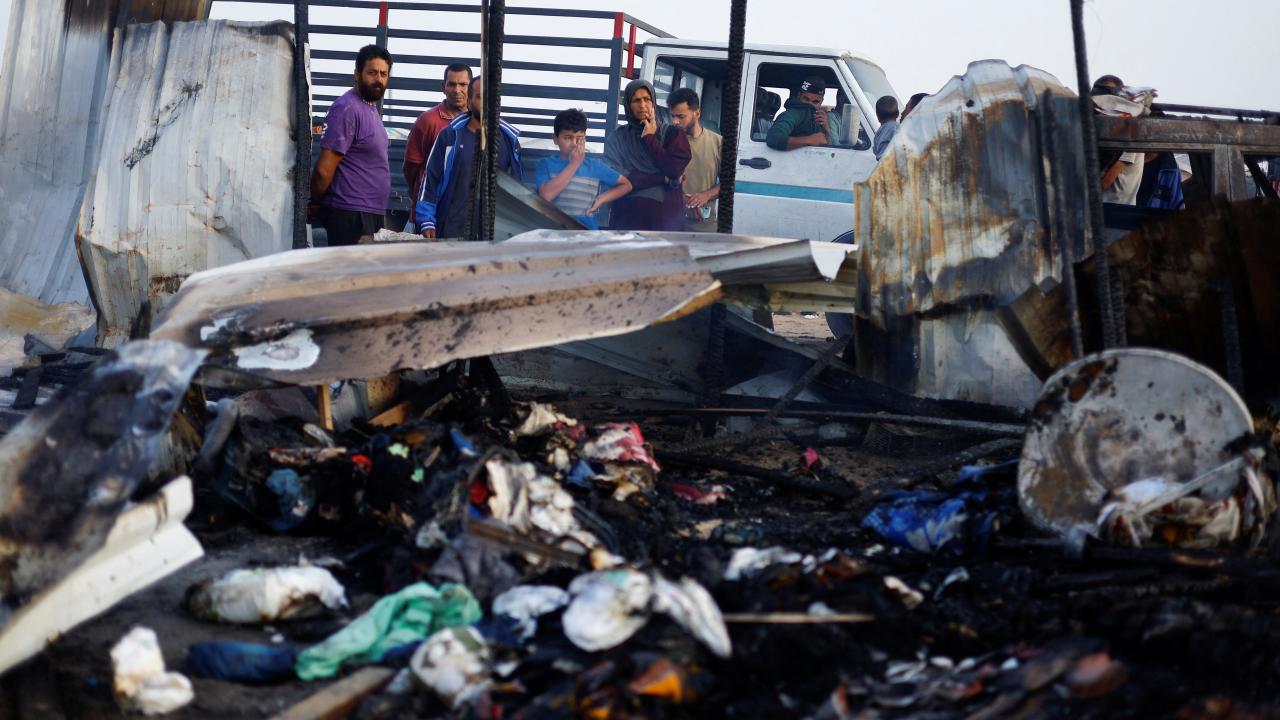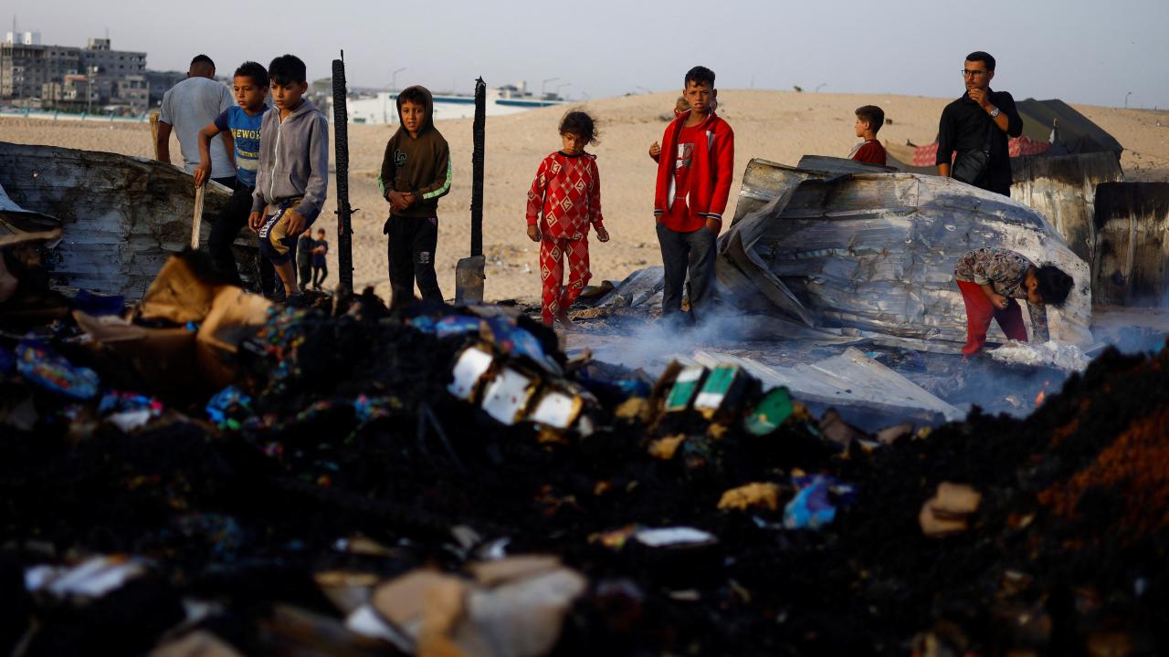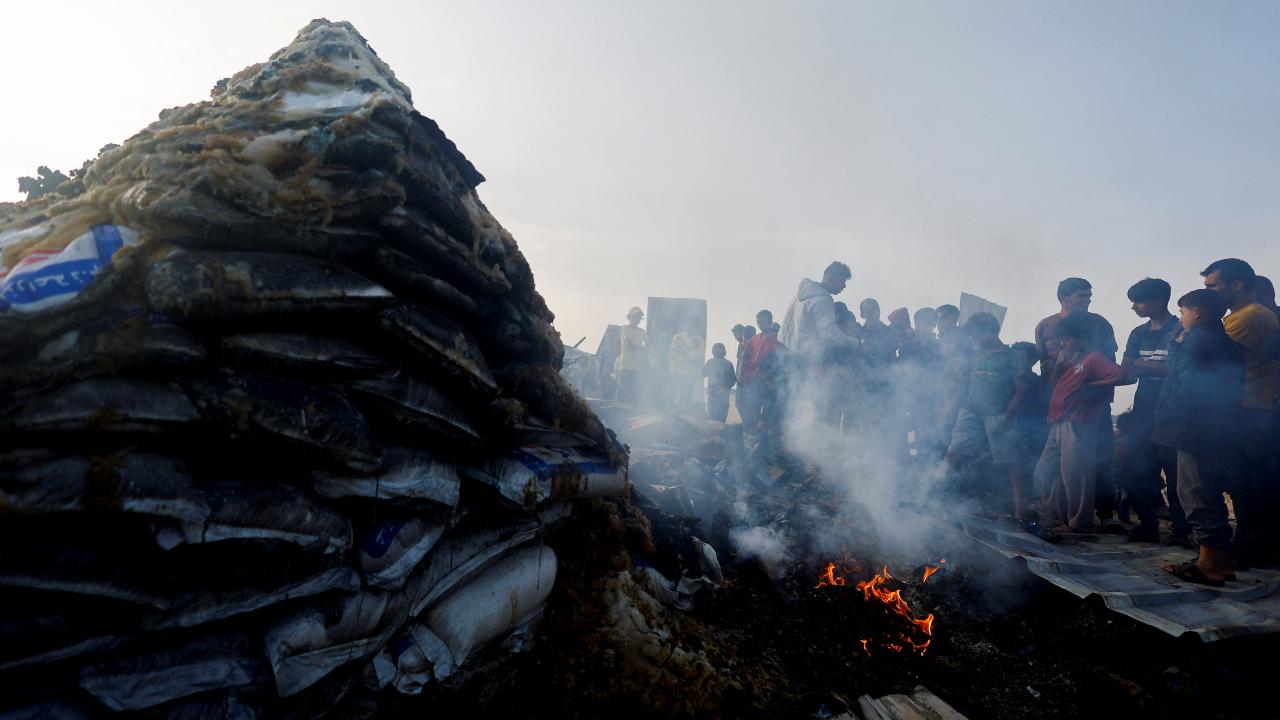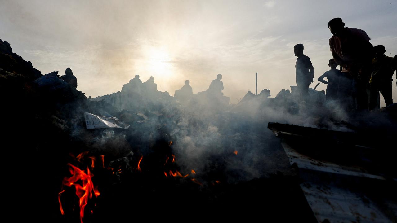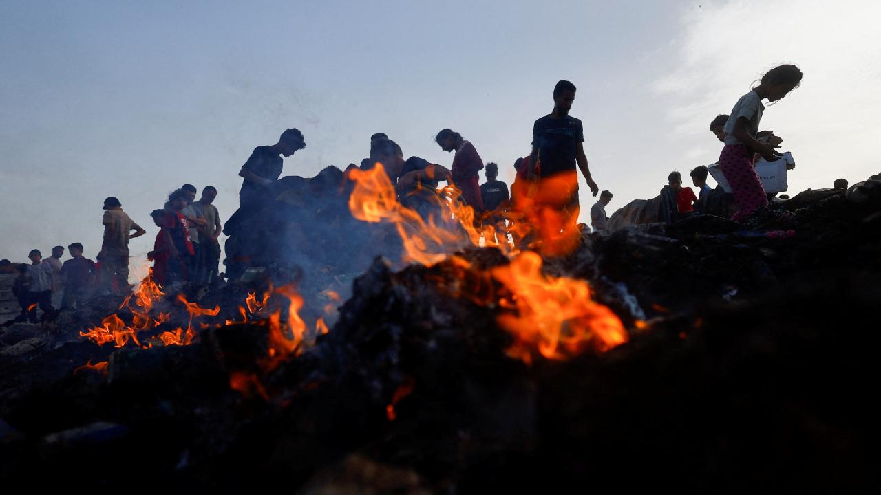 Filistinliler, İsrail'in Refah'ta yerinden edilmiş insanlar için belirlenen bölgeye düzenlediği saldırının ardından yanmış enkazlar arasında yiyecek arıyor.