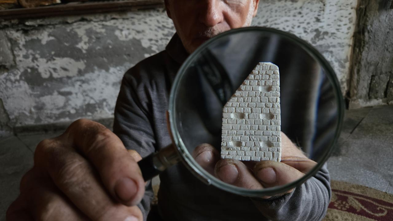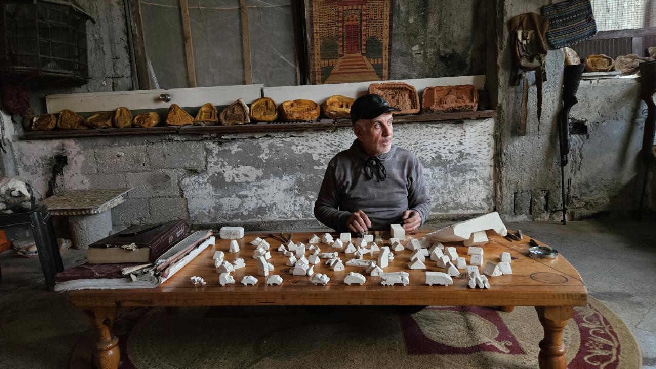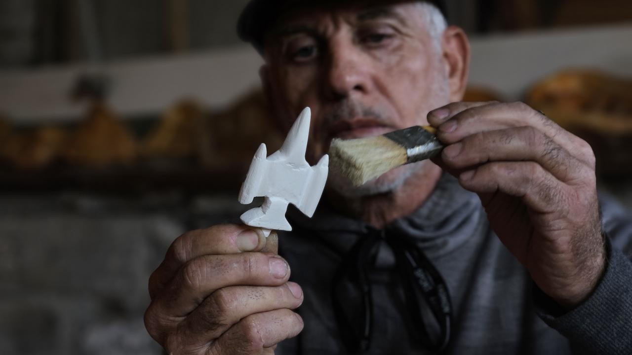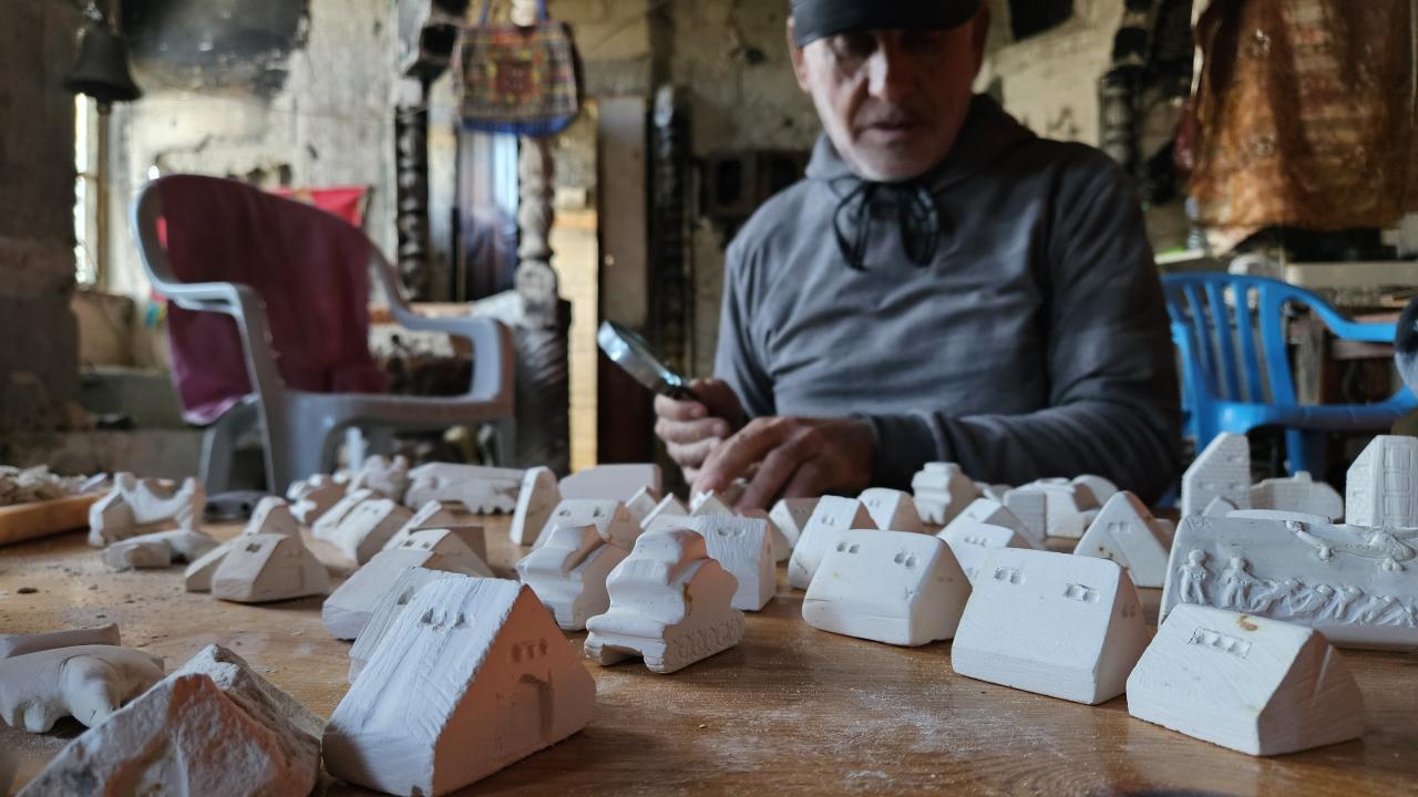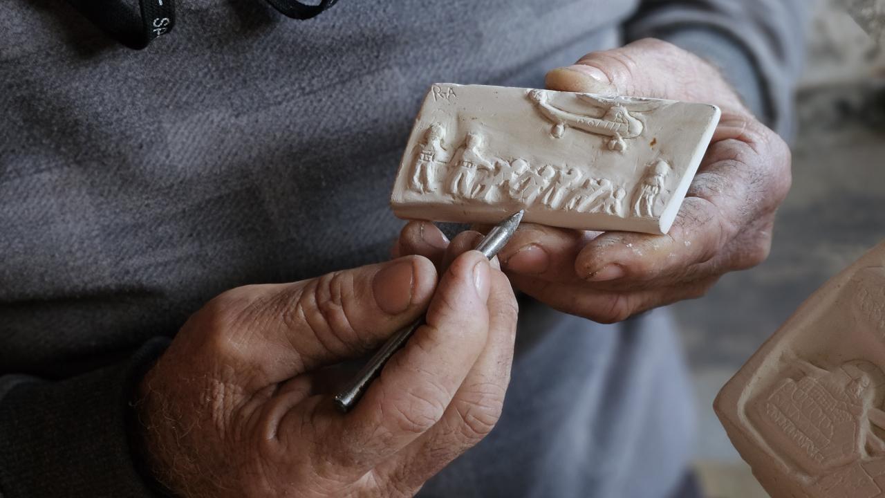Gazze'nin güneyindeki Han Yunus kentinde yaşayan Rıdvan Ahmet, İsrail ordusunun Gazze'ye düzenlediği saldırılarda kullandığı tank, savaş uçakları ve evlerini terk ederek çadırlarda yaşayan halkın sıkıntılarını taşlara oyuyor.