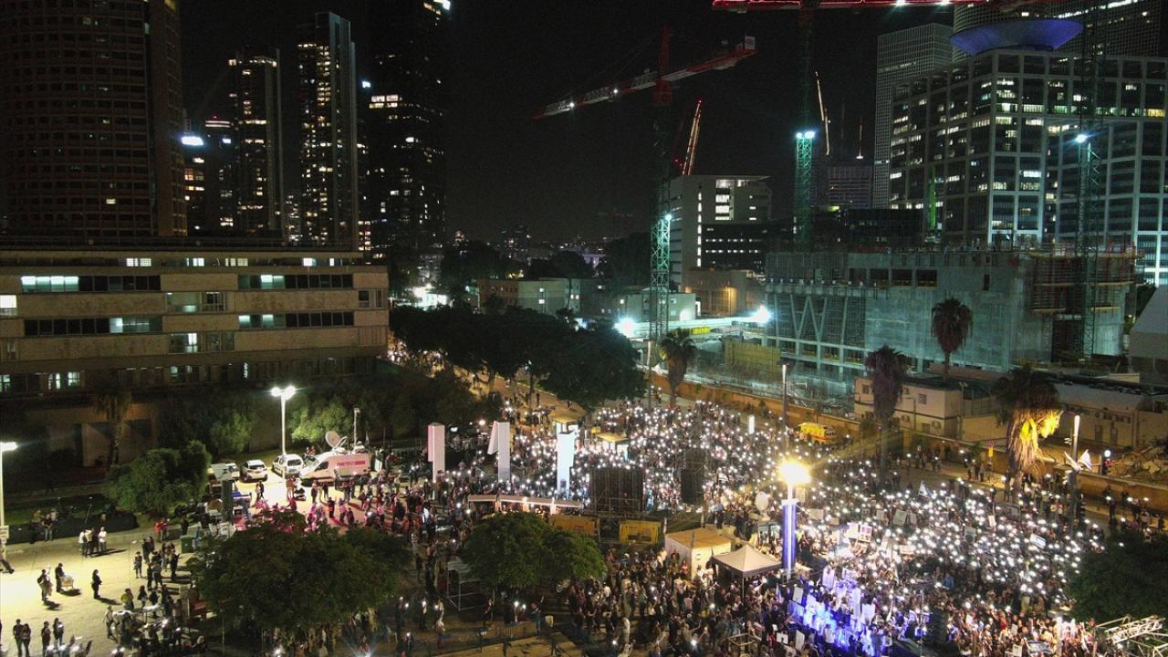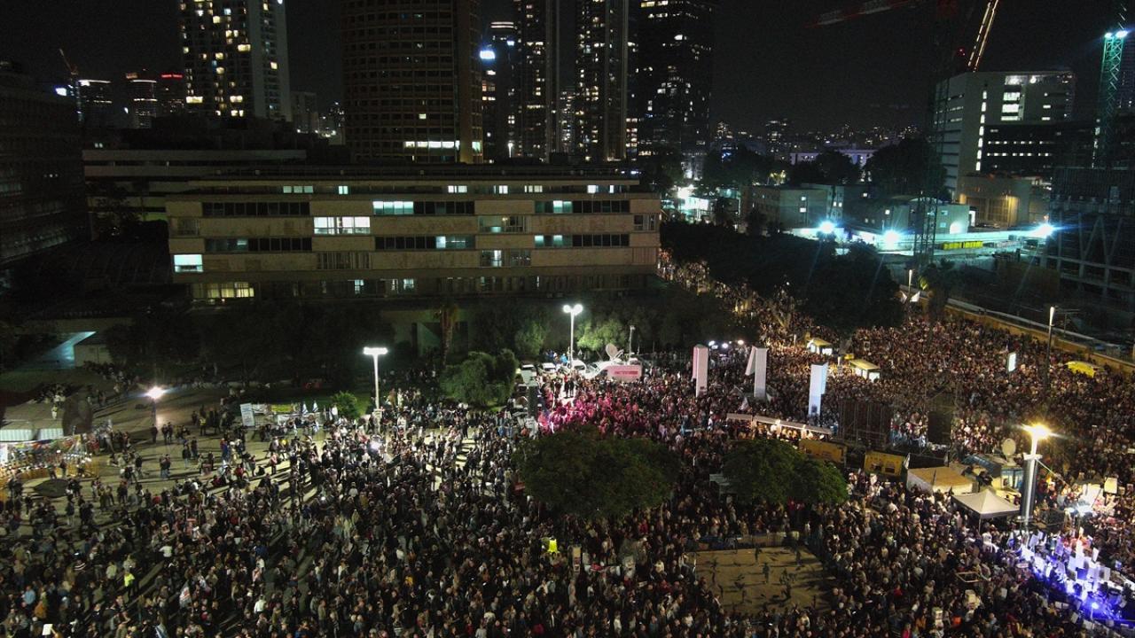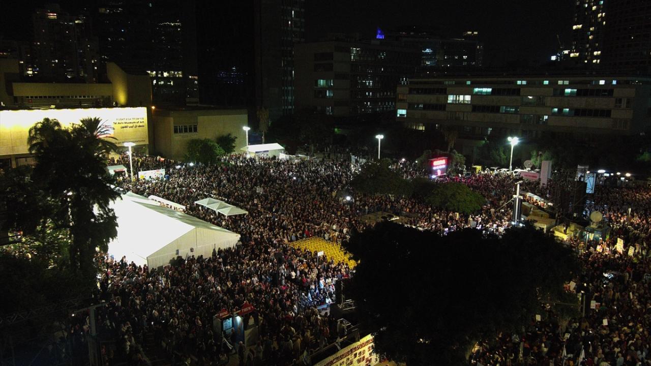 Tel Aviv Sanat Müzesi önünde yapılan gösteriye, esirlerin yakınlarının yanı sıra binlerce İsrailli katıldı.