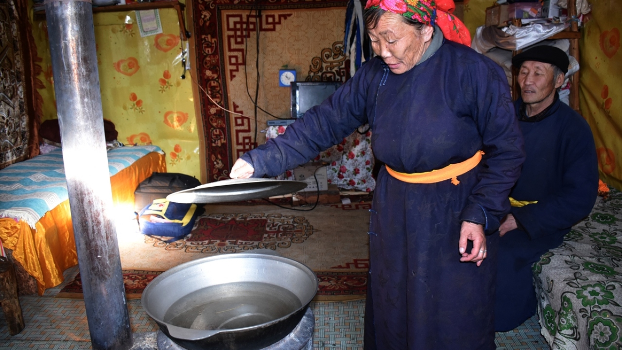 Odanın ortasındaki tek ısı kaynağı sobayı yemek yapmak için de kullanıyorlar. Buharda pişirdikleri mantı, misafirlerine sundukları başlıca ikramlardan.