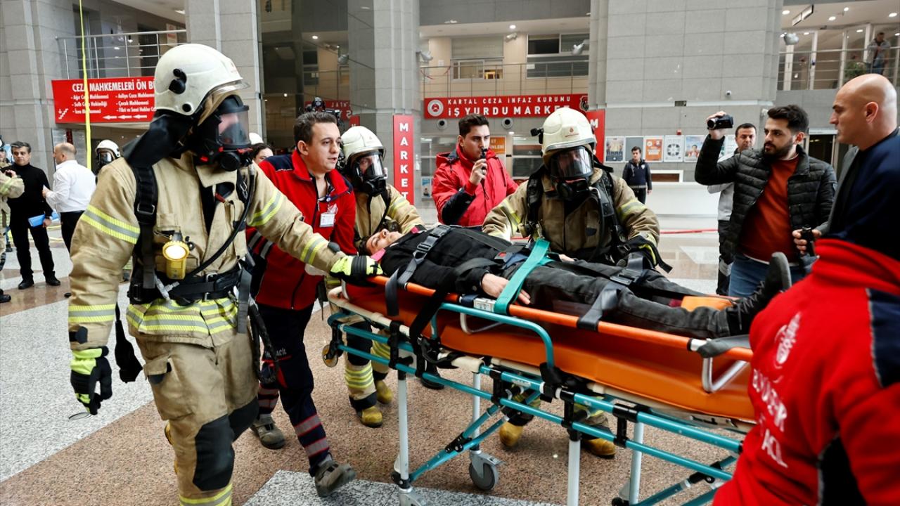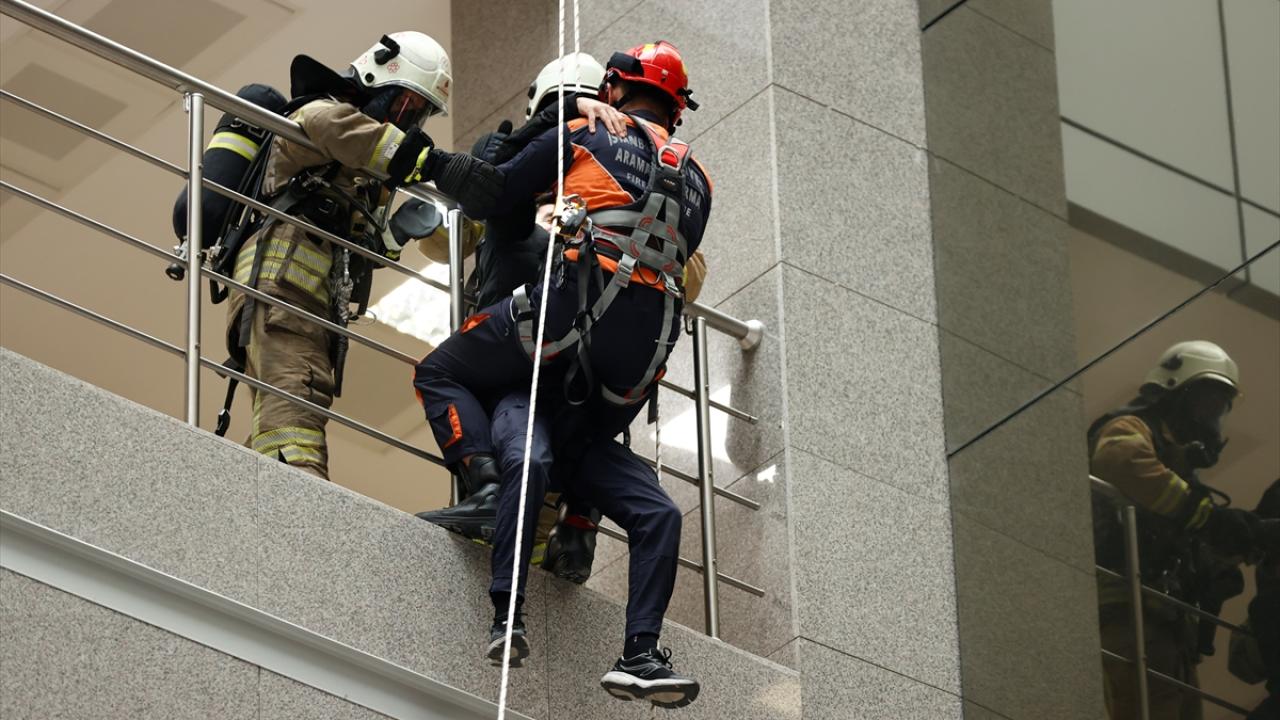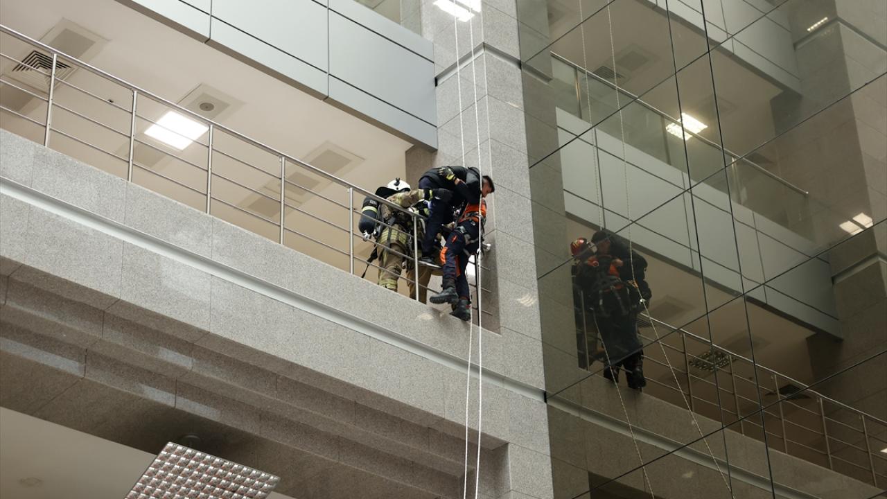 Tatbikatta üst katlarda bulunan bir odada mahsur kalan kişi, adliye önüne getirilen itfaiye merdiveniyle indirilerek, kurtarıldı.