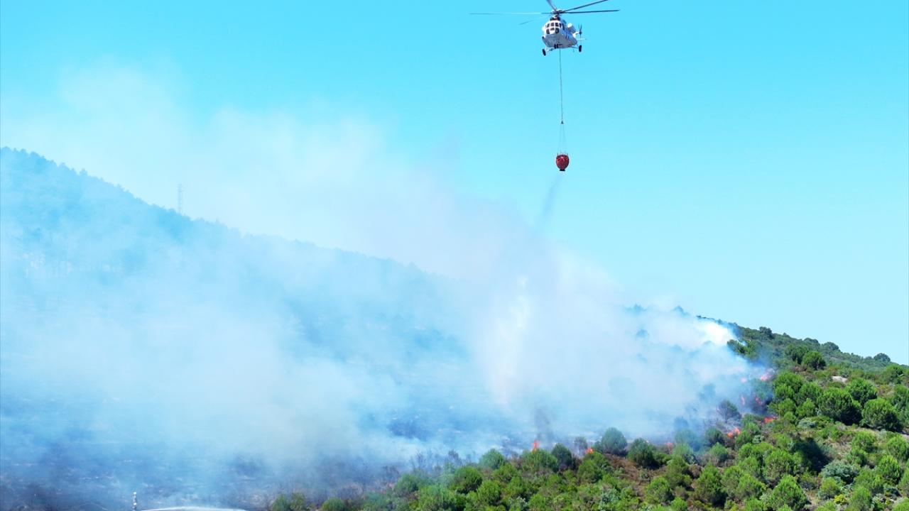 Ekiplerin yangına müdahalesi sürerken, yangın söndürme helikopteri de söndürme çalışmalarına havadan destek veriyor.
