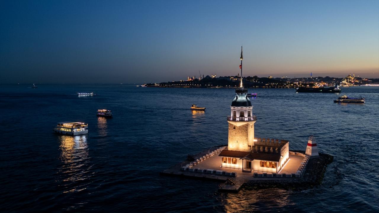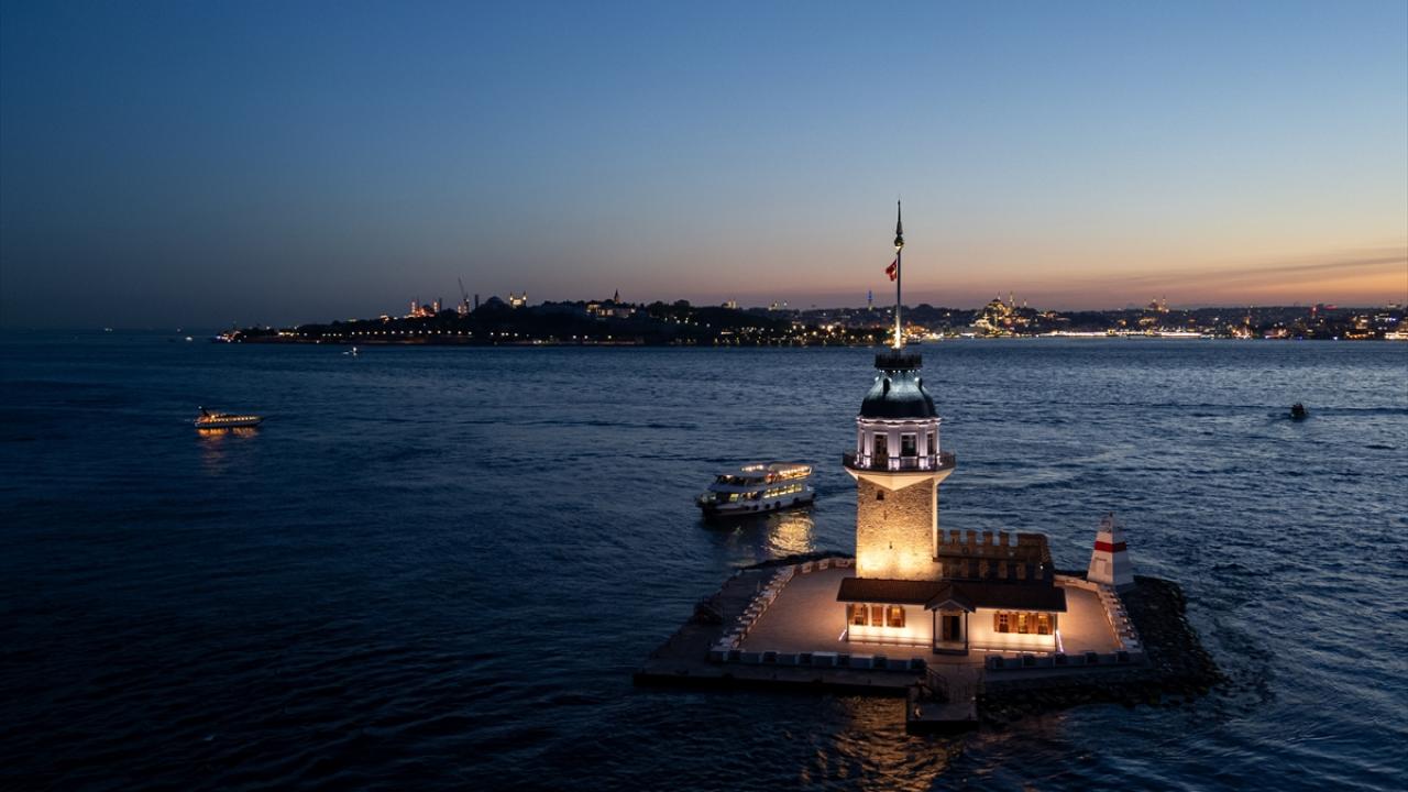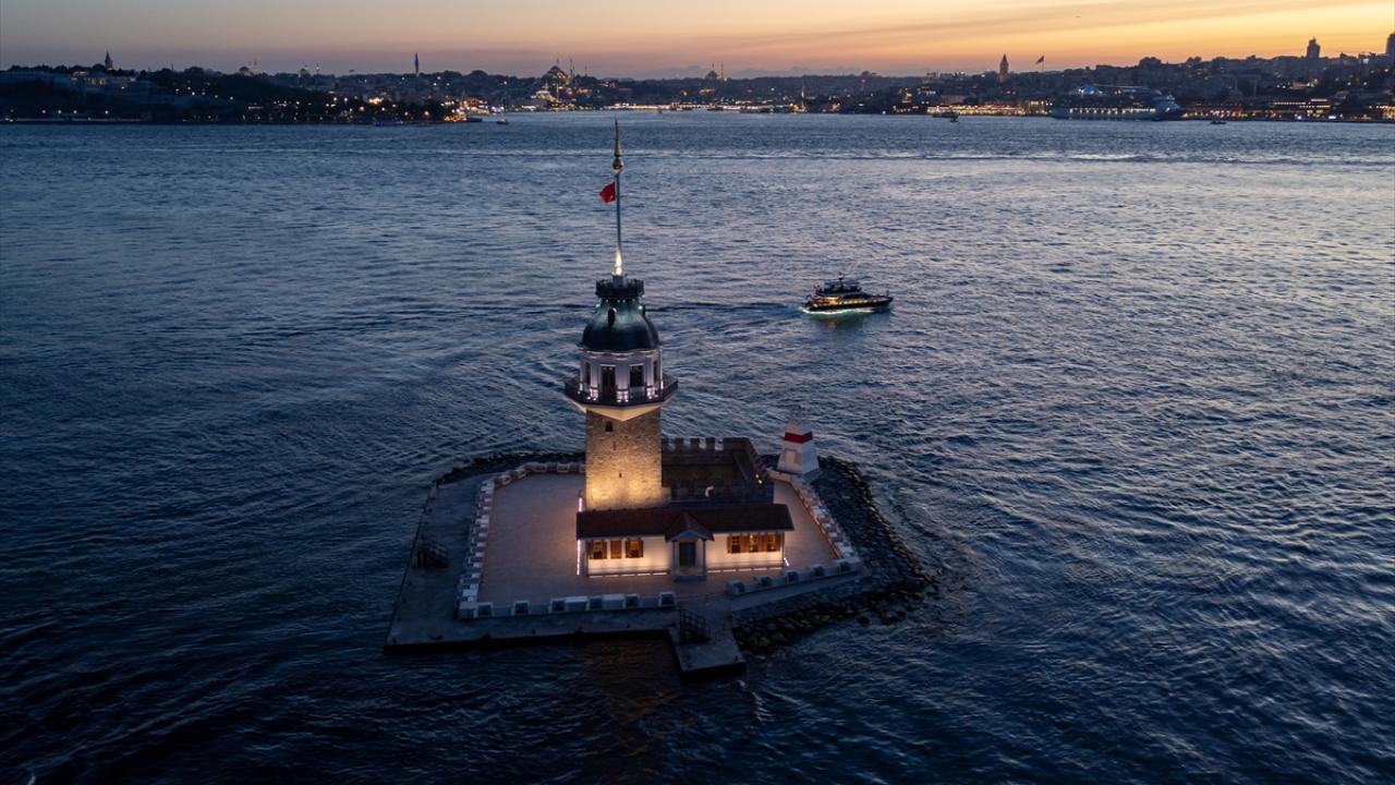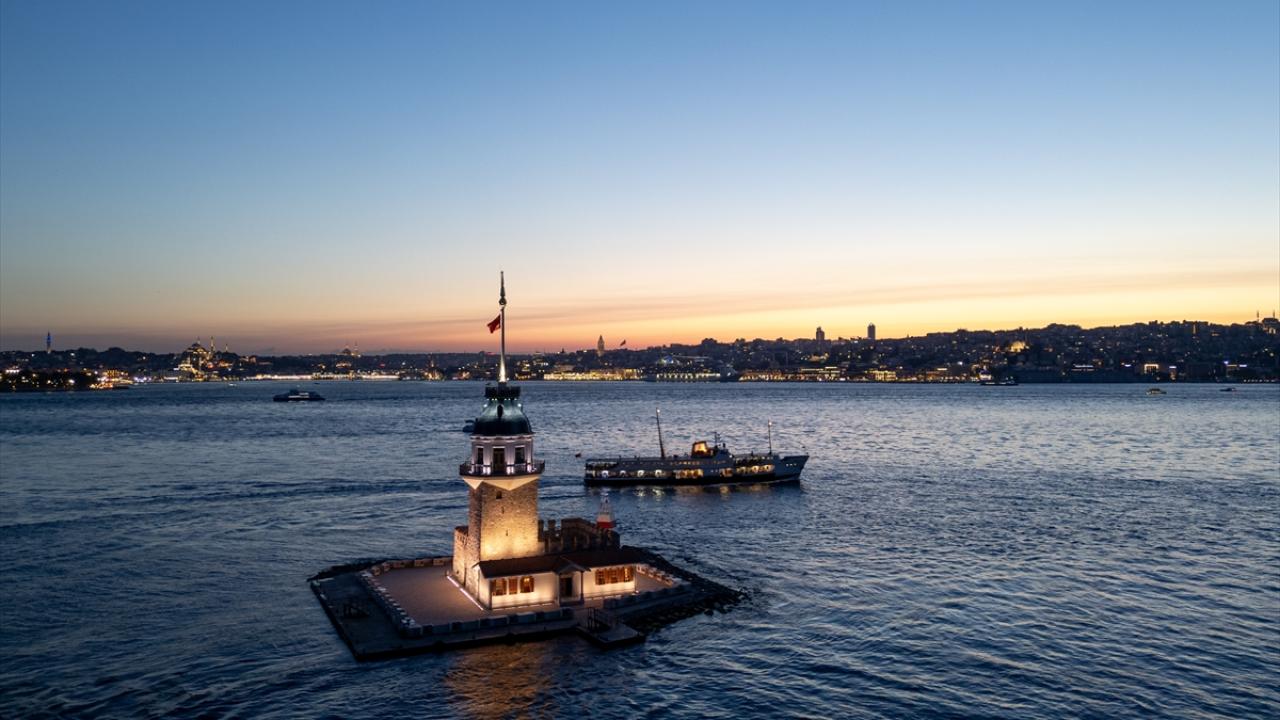 Denizle bütünleşen zarif mimarisi ve İstanbul silüetiyle uyumlu konumuyla Kız Kulesi, akşam saatlerinde havadan görüntülendi.