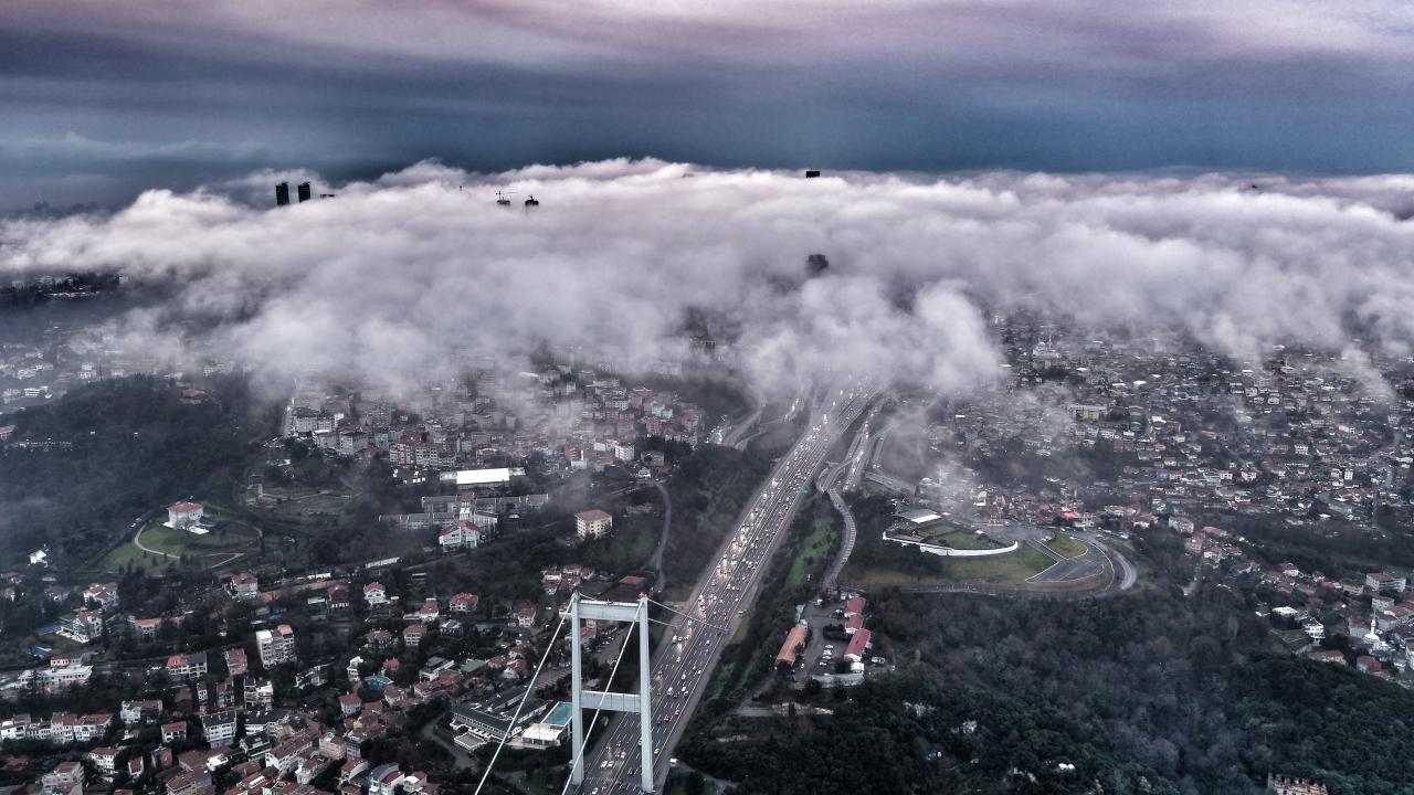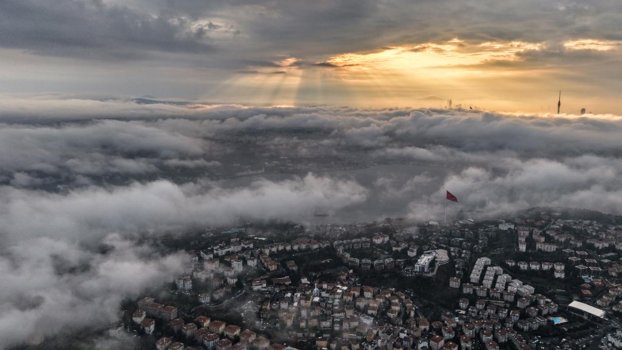 İstanbul, sabah saatlerinde etkili olan yoğun sis ve alçak bulutlarla birlikte eşsiz manzaralara sahne oldu. Gün doğumuyla beraber şehrin simge noktaları, bulutların üzerine çıkarak adeta gökyüzünde süzülen yapılar gibi göründü.