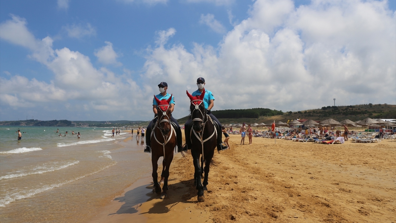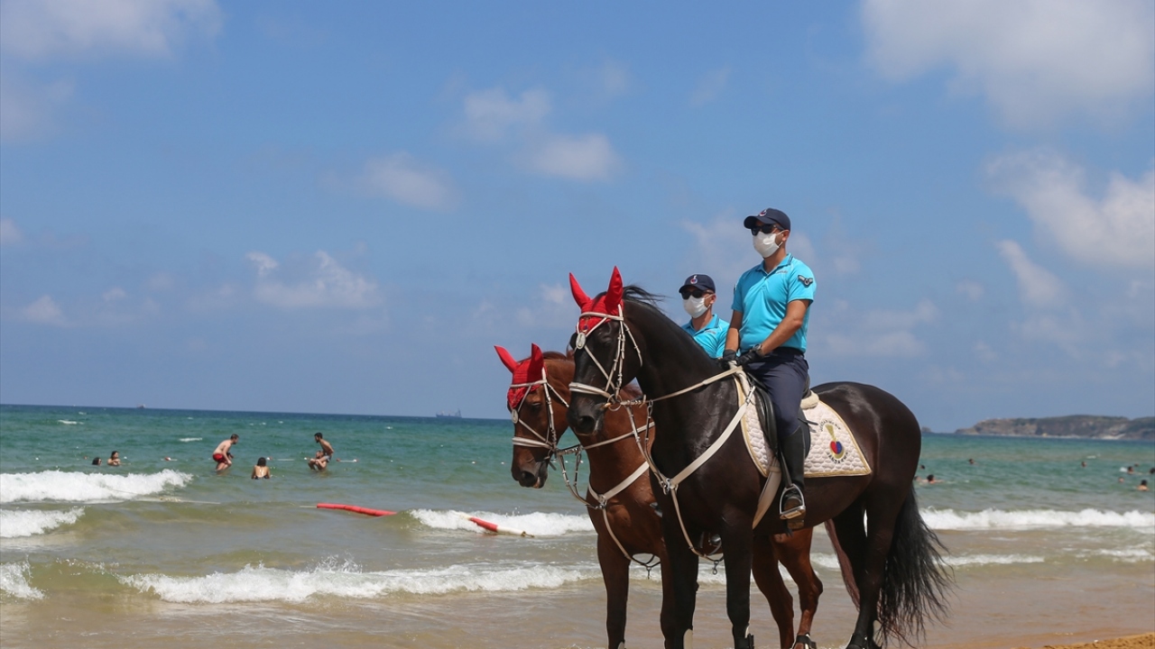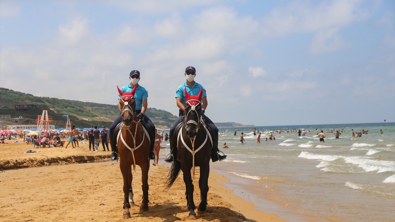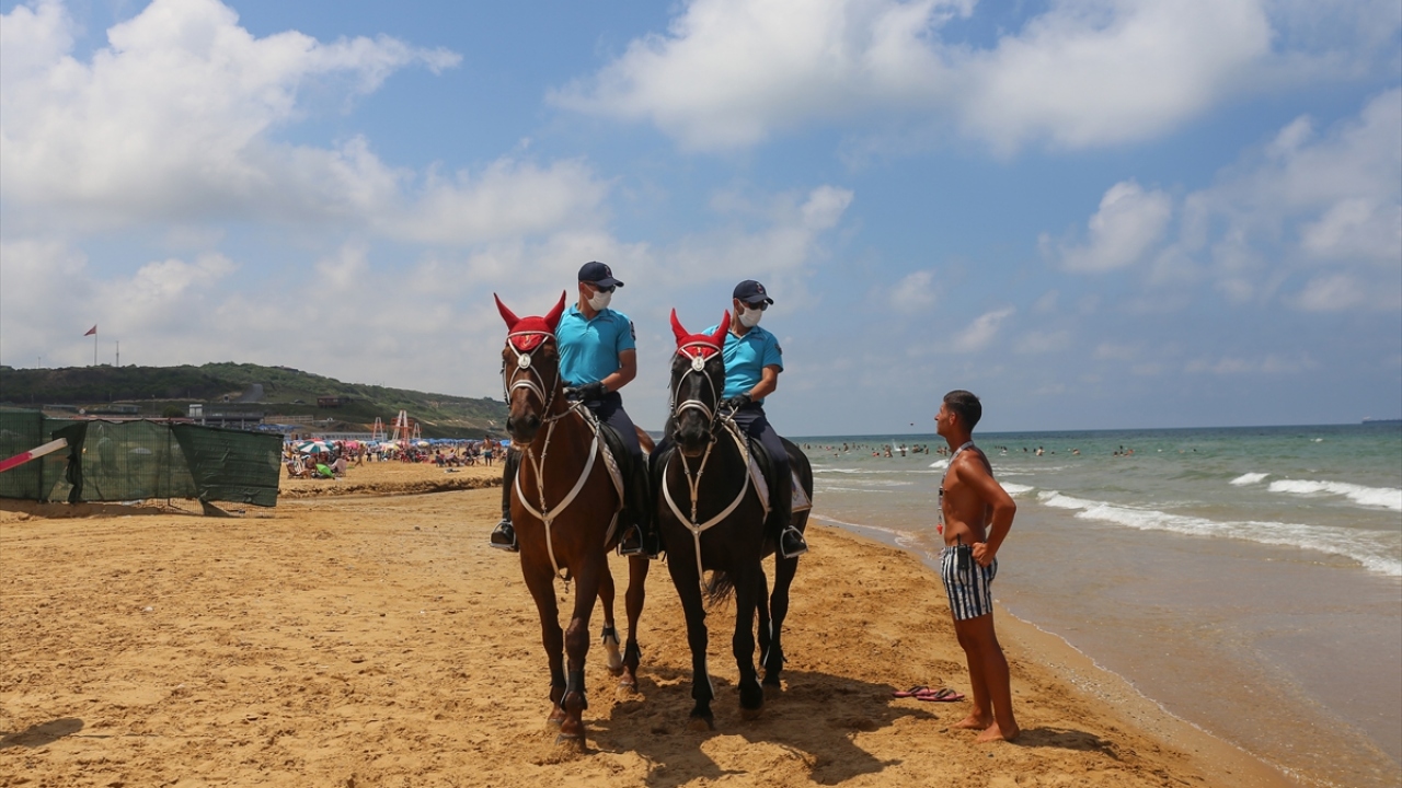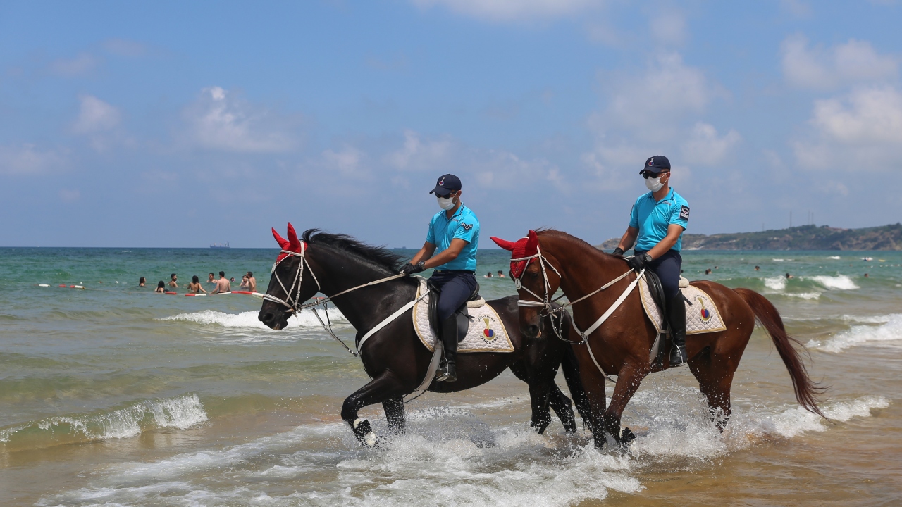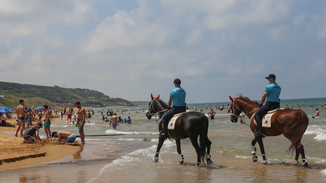 İstanbul İl Jandarma Komutanlığı Atlı Jandarma Timleri ile Yaya Jandarma devriyeleri, yeni tip koronavirüs (Kovid-19) tedbirleri kapsamında, Sarıyer Gümüşdere Plajı'nda sosyal mesafenin korunması ve maske takılması konusunda uygulama gerçekleştirdi.