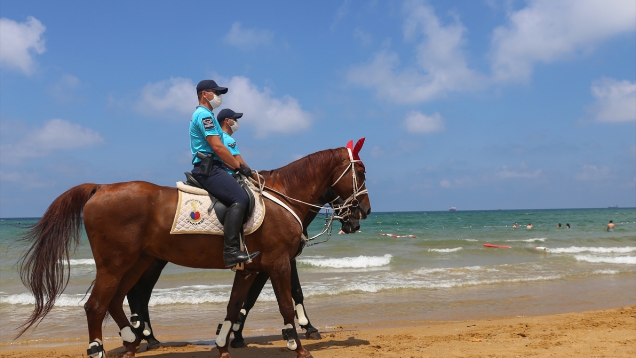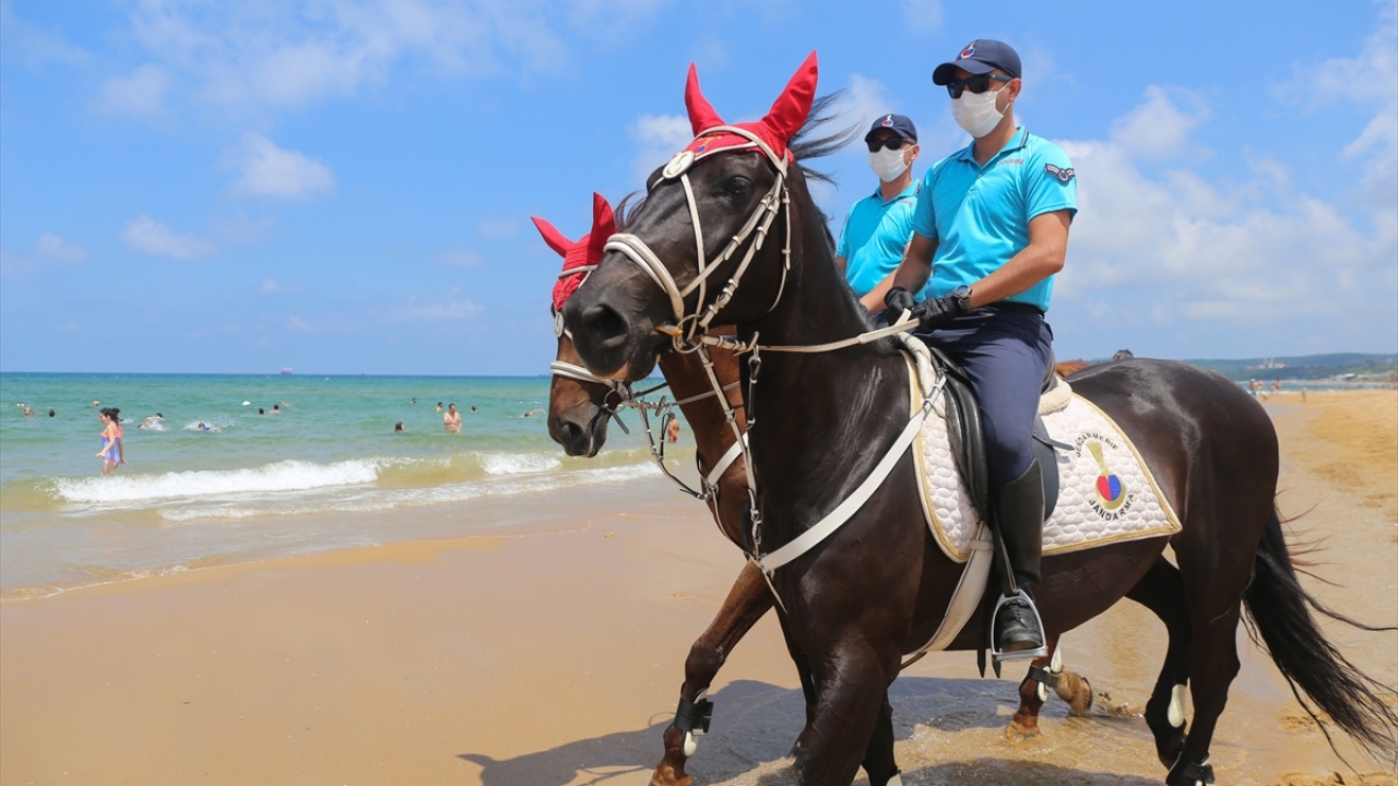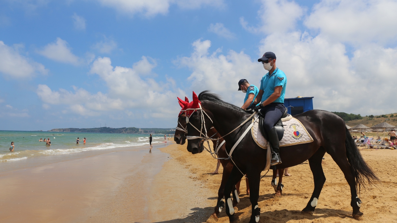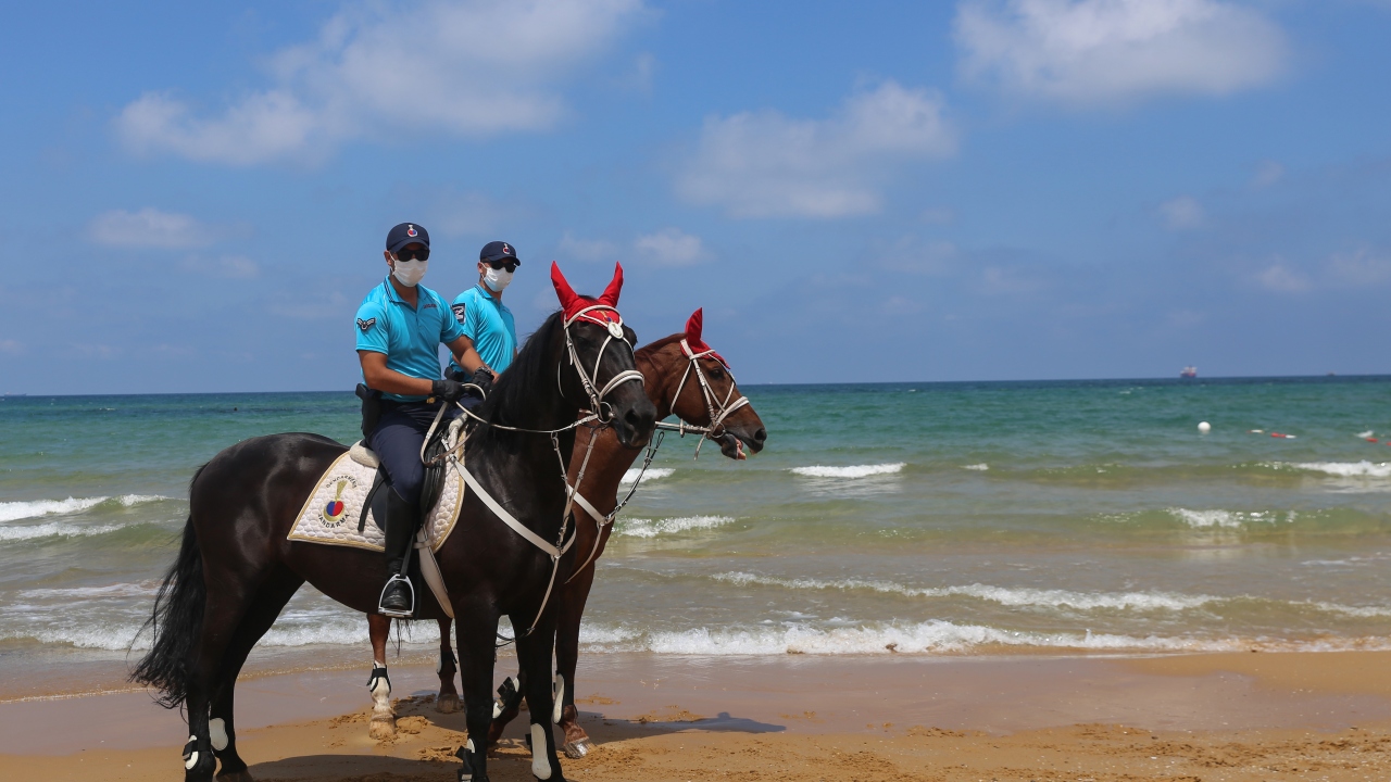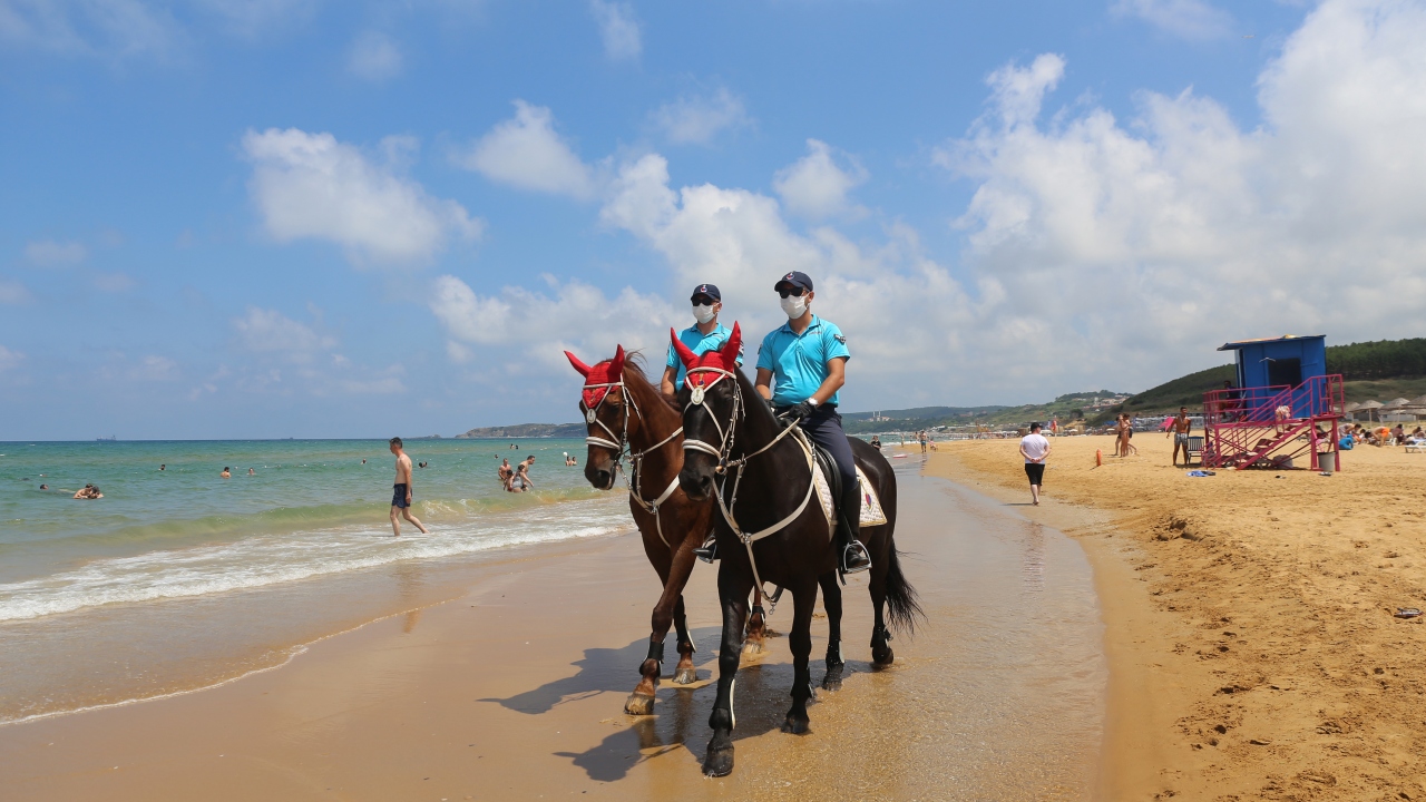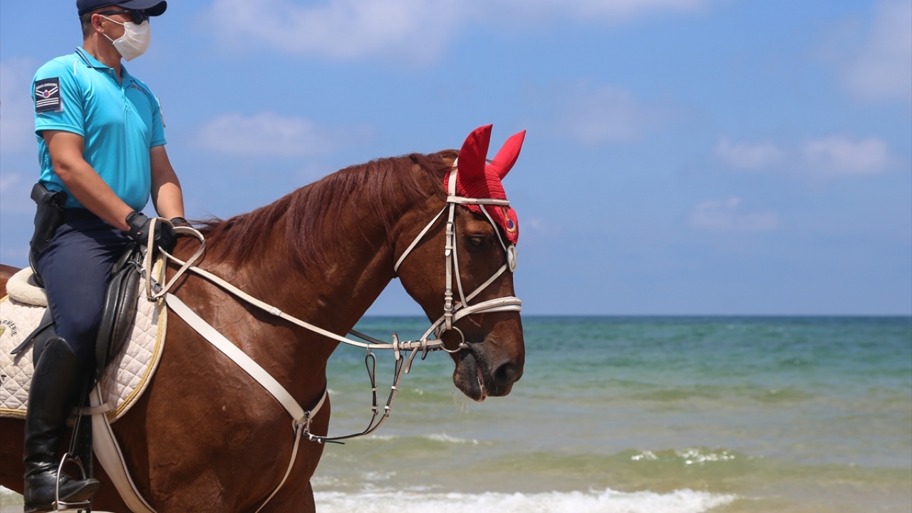 İstanbul İl Jandarma Komutanlığı Atlı Jandarma Timleri ile Yaya Jandarma devriyeleri, yeni tip koronavirüs (Kovid-19) tedbirleri kapsamında, Sarıyer Gümüşdere Plajı'nda sosyal mesafenin korunması ve maske takılması konusunda uygulama gerçekleştirdi.