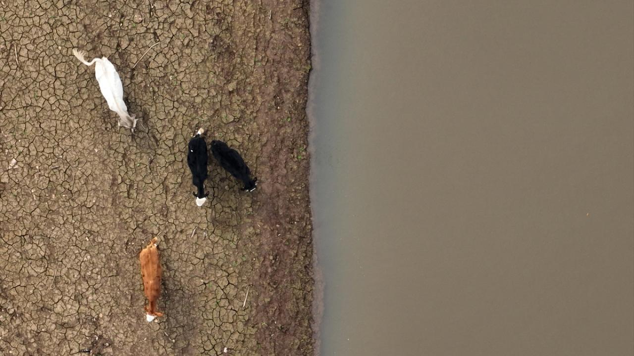 Havadan görüntülenen Darlık ve Alibey barajlarında daha önce su olan bölgelerden, suların çekildiği görülüyor. Çekilen bölgelerde büyükbaş hayvanların otladıkları görüldü.