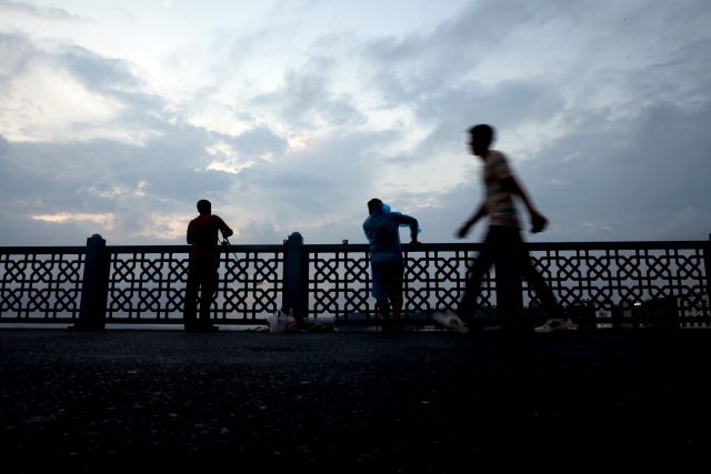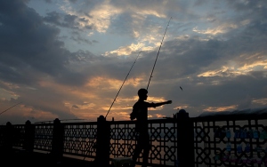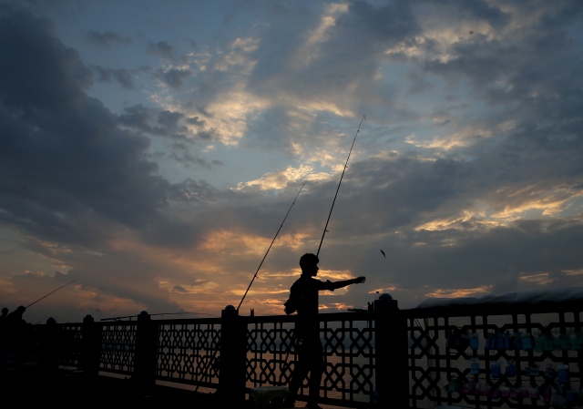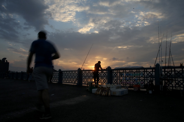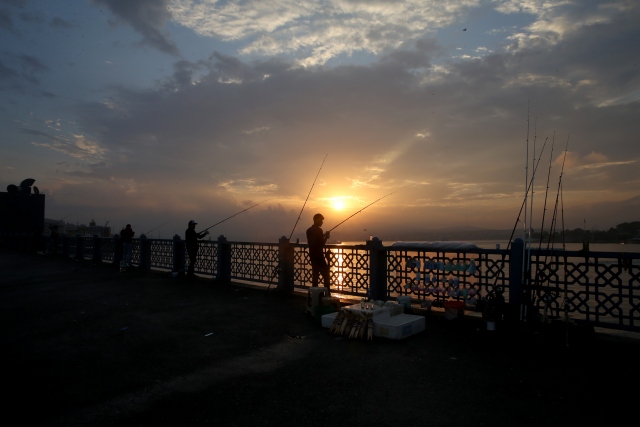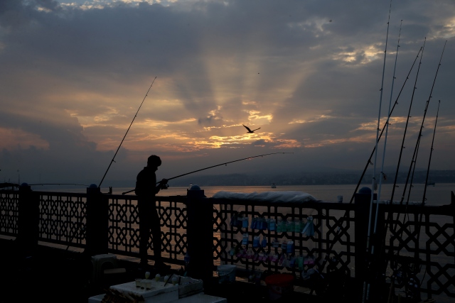 İstanbul'da etkili olan bulutlu havada sabahın ilk ışıkları ile Galata Köprüsü üzerindeki balıkçılar güzel görüntüler oluşturdu.
