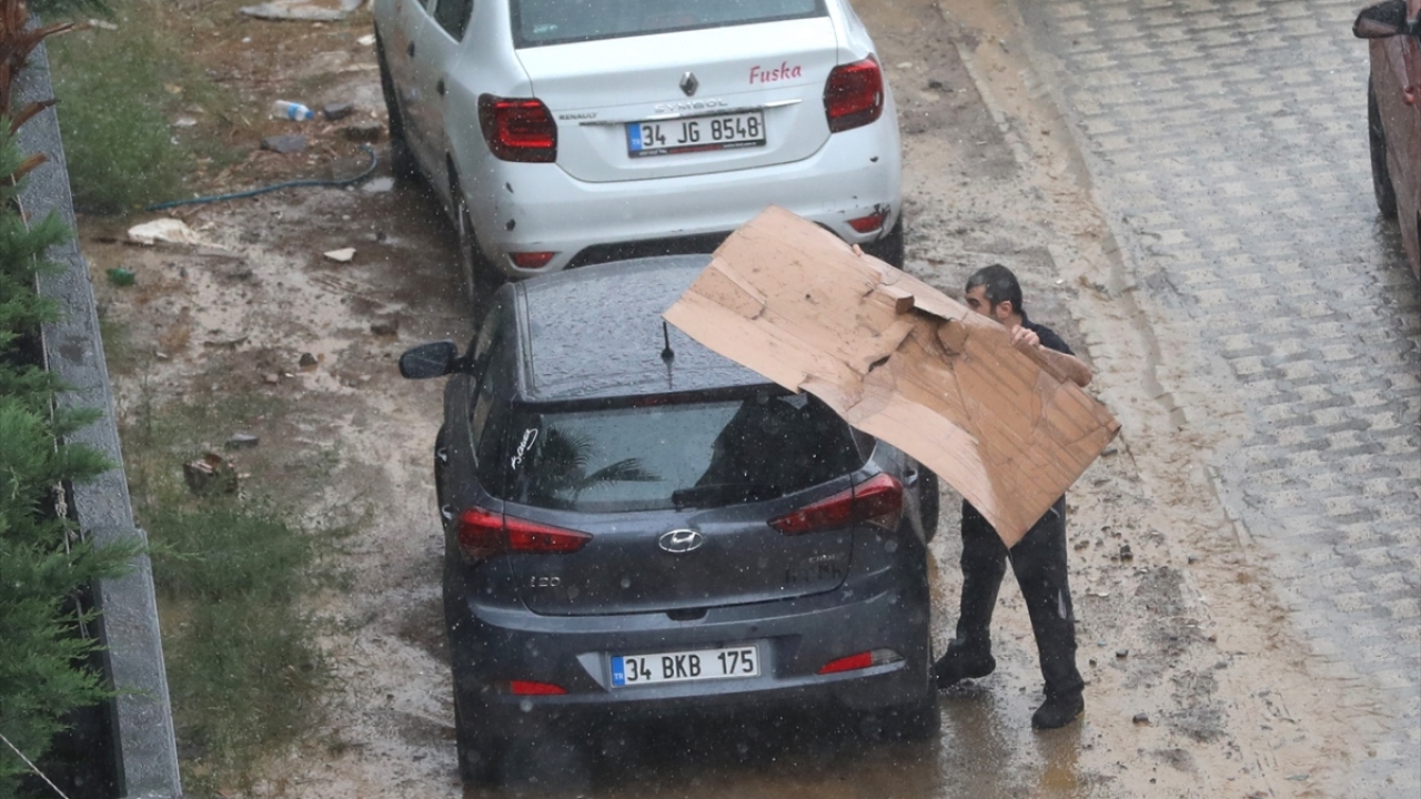 Bazı vatandaşlar, kısa süreli dolu yağışı sırasında araçlarını korumaya çalıştı.