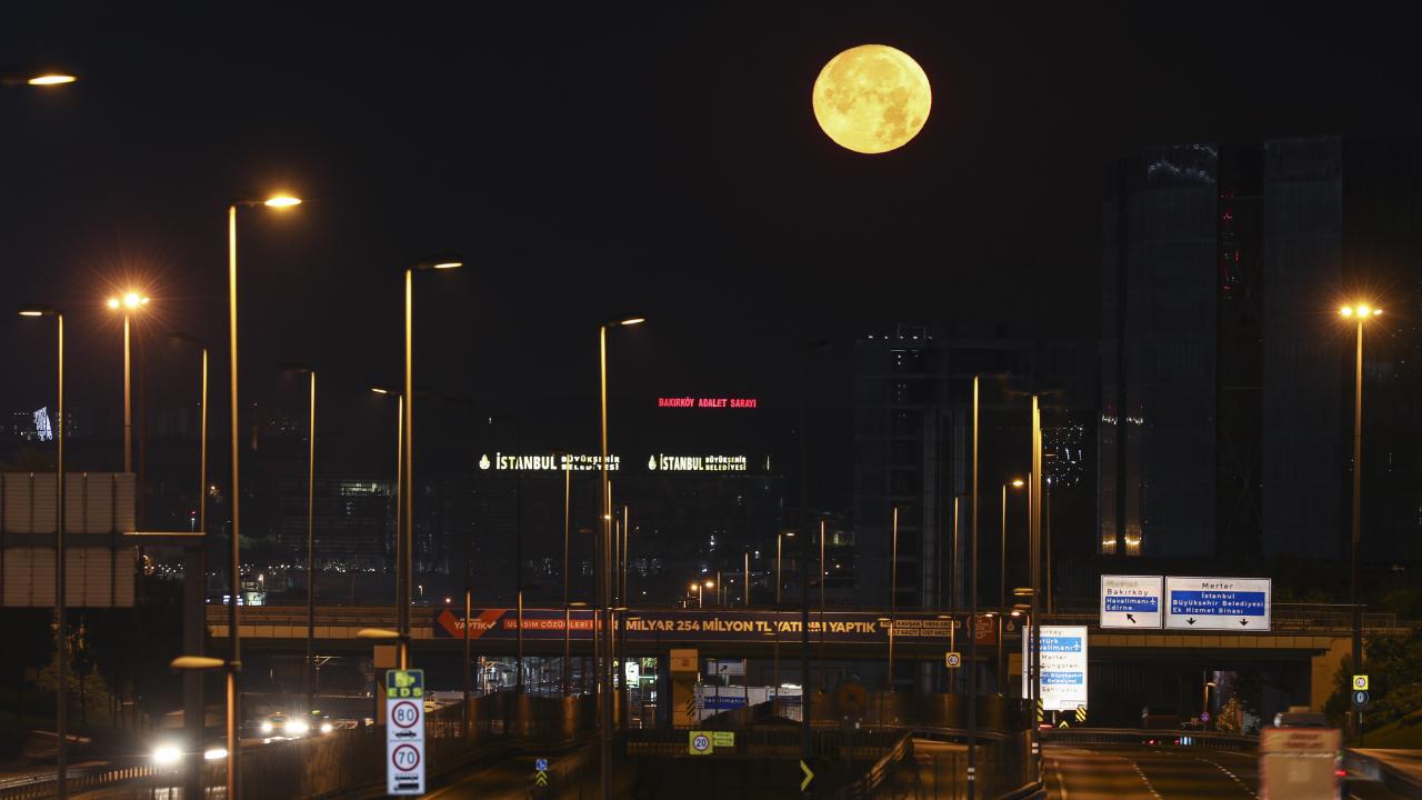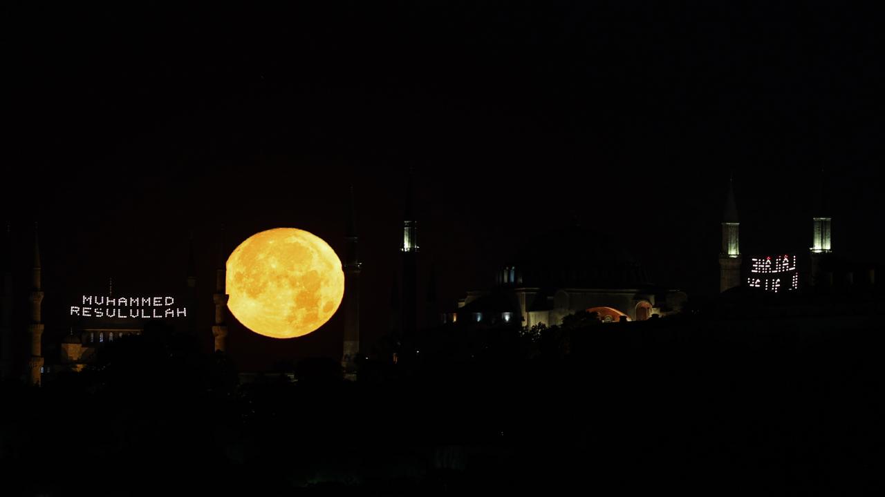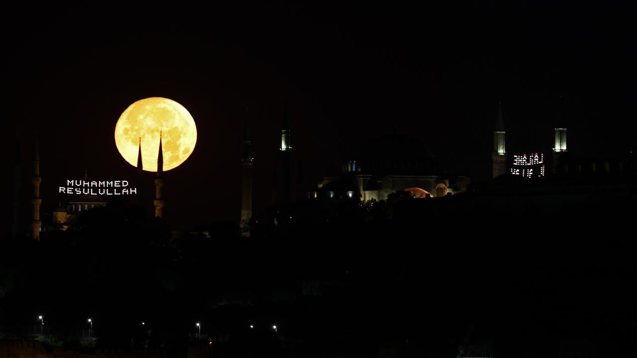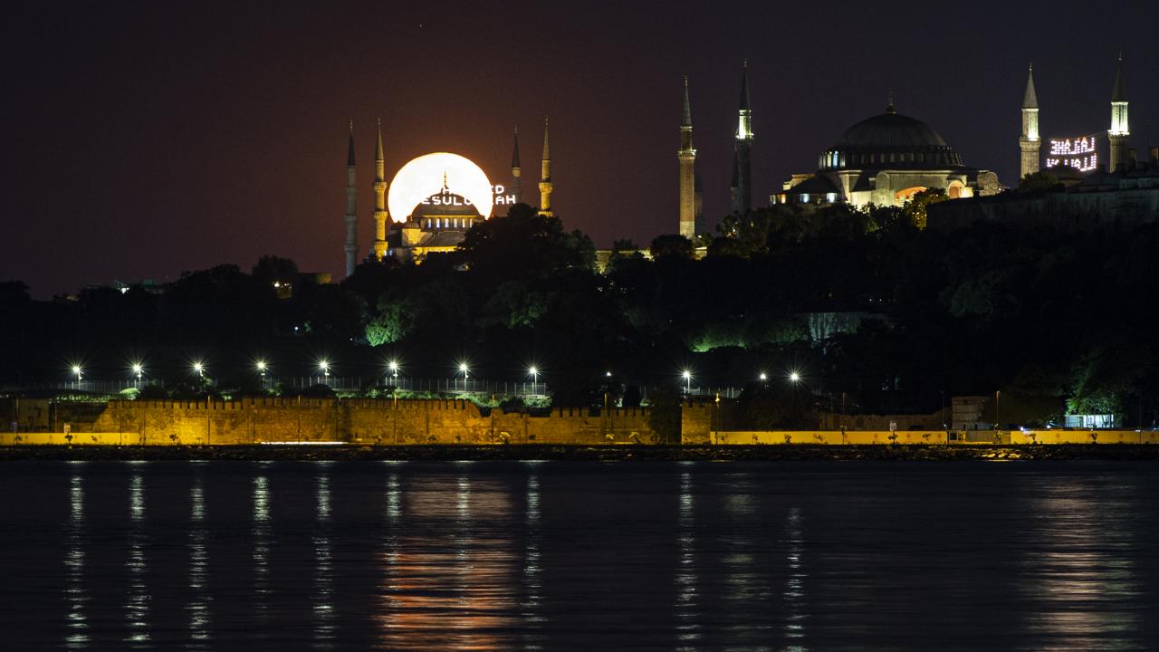 Dolunay, İstanbul'da Sultanahmet Camisi ve Ayasofya-i Kebir Cami-i Şerifi ile güzel görüntü oluşturdu.