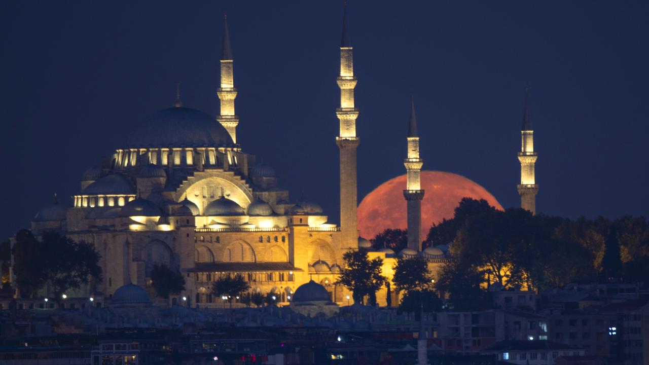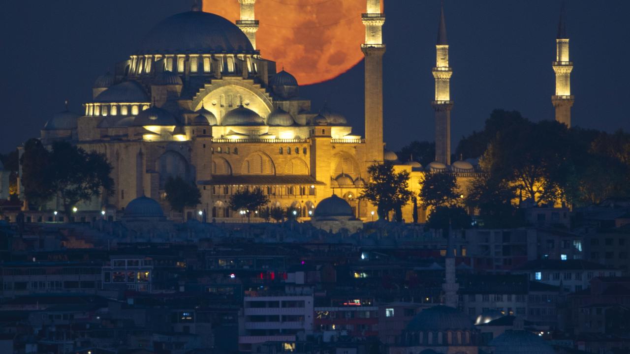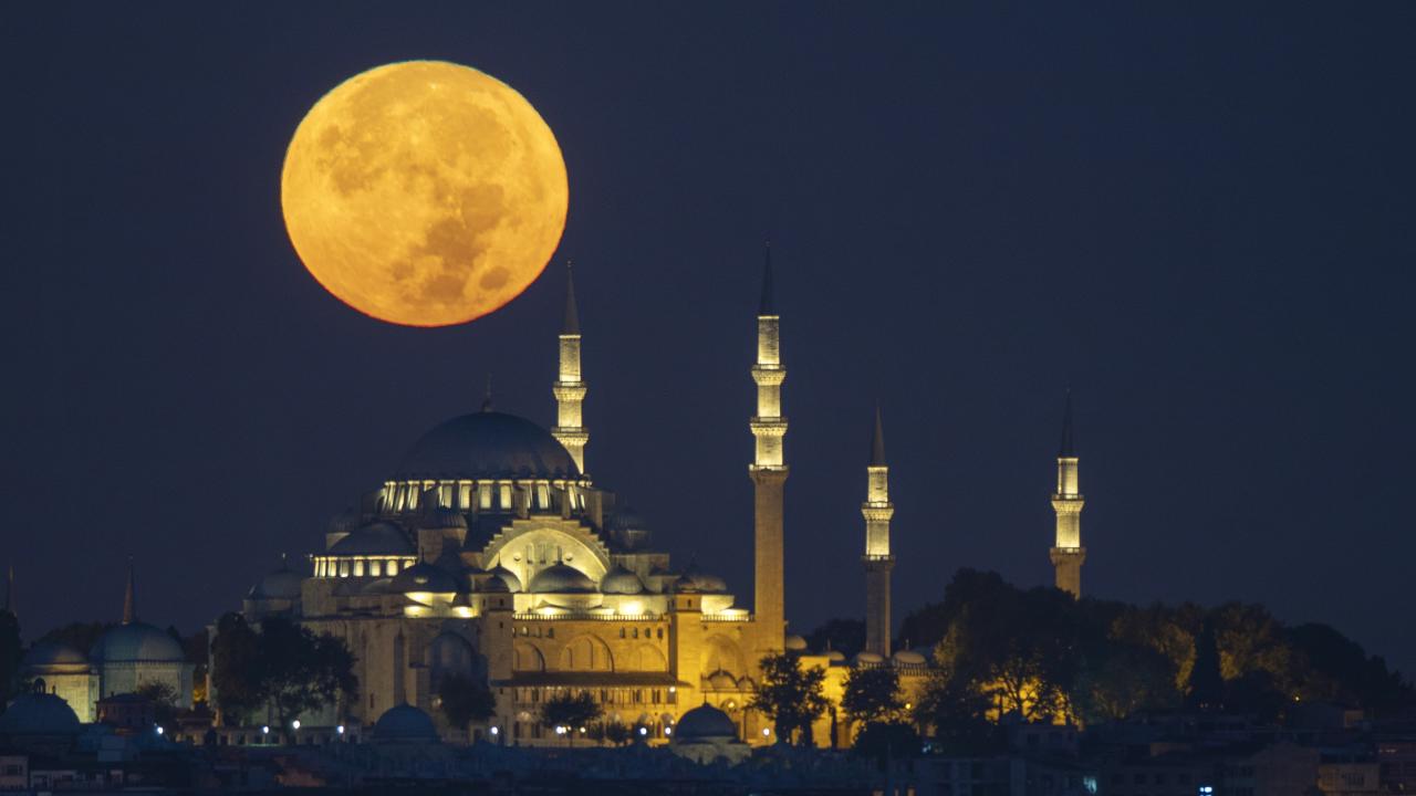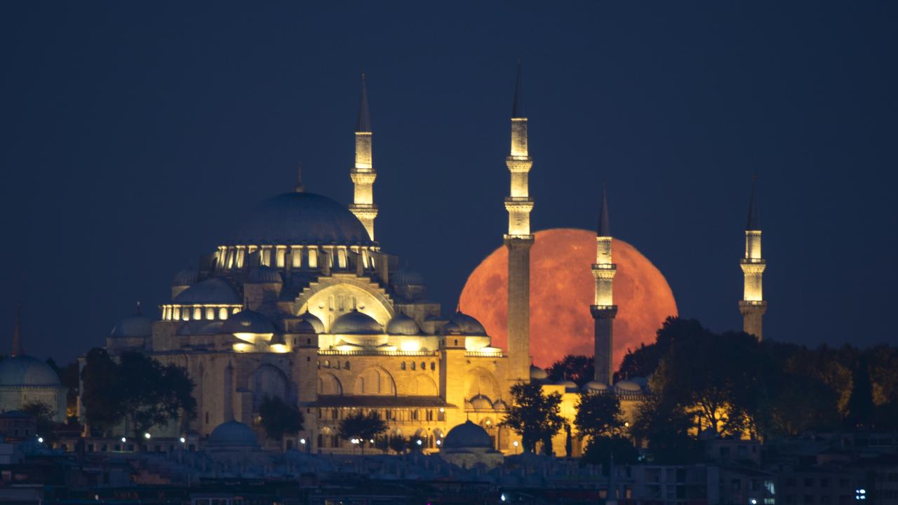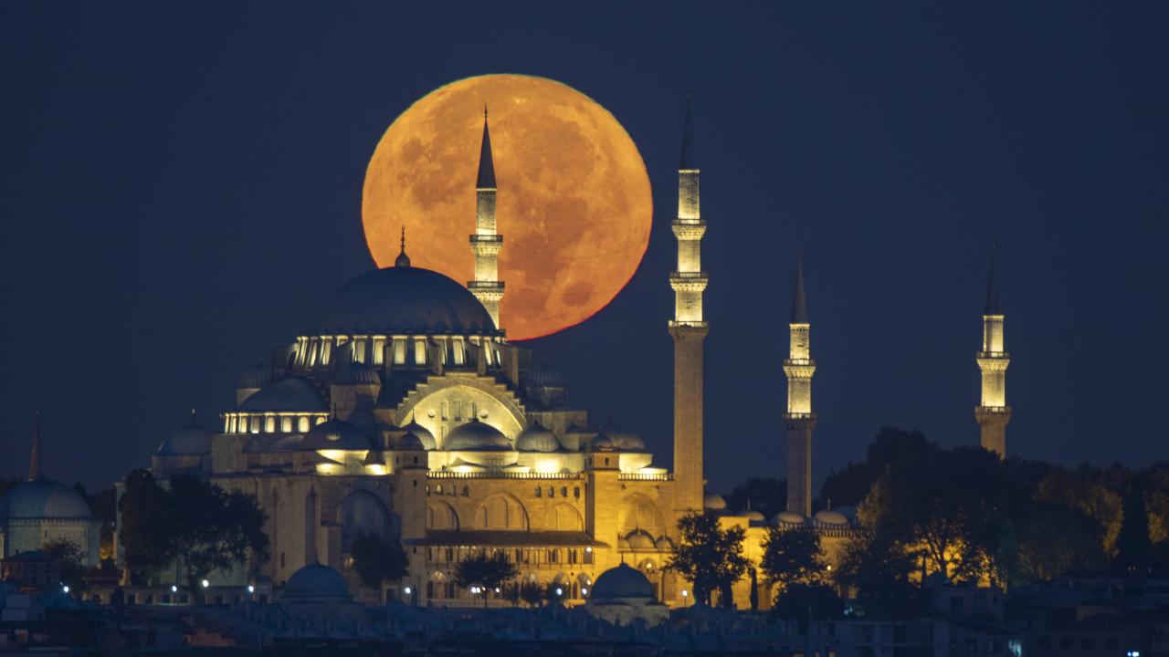 İstanbul'da dolunay, Süleymaniye Camisi ile güzel görüntü oluşturdu.