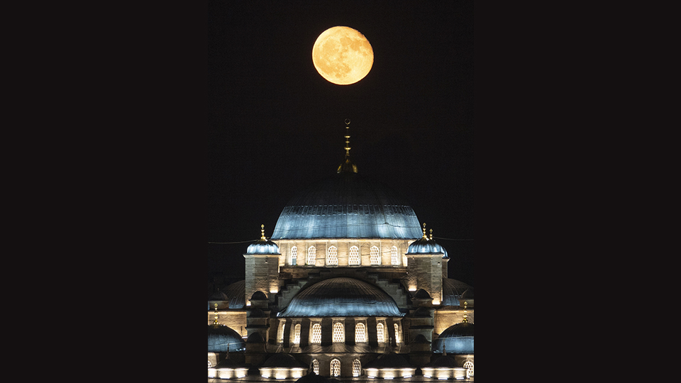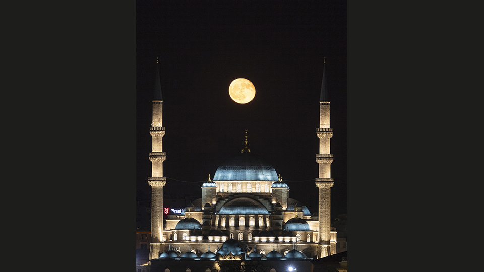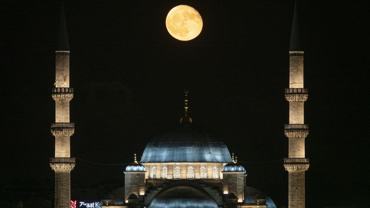 İstanbul`da dolunay, Eminönü`ndeki Yeni Cami ile birlikte görüntülendi.