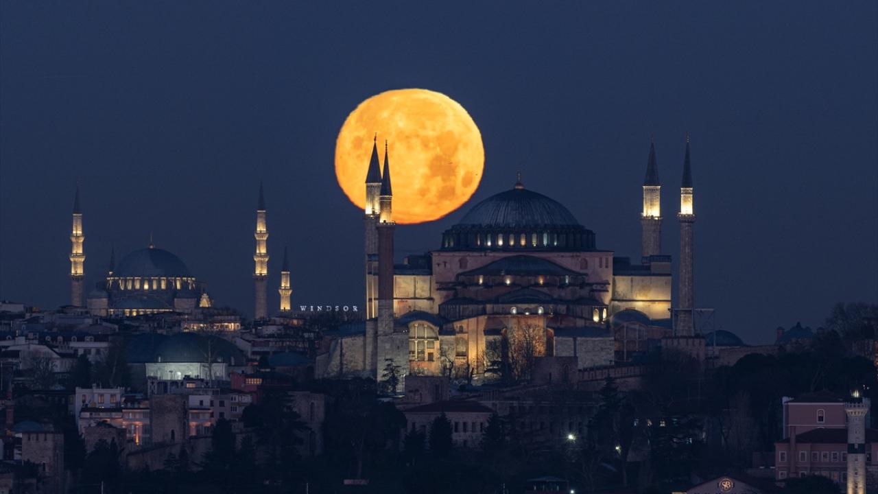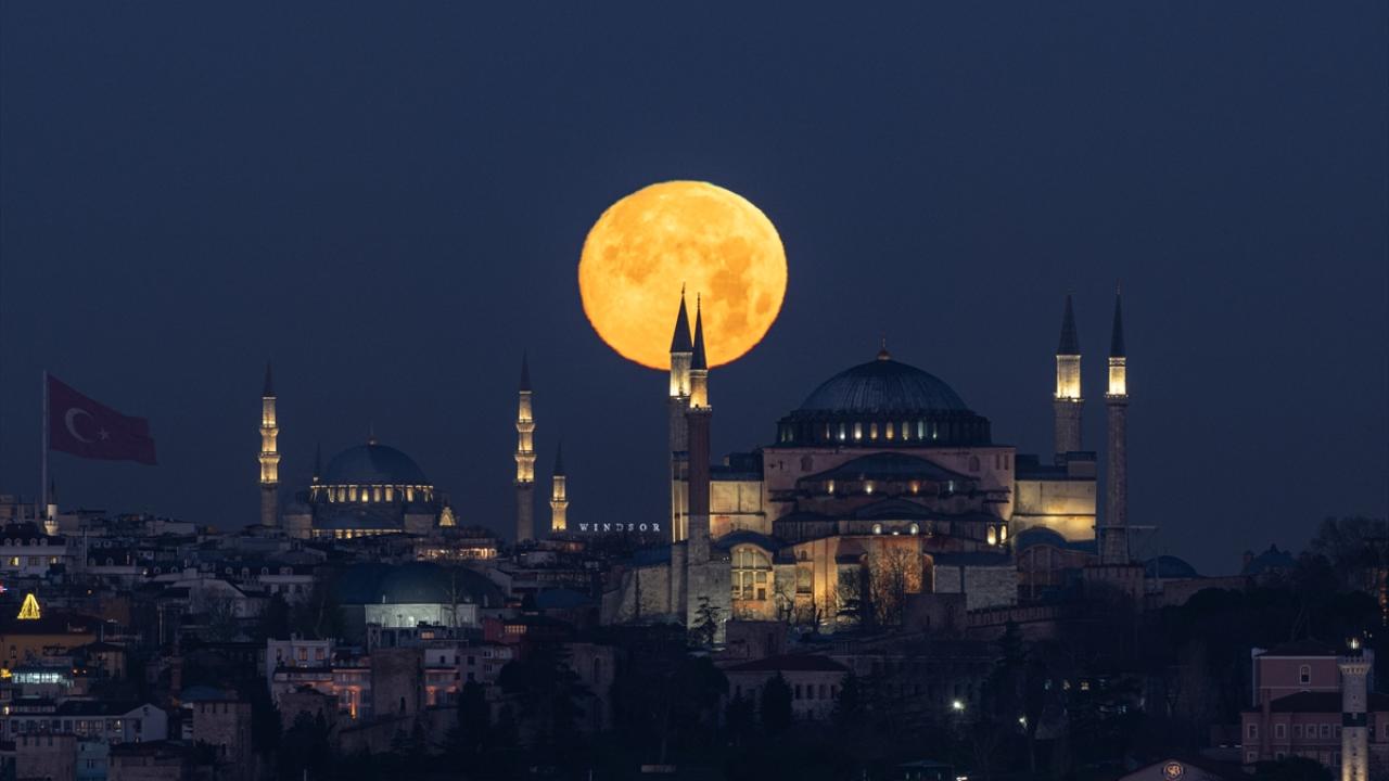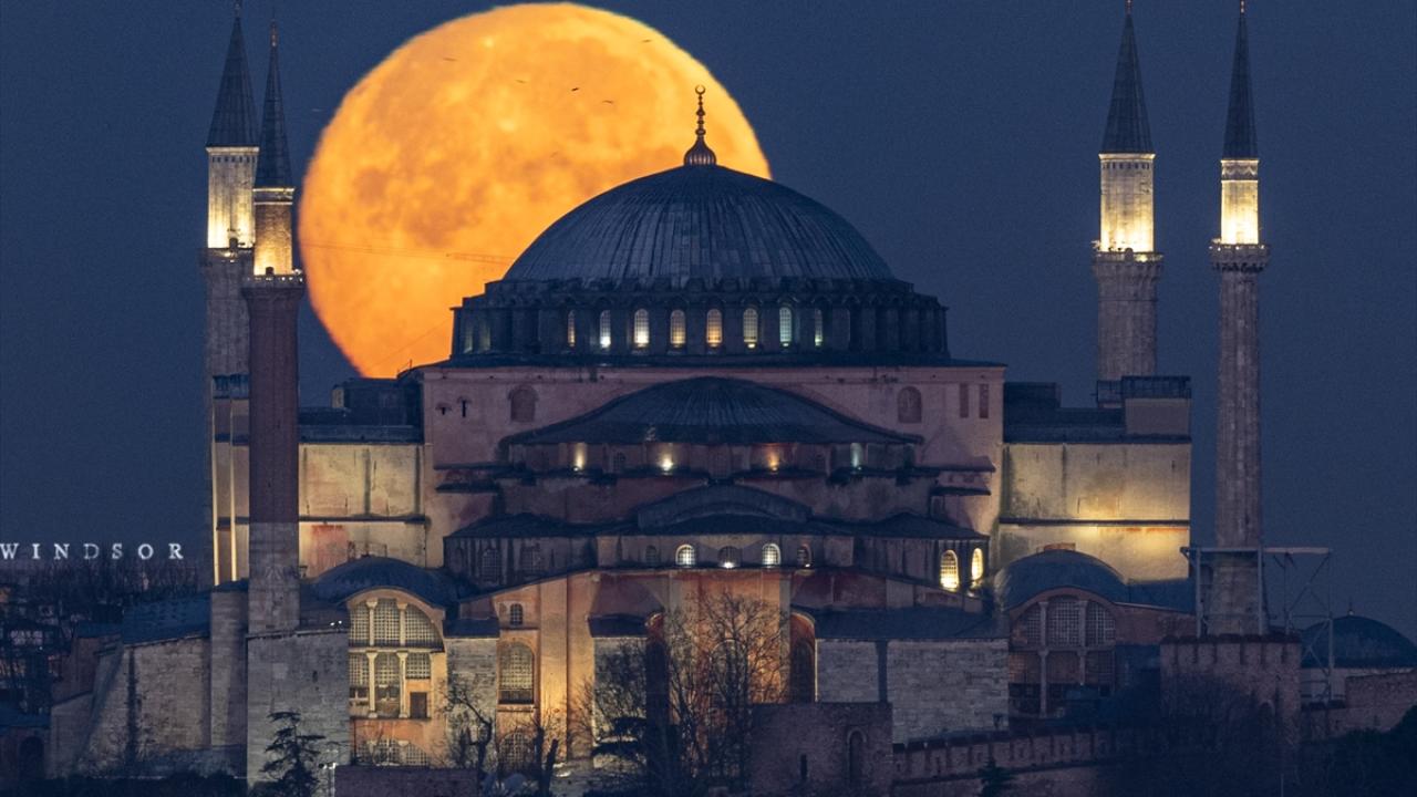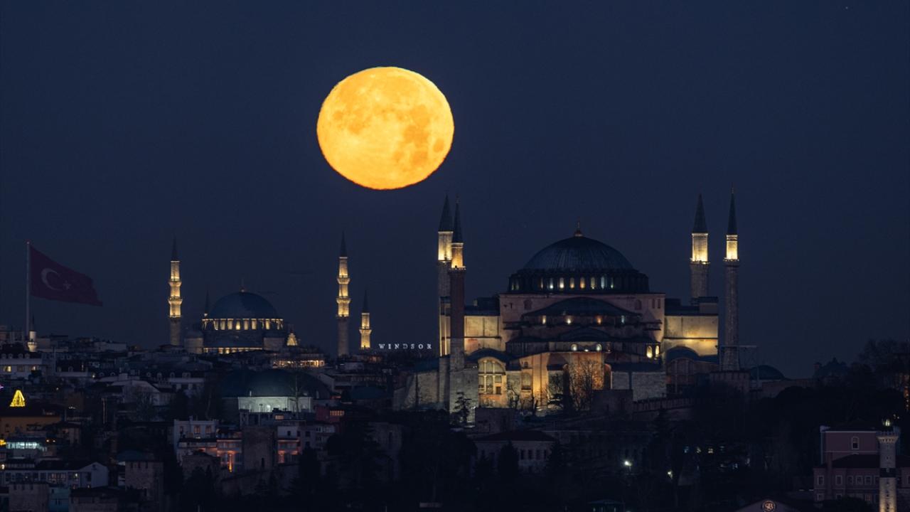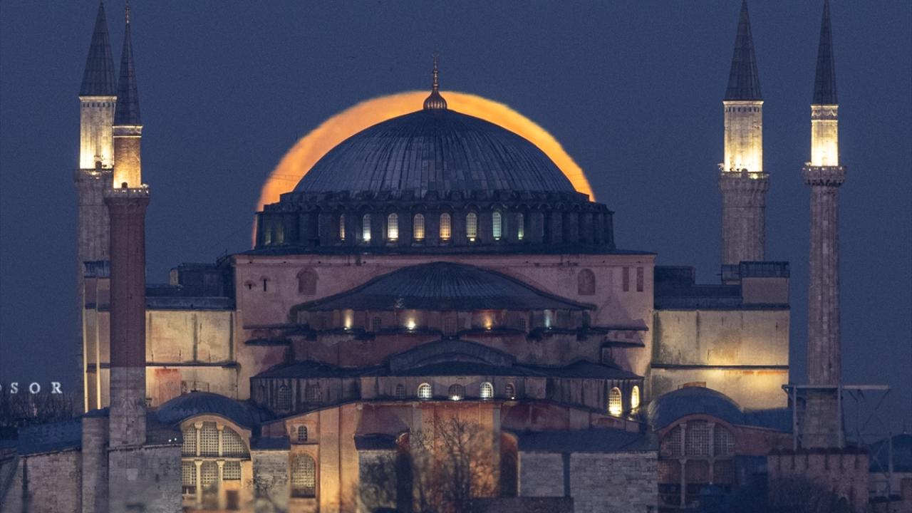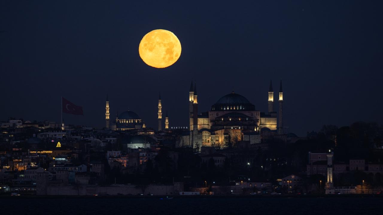 İstanbul'da dolunay, Ayasofya-i Kebir Camii Şerifi ile birlikte görüntülendi.