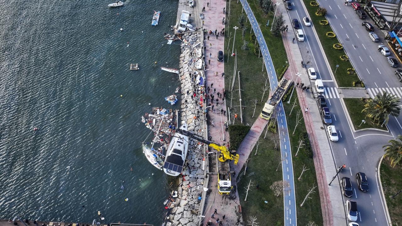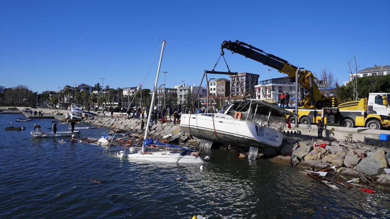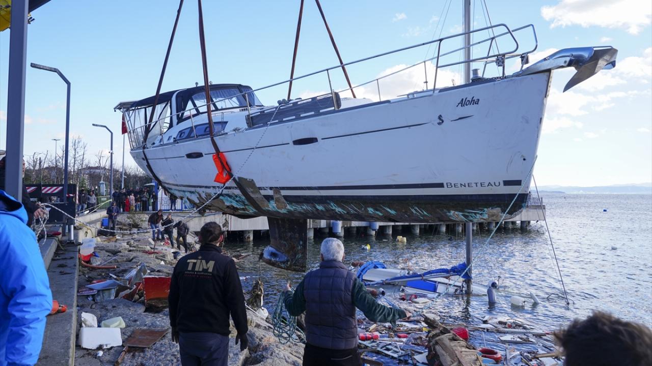 Tuzla`da, dün kuvvetli fırtına nedeniyle alabora olan, kıyıya çarparak batan ve zarar gören teknelerin kaldırılması için başlatılan çalışmalar devam ediyor.