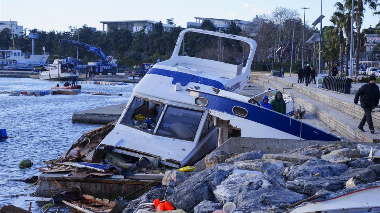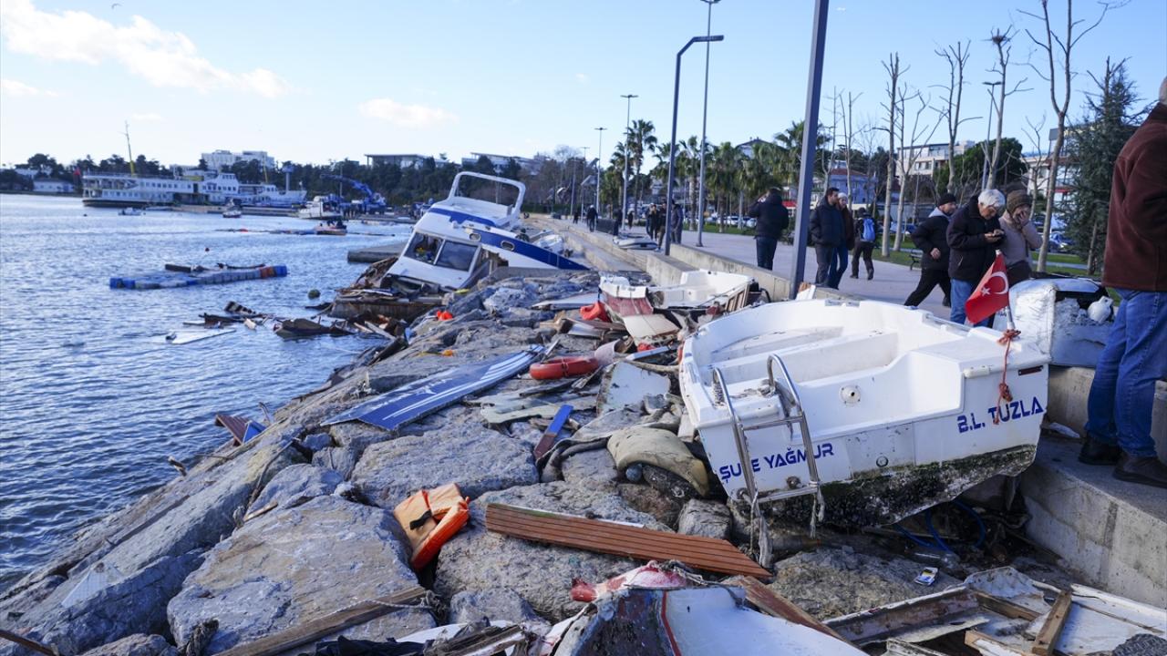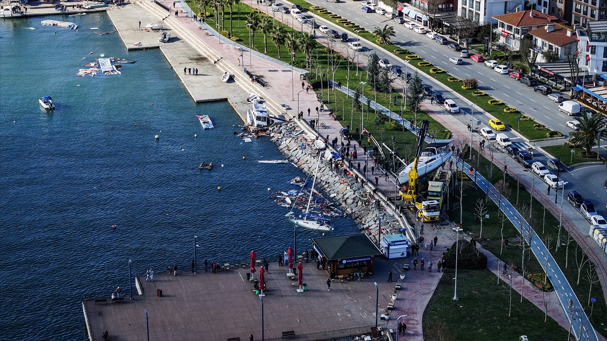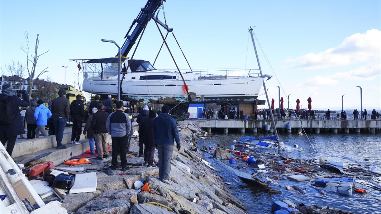 Tuzla`da, dün kuvvetli fırtına nedeniyle alabora olan, kıyıya çarparak batan ve zarar gören teknelerin kaldırılması için başlatılan çalışmalar devam ediyor.