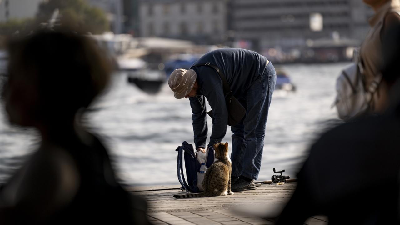 Sahilde balık tutan kişiye, bir kedi de eşlik etti