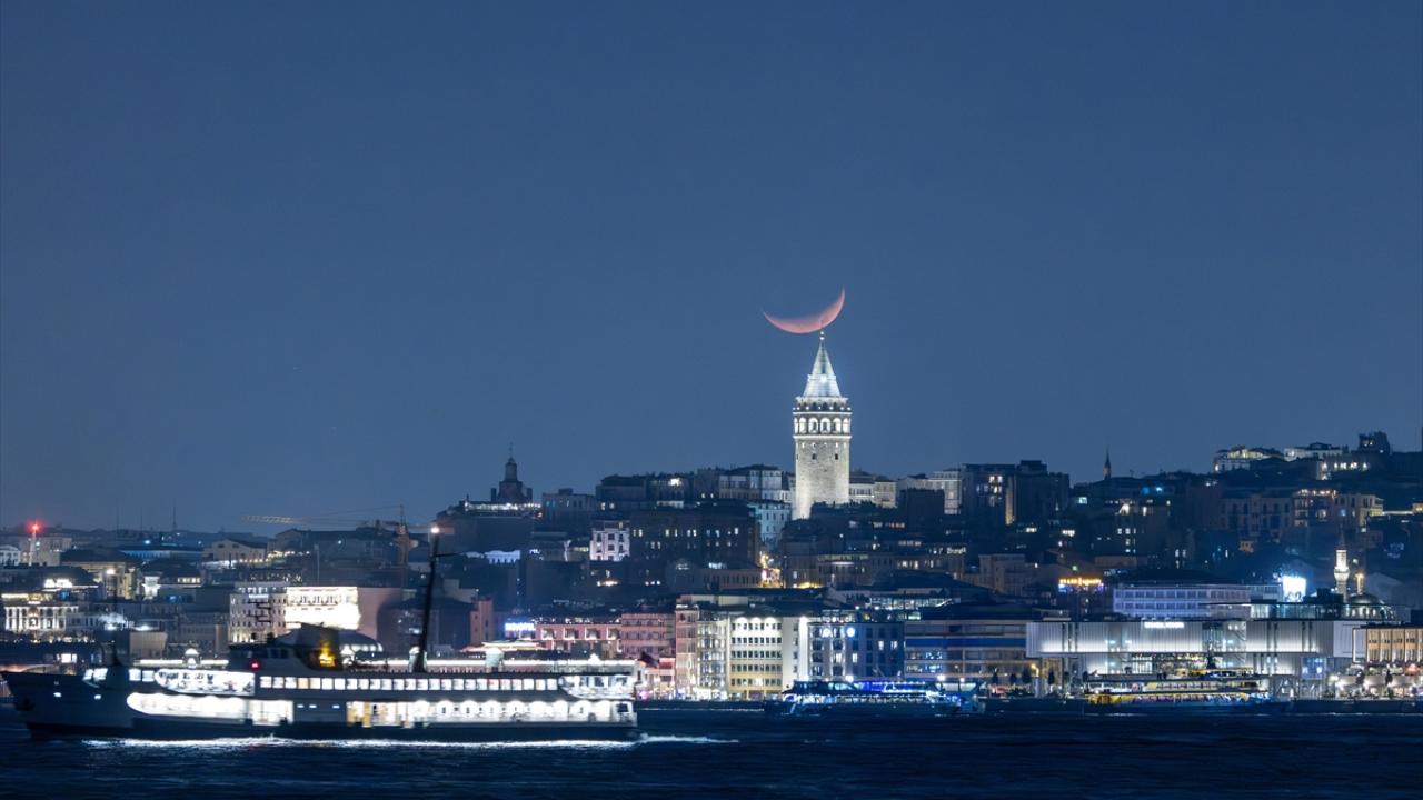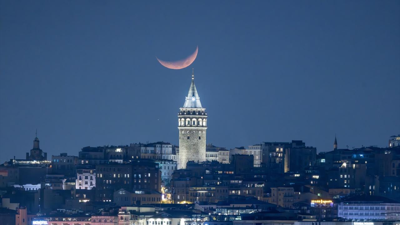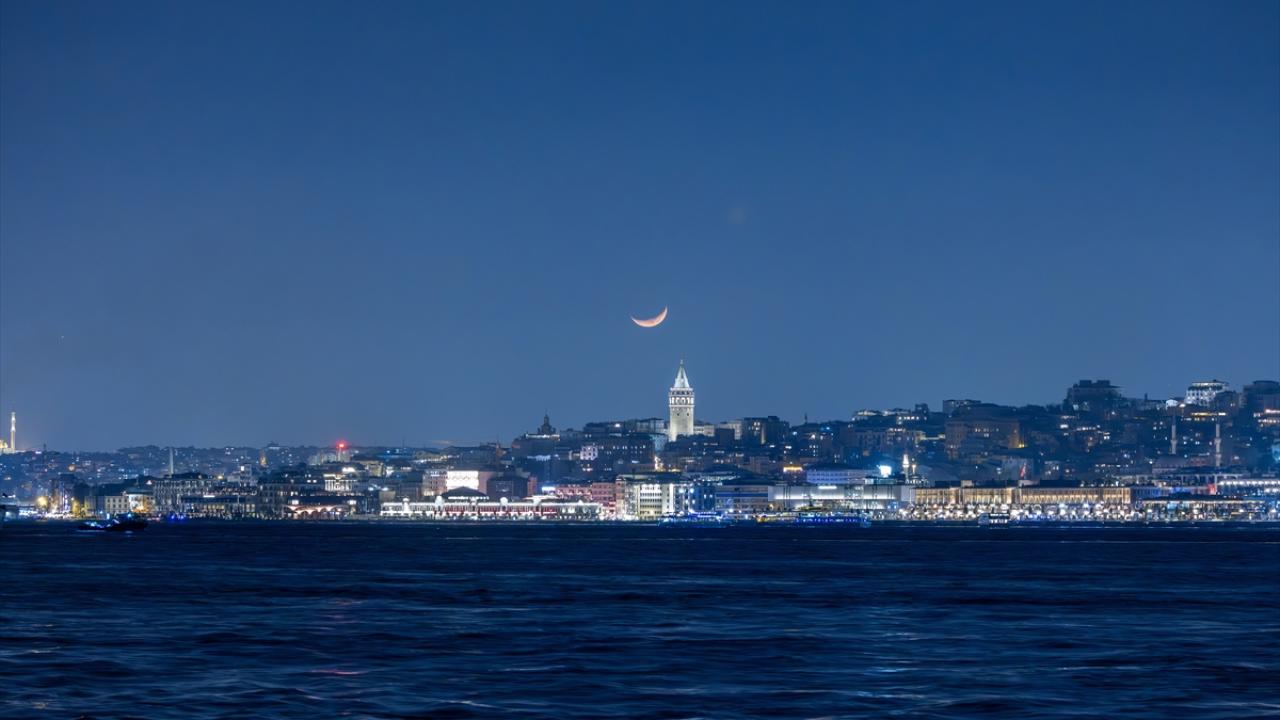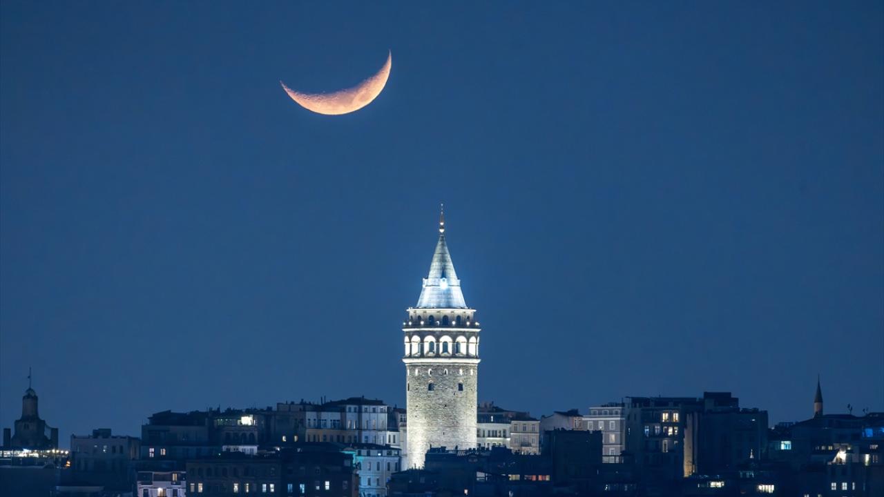 İstanbul'da hilal, Galata Kulesi ile birlikte güzel görüntü oluşturdu.