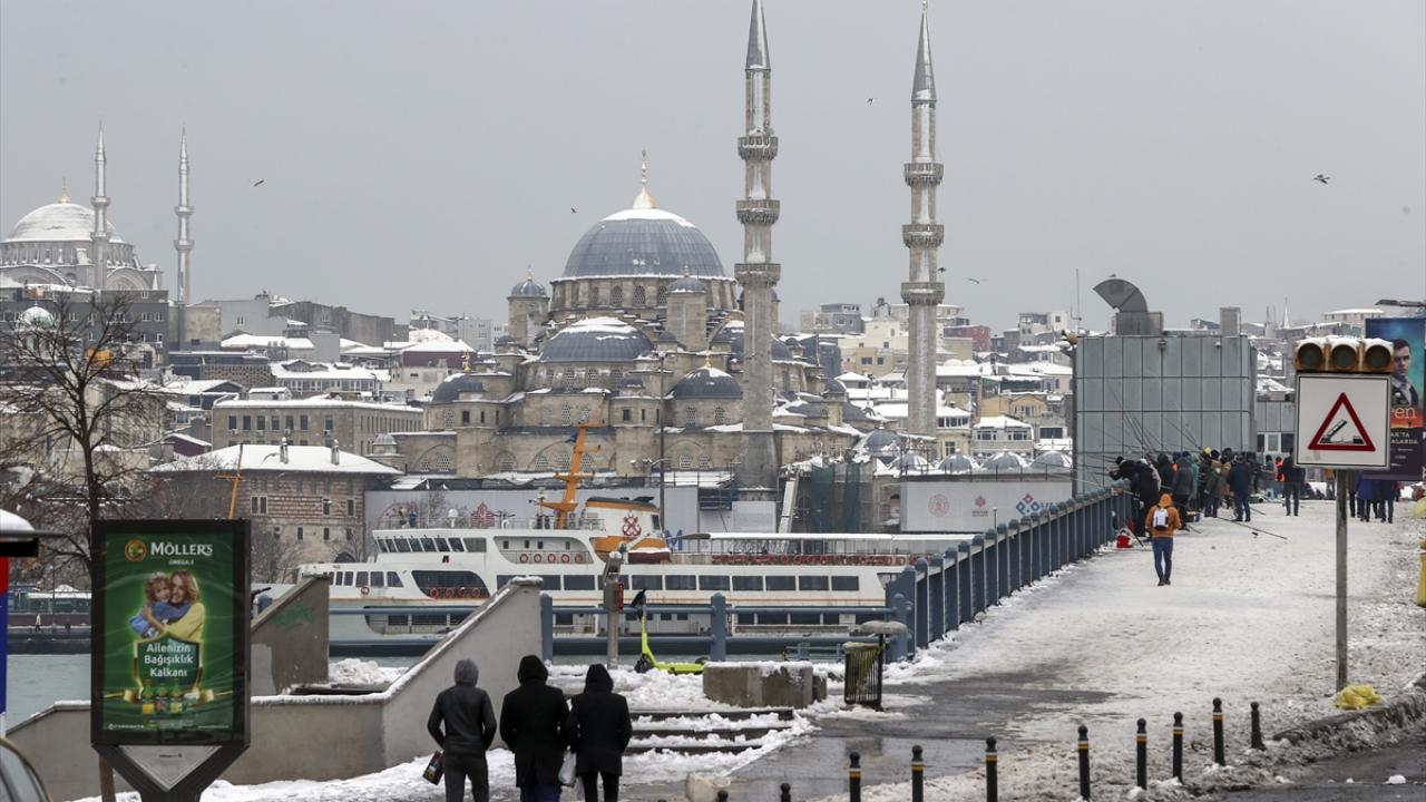 İstanbul`da 2 gün öce yoğun şekilde yağan kar yağışı sonrası Galata Köprüsü beyaz örtüyle kaplandı.