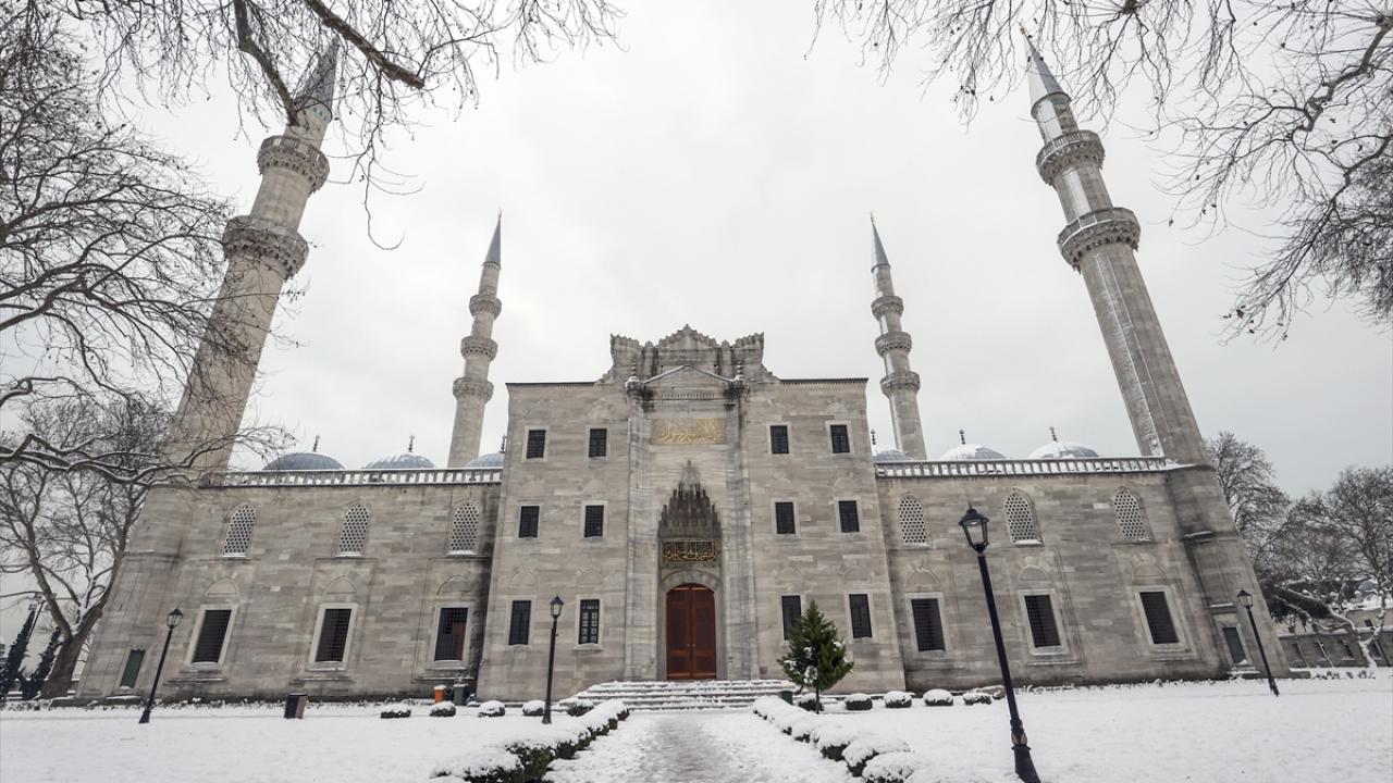 Süleymaniye Camisi`nin avlusu beyaz örtüyle kaplandı.