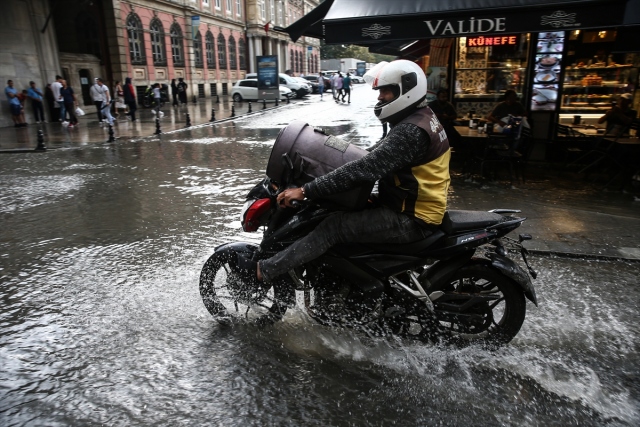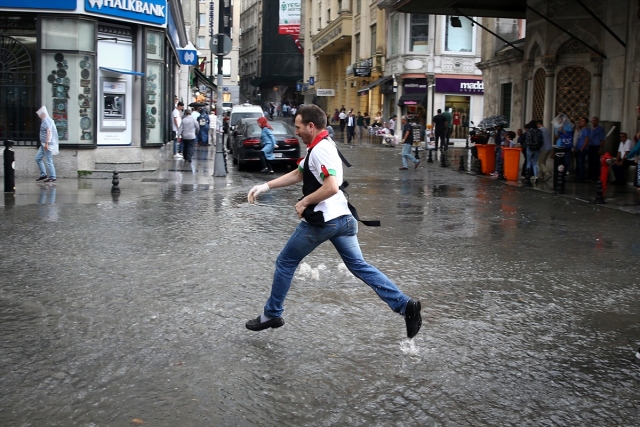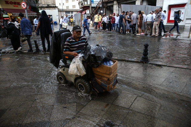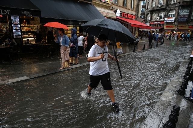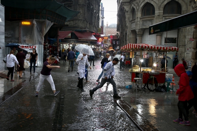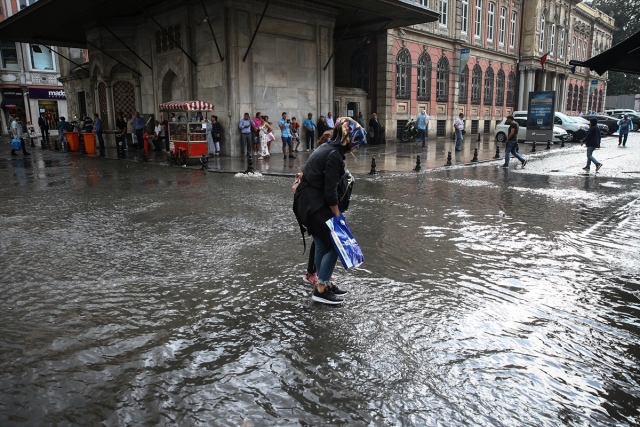 İstanbul'da etkili olan gök gürültülü sağanak yağış, hayatı olumsuz etkiledi. Eminönü'nde vatandaşlar biriken su nedeniyle yollarda yürümekte zorlandı.