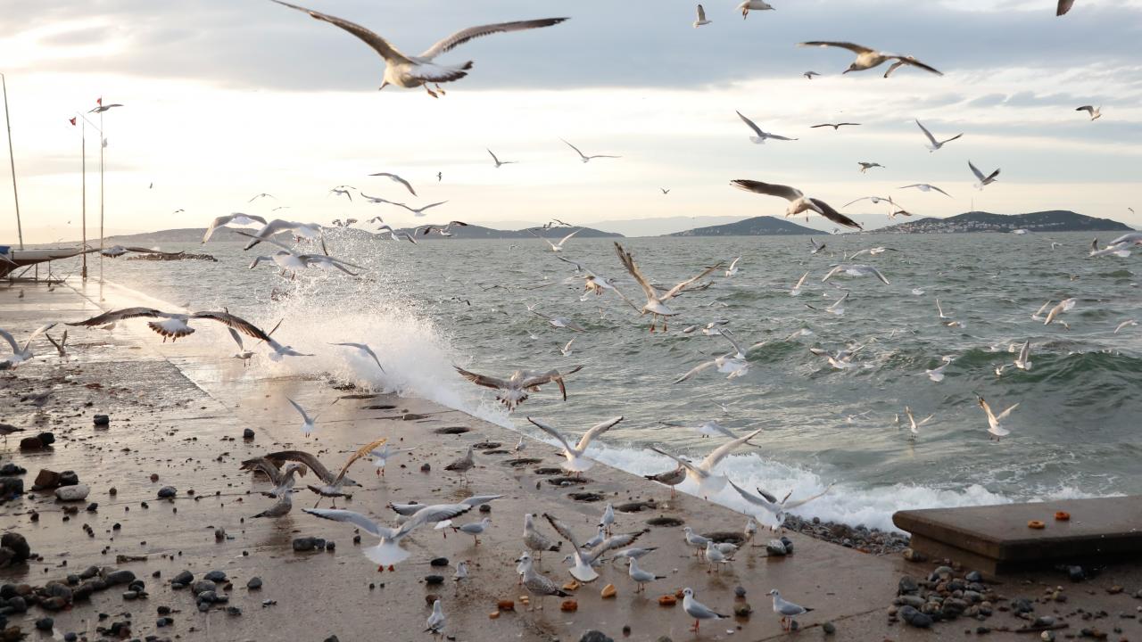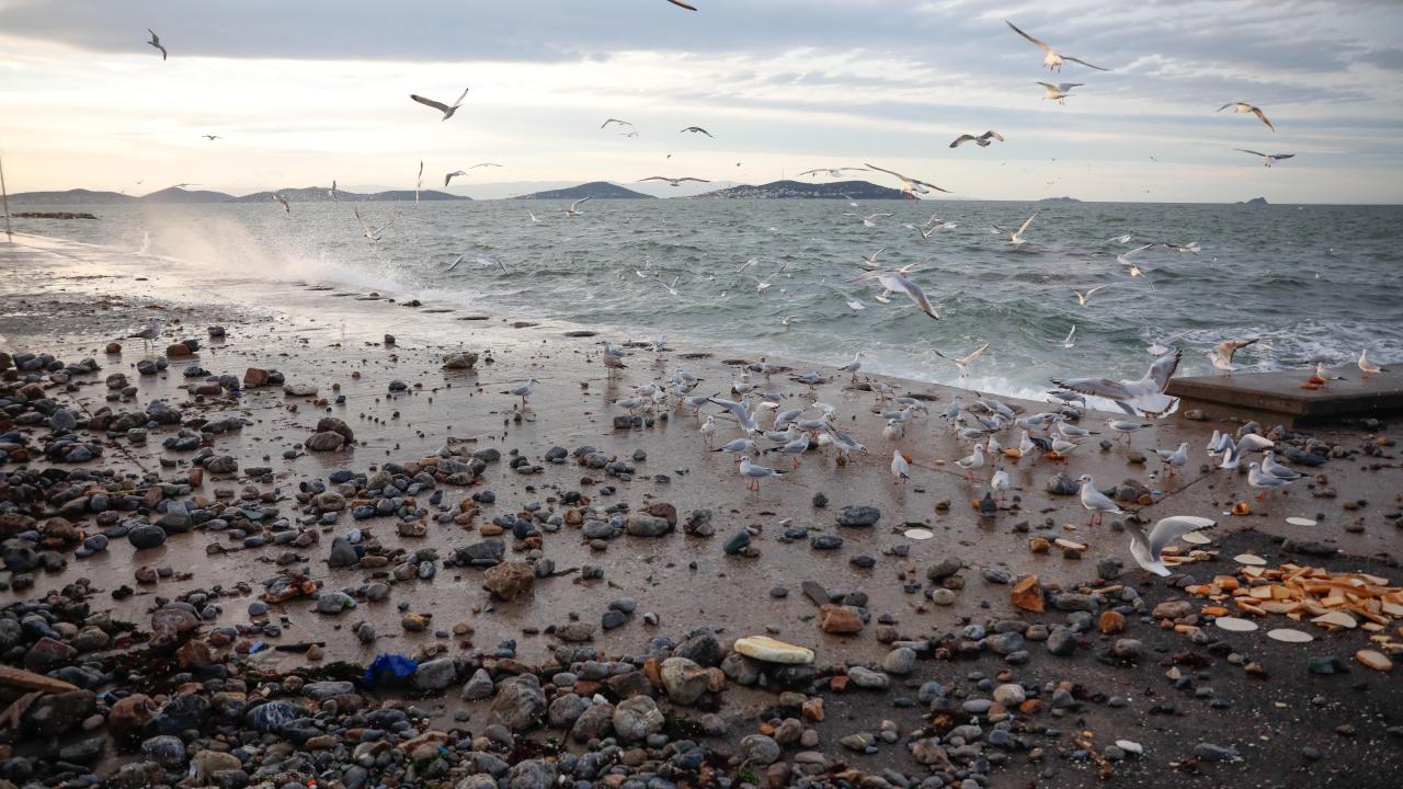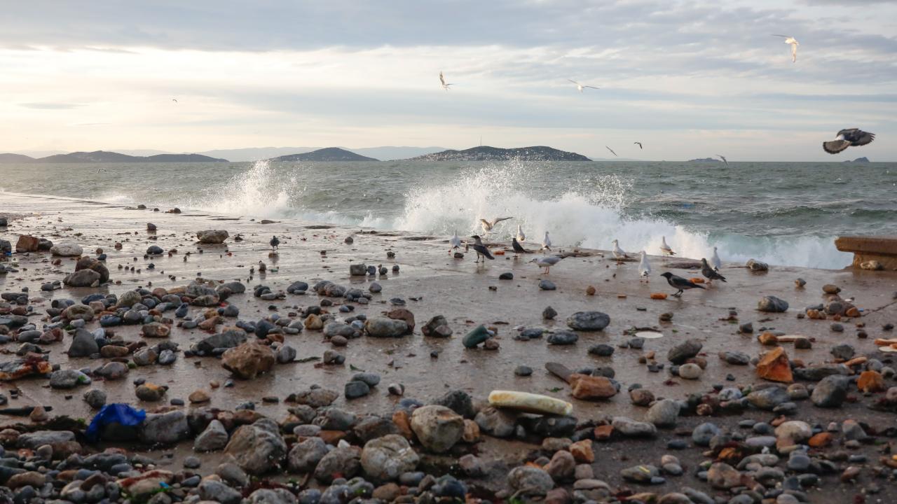 Dalgaların etkisi ile sahildeki taşlar kıyıya vurdu.
