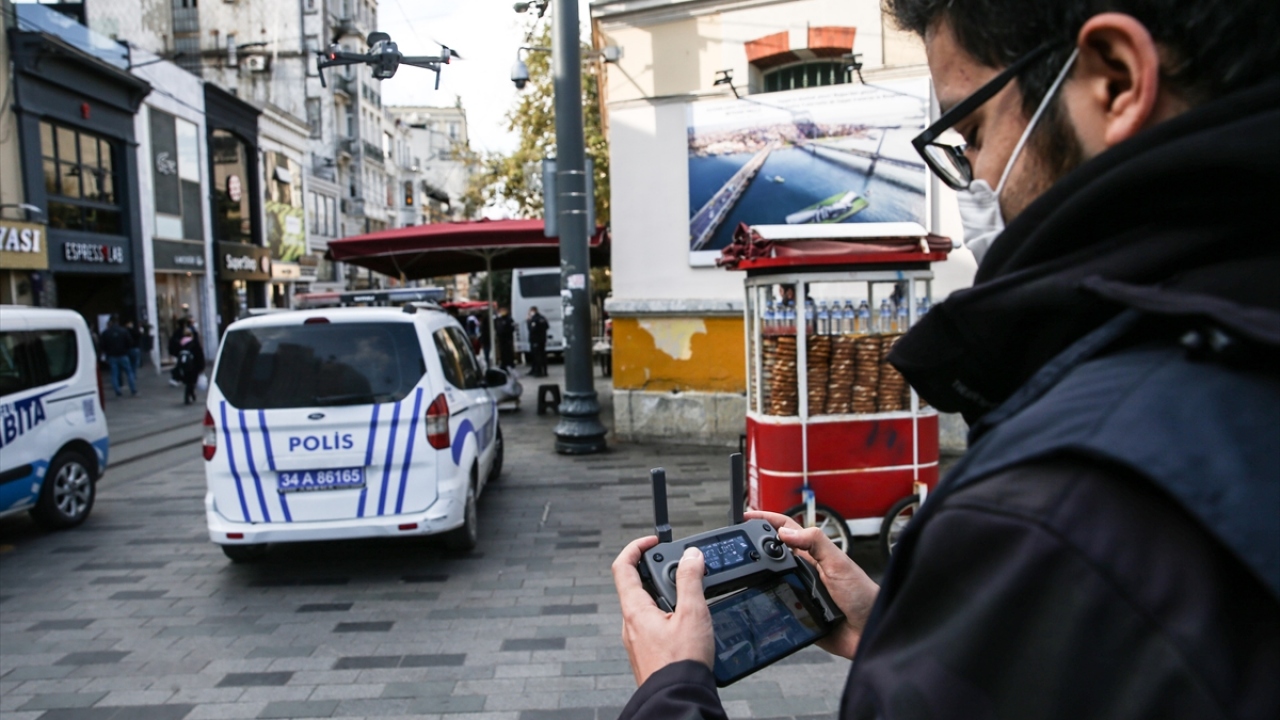 Beyoğlu İlçe Emniyet Müdürlüğü ve Turizm Şube Müdürlüğü ekipleri, Taksim Meydanı ve İstiklal Caddesi`nde drone kaldırarak Türkçe ve İngilizce anonslarla Kovid-19 tedbirlerine uyulması konusunda ikazda bulundu.