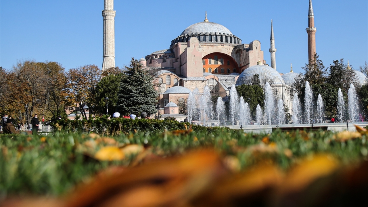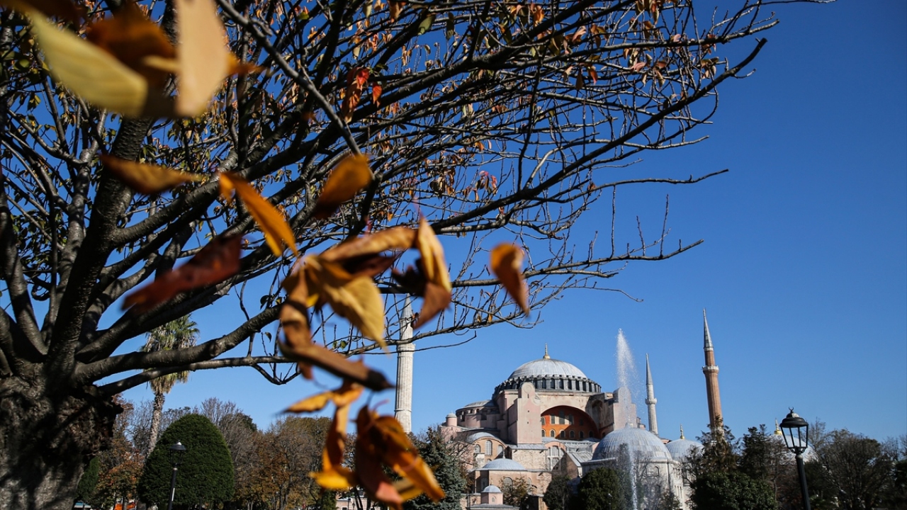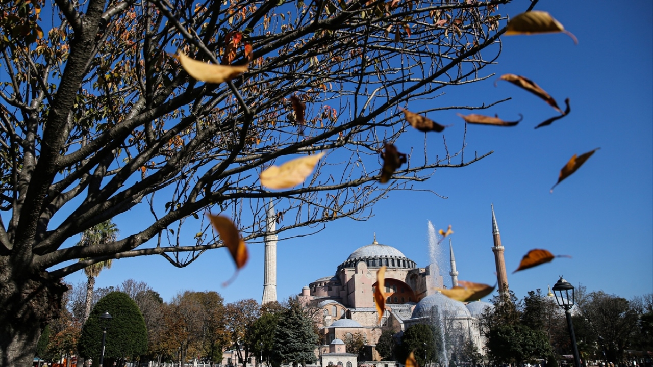 İstanbul'da sonbaharın gelişiyle birlikte ağaçların sararması Ayasofya Meydanı'nda güzel görüntü oluşturdu.