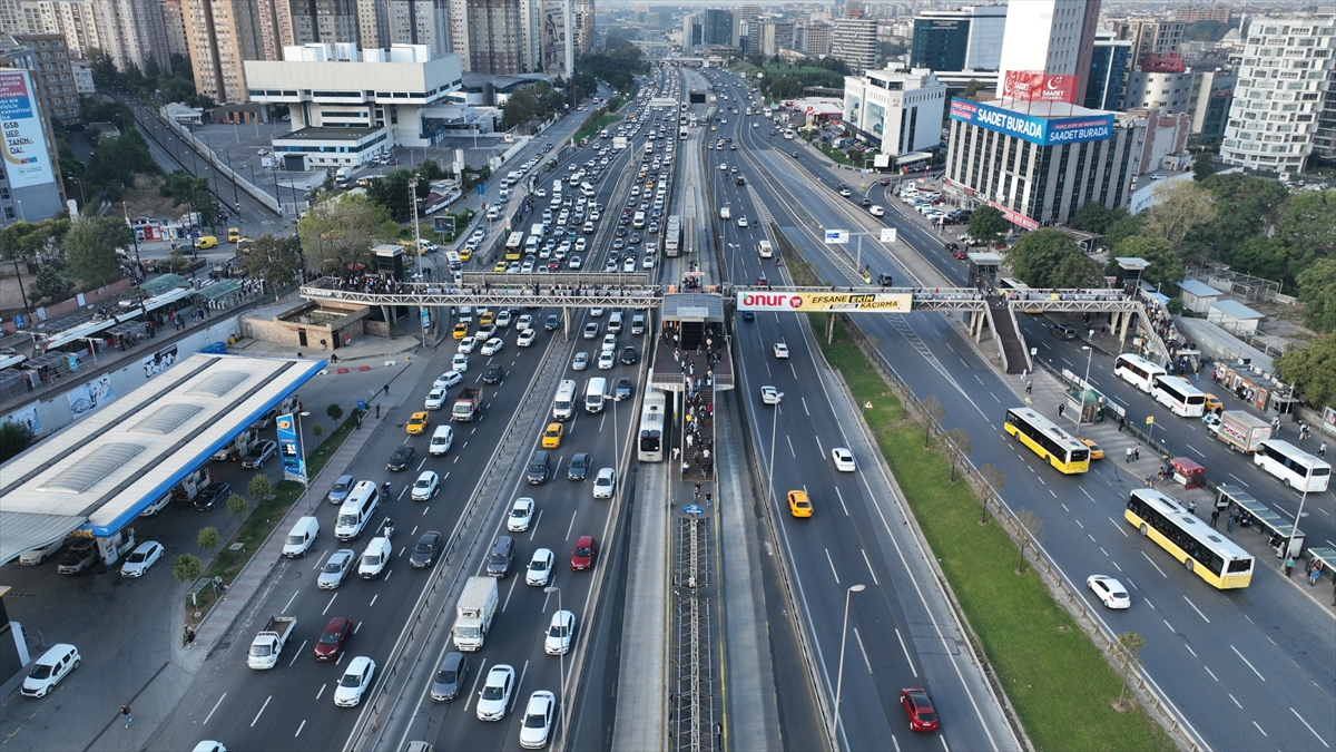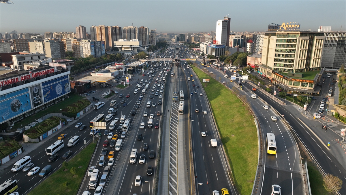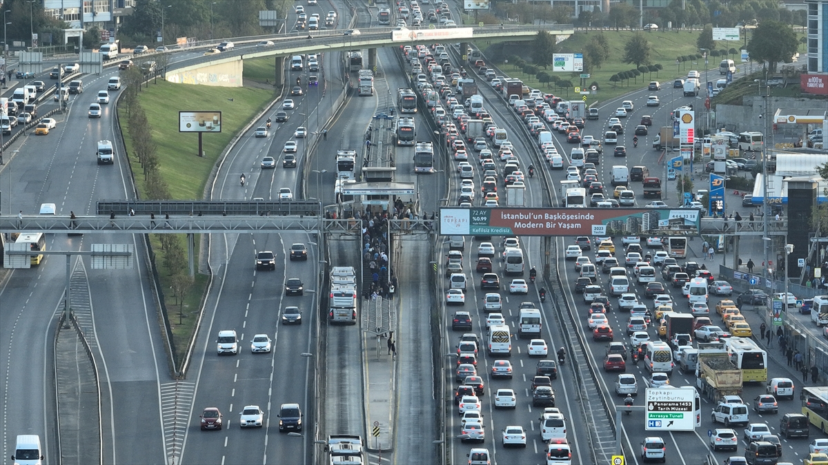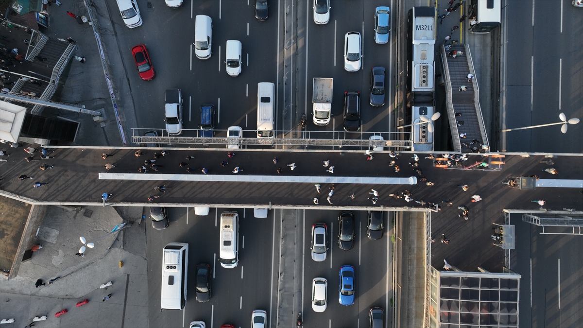 İstanbul'da sabah saatlerinde oluşan trafik yoğunluğu, Zeytinburnu Cevizlibağ mevkiinde dronla görüntülendi.