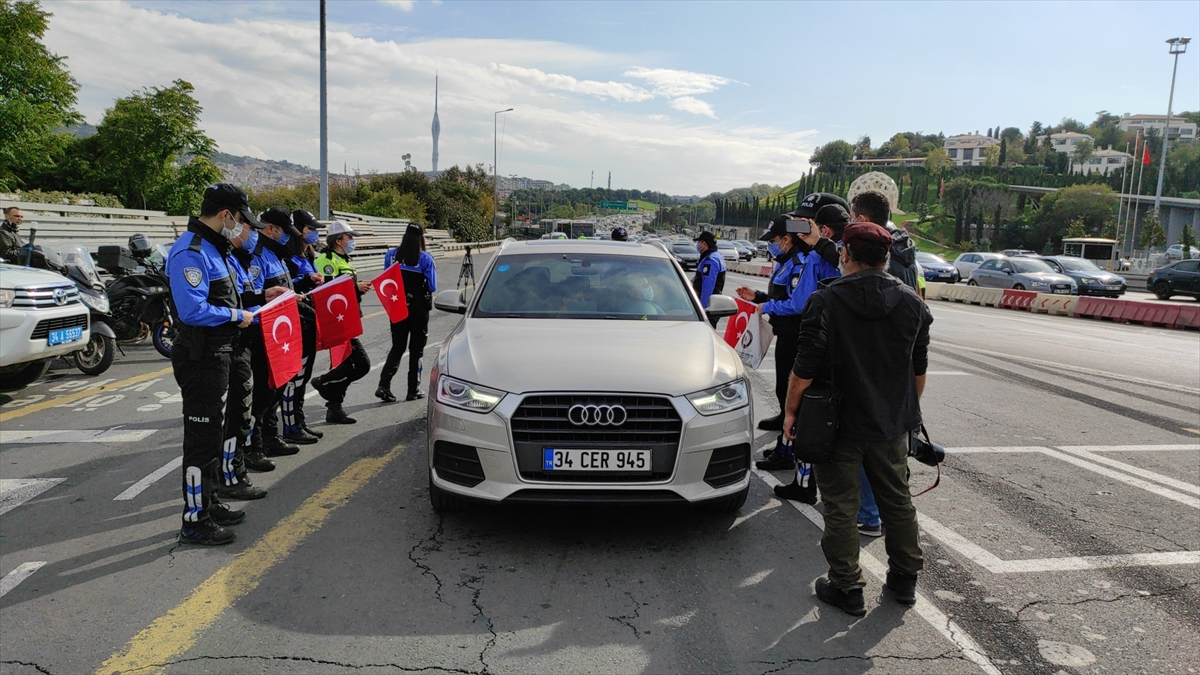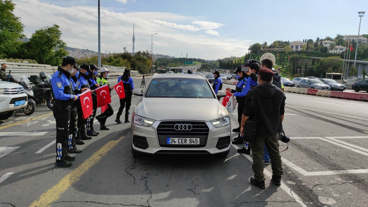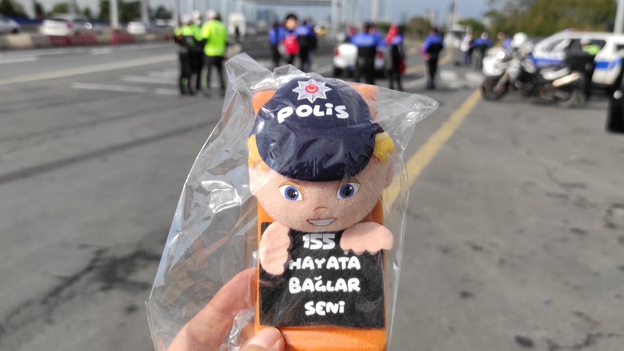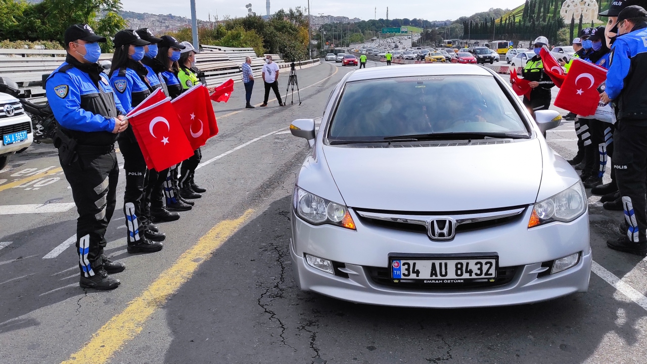 Cumhuriyet Bayramı dolayısıyla 15 Temmuz Şehitler Köprüsü'nün girişinde uygulama yapan polis ekipleri, sürücülere Türk bayrağı, çocuklara ise emniyet kemeri aparatı hediye etti