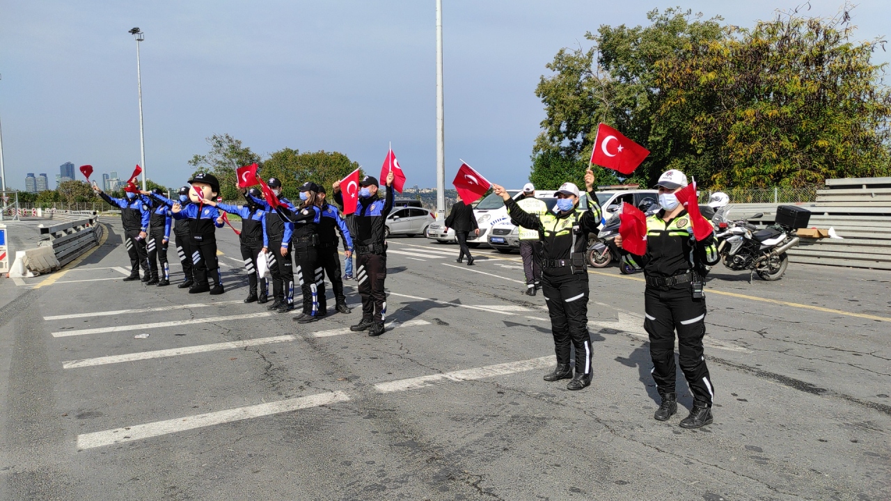 İstanbul Emniyet Müdürlüğü Toplum Destekli Polislik Şube Müdürlüğü ve Trafik Denetleme Şube Müdürlüğü ekipleri, 29 Ekim Cumhuriyet Bayramı`nda 15 Temmuz Şehitler Köprüsü`nün girişinde uygulama yaptı.