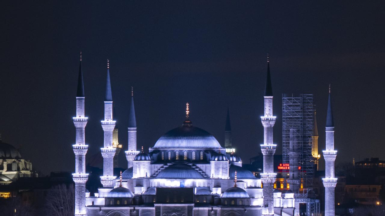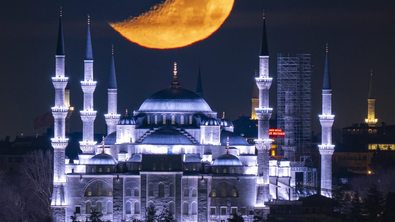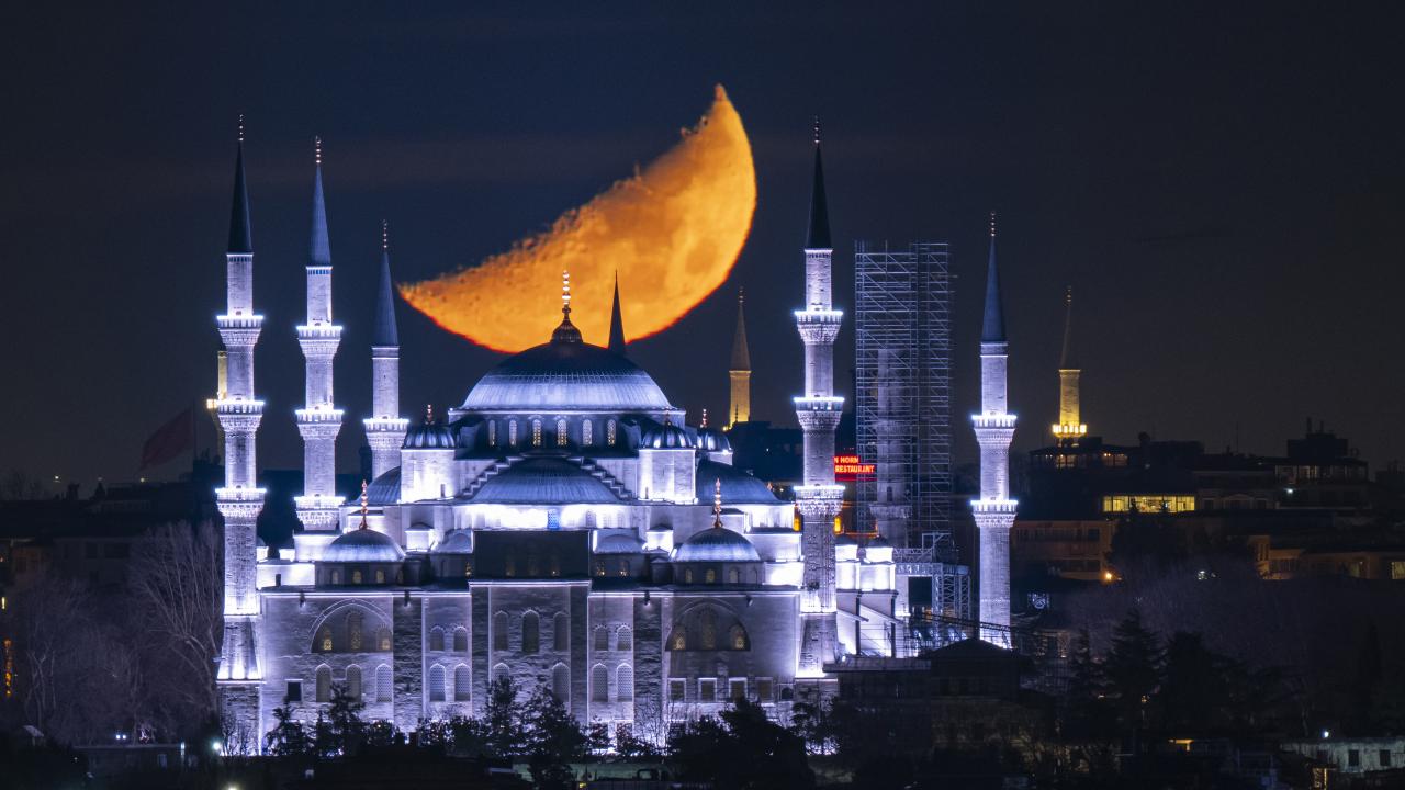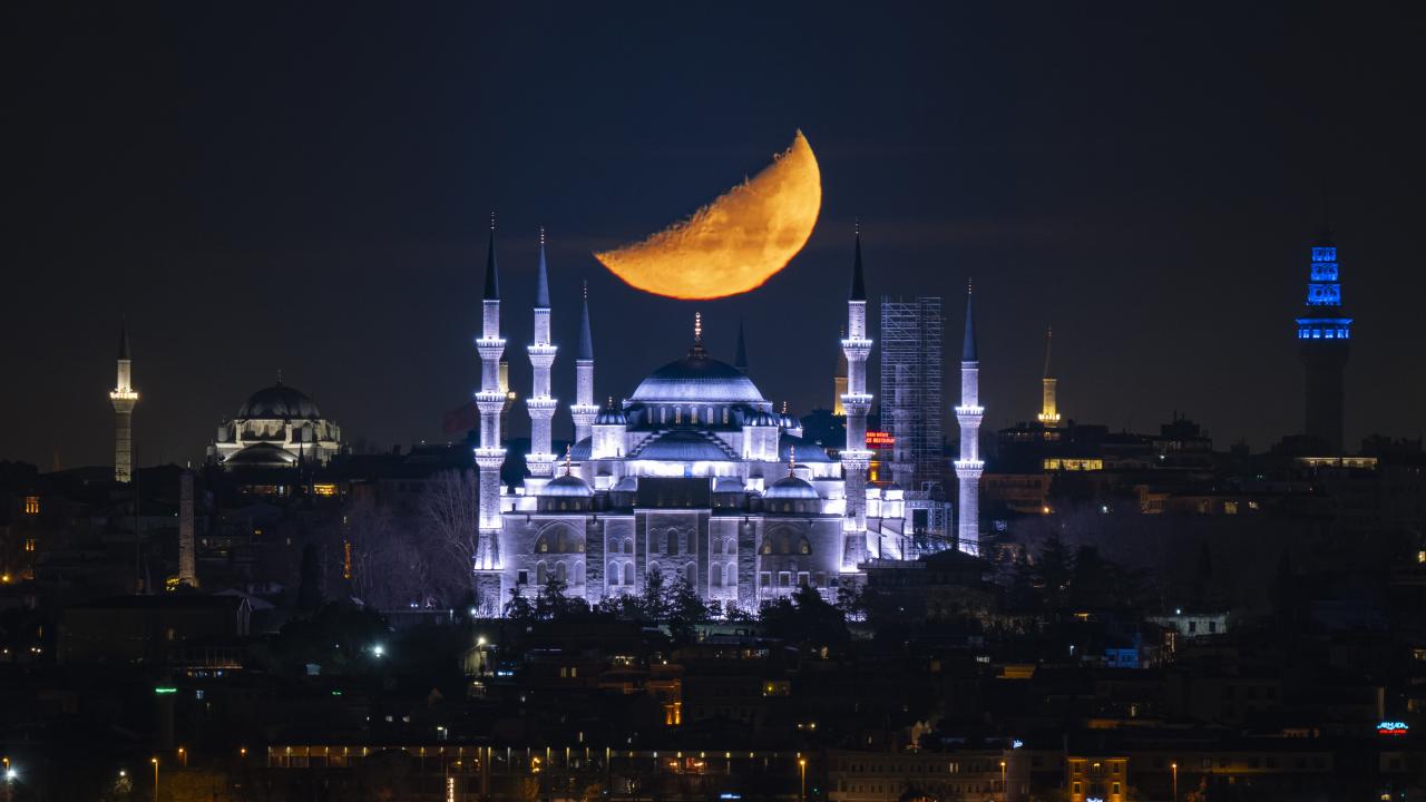 İstanbul'da yarım Ay, Sultanahmet Camii ile birlikte görüntülendi.